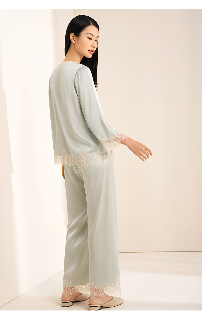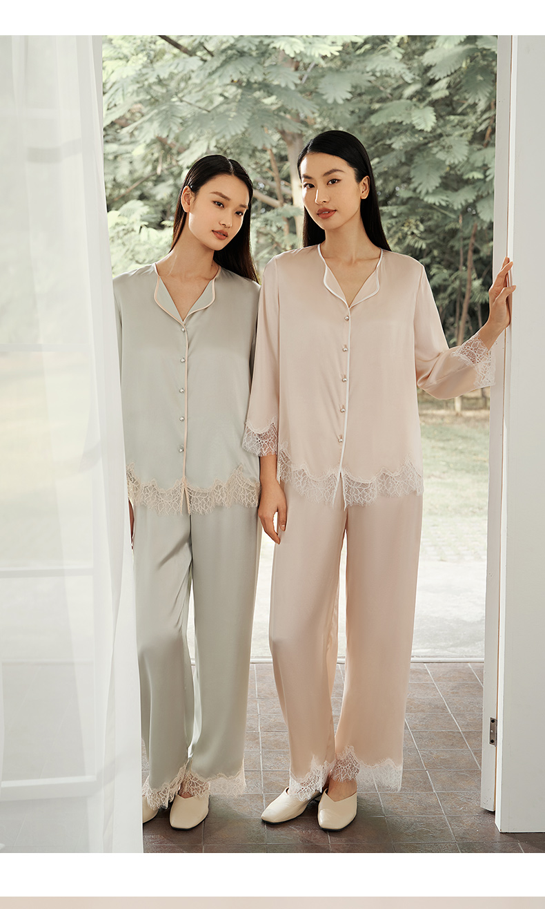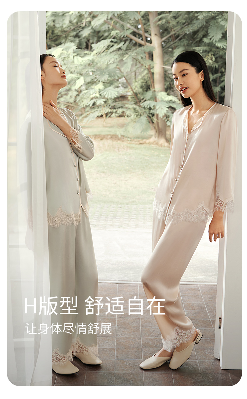 金三塔真丝睡衣女100%桑蚕丝复古蕾丝拼接宽松舒适长袖家居服套装(限价款) YSFEA207