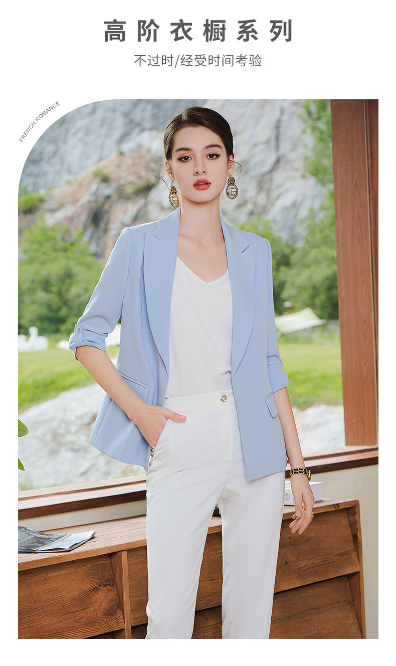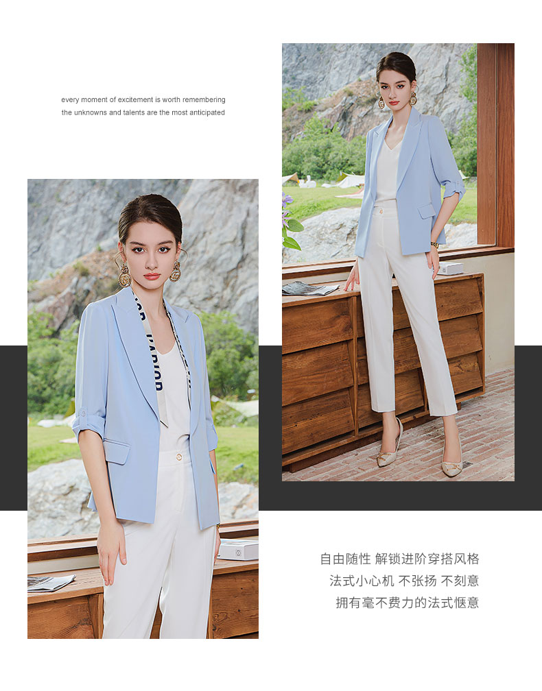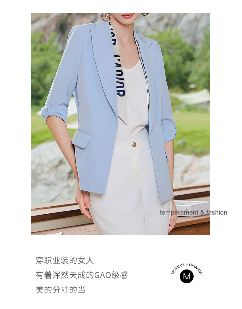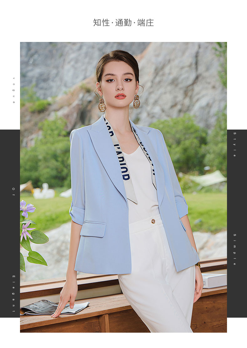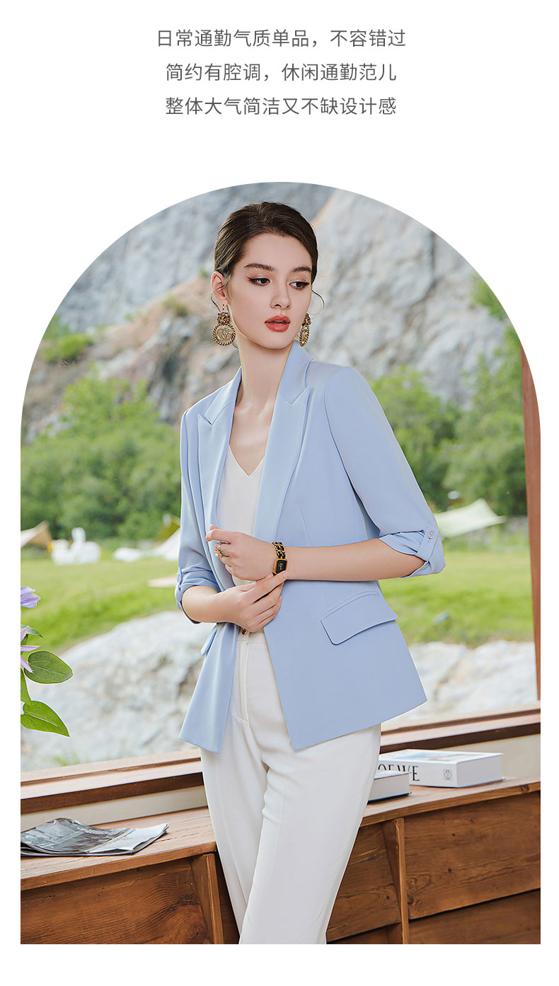 AD气质蓝色西装套装女抽褶七分袖西服外套2023夏季薄款通勤职业装