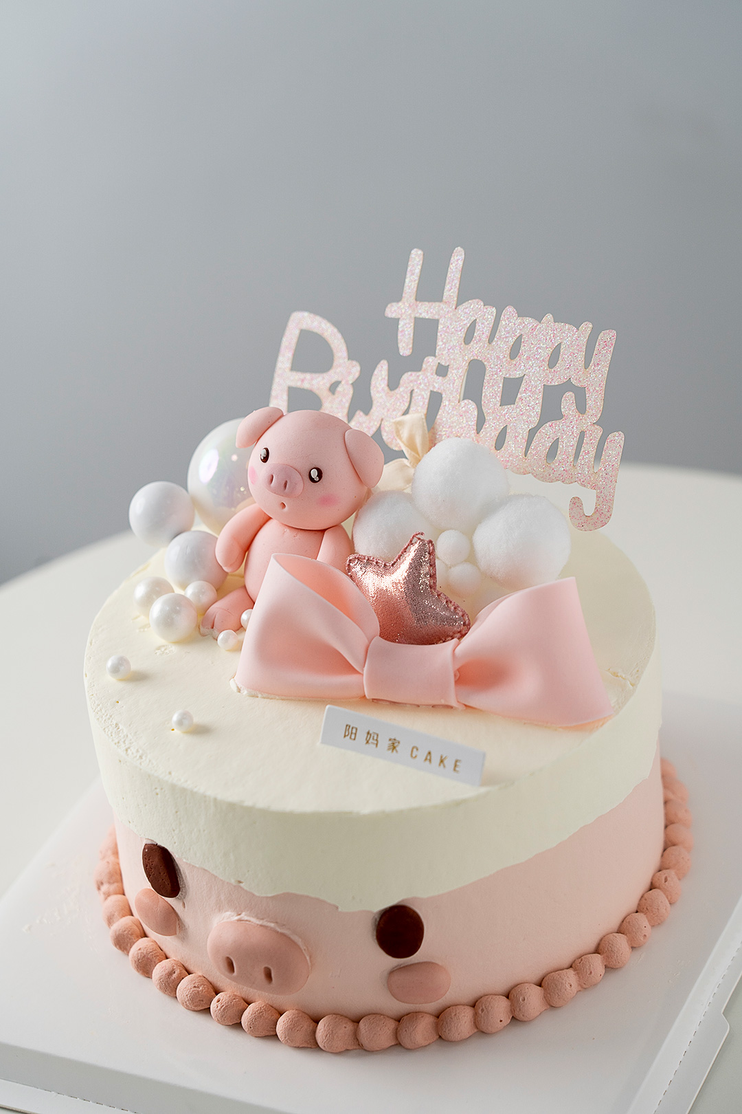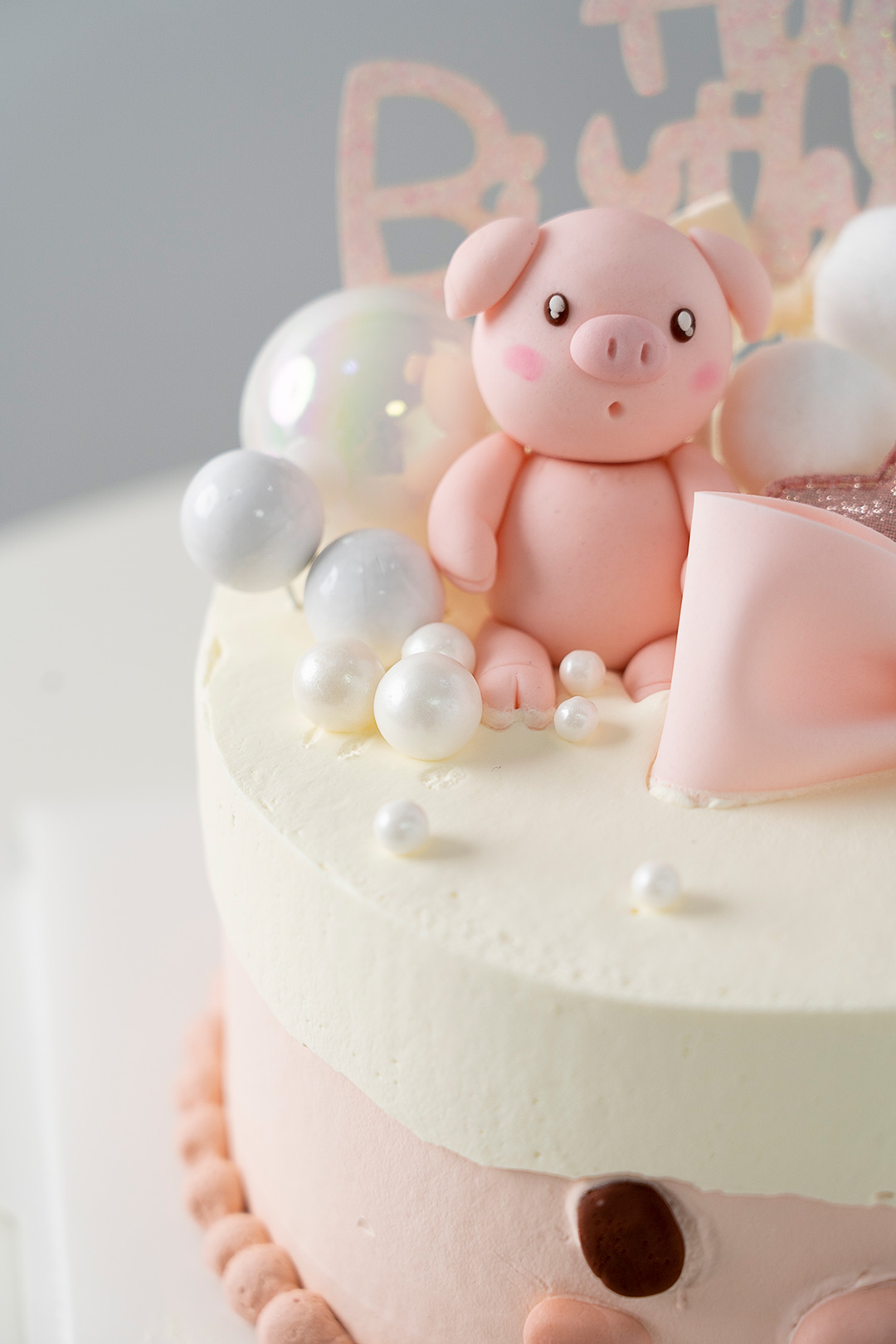 蛋糕上的小猪和蝴蝶结是翻糖制作,可食用。