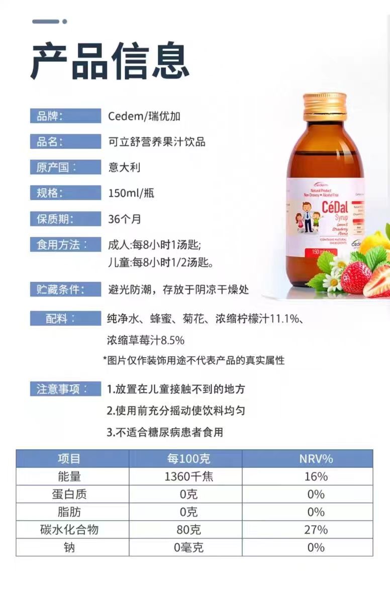 【正品源码】可立舒cedem 营养瑞优加果汁饮品天然儿童止咳营养液150ml(新包装)