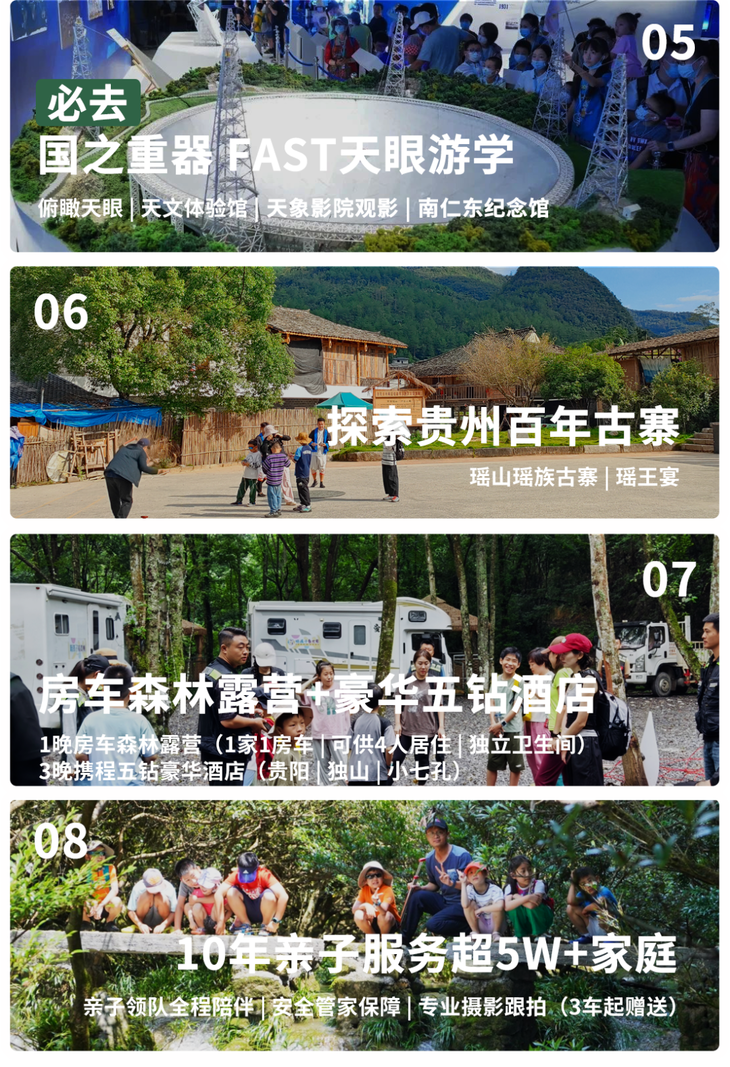 体验:参观世界最大的单口径射电望远镜、参观天文体验馆、天象影院观影、南仁东纪念馆、瑶山古寨、VIP包场地心洞穴探险4H(年龄限制:5岁起)、营地露天电影、勇士之路森林徒步、悬崖咖啡等行程所涉及体验费用