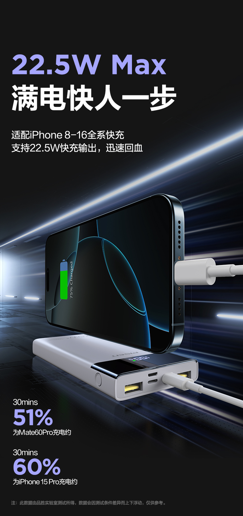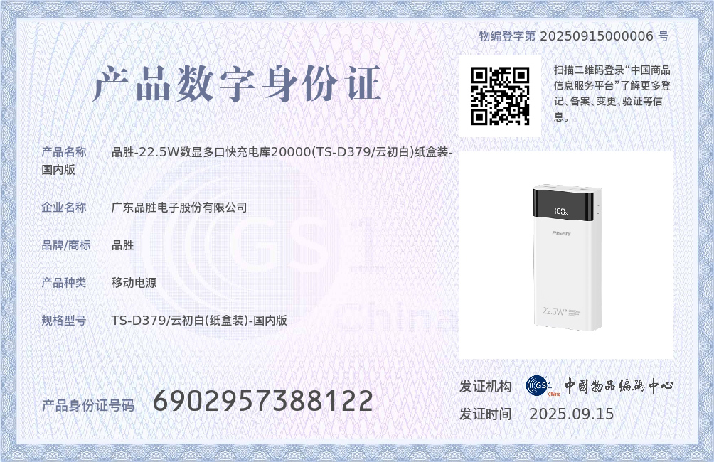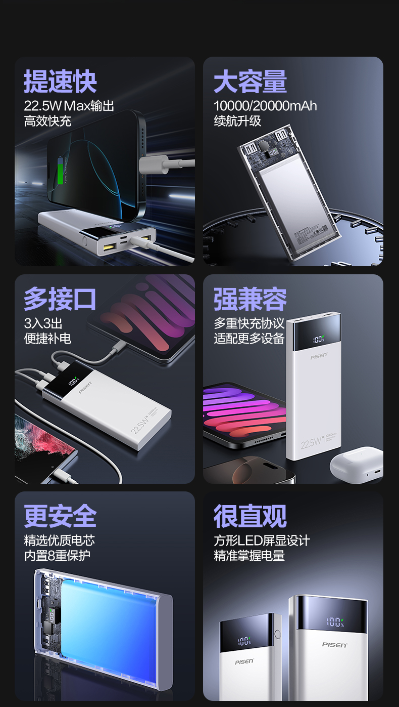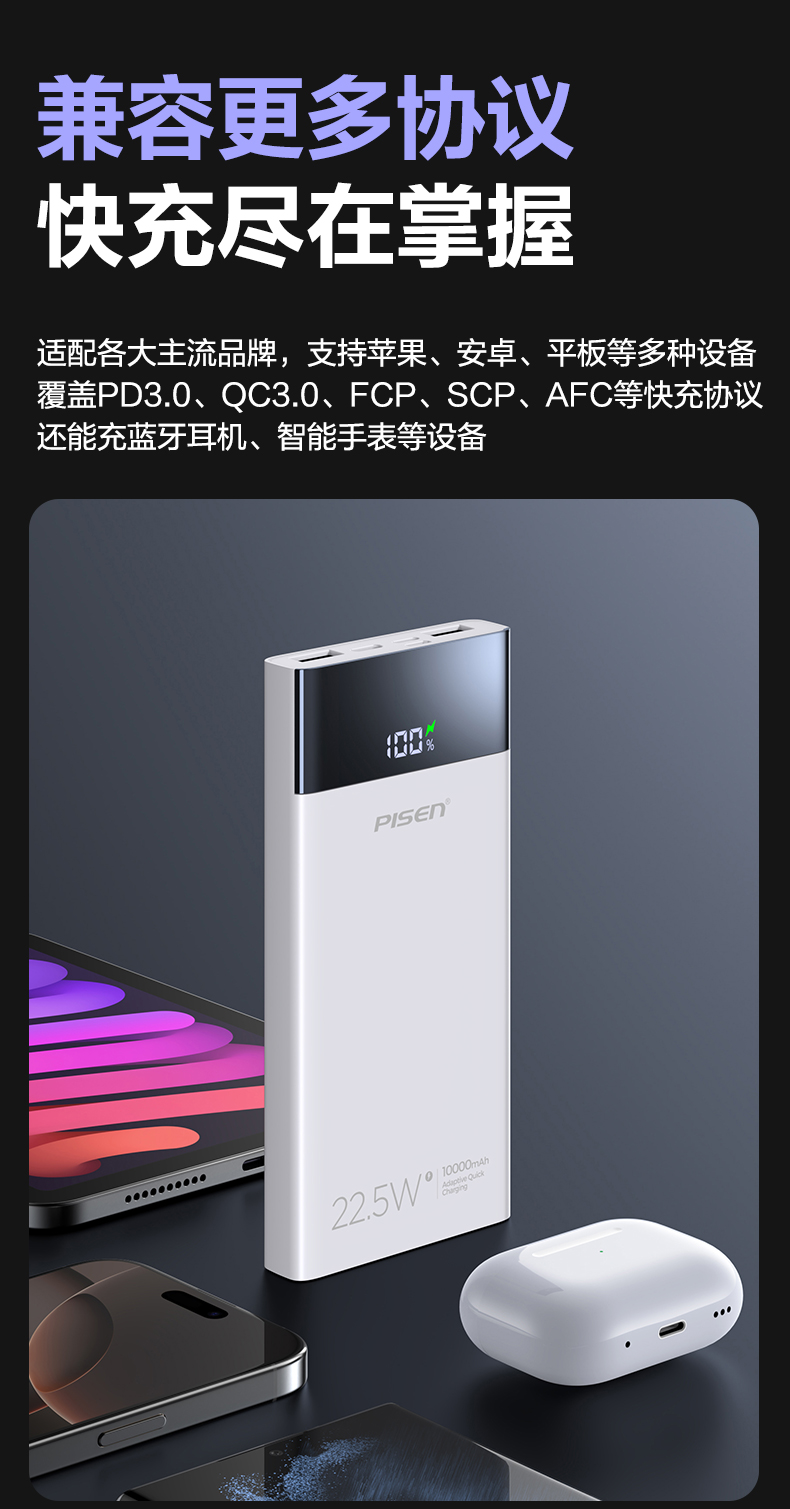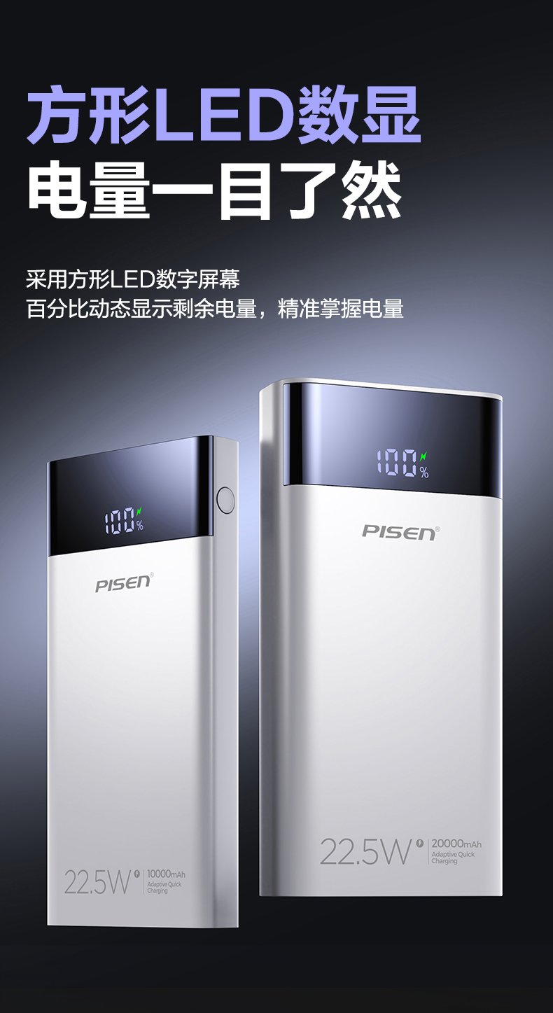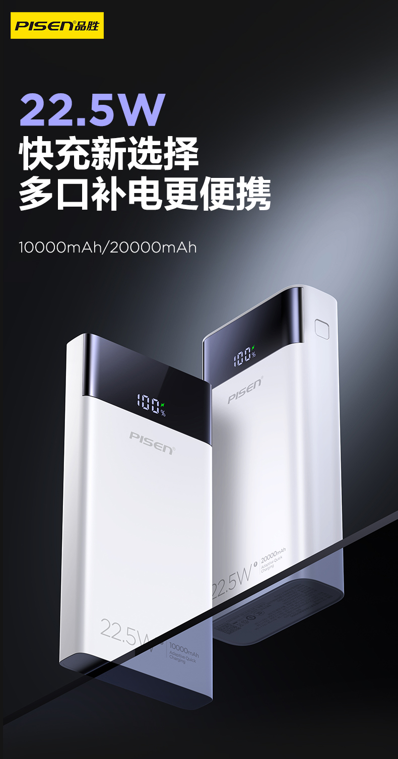 品胜 22.5W数显多口快充电库10000/20000毫安 LED显示屏支持iPhone 8-16充电移动电源