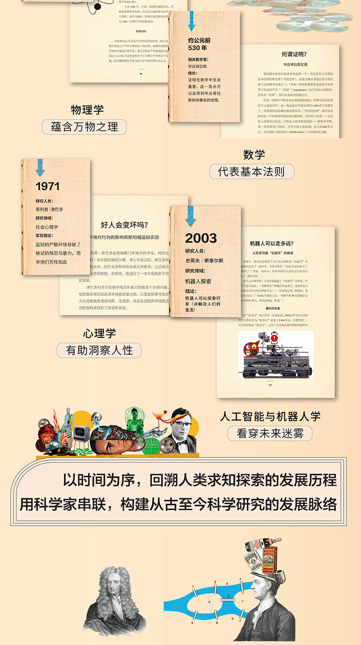 本系列从科学史的角度,按时间顺序,用通俗易懂的语言,分别介绍了从20000年前至今的数学发现、物理实验、机器人与人工智能的发明以及心理实验;梳理了这4个与人类社会演化紧密相关的领域的发展脉络的同时,清楚解析了每一个发现、实验和发明的背景、过程、结论、意义与历史影响。在本系列中你会看到从古至今的科学家们如何通过巧妙的逻辑构思和实验设计,解答这些对历史发展影响深远且关乎人类本质的问题:如何称出这个世界的质量?怎样利用核物理知识造出原子弹?你会坚持你认为正确的理论吗?哪怕许多人说你是错的?医生能分辨出;真假精神病吗?为什么1分钟有60秒、1小时有60分?猴子多了就能写出莎士比亚吗?谁制造了架无人机?人工智能取代人类的概率有多大?不论你感兴趣的是数学、心理学、物理学还是人工智能和机器人学,本系列都能让你找到许多有趣且深具启发性的解答。