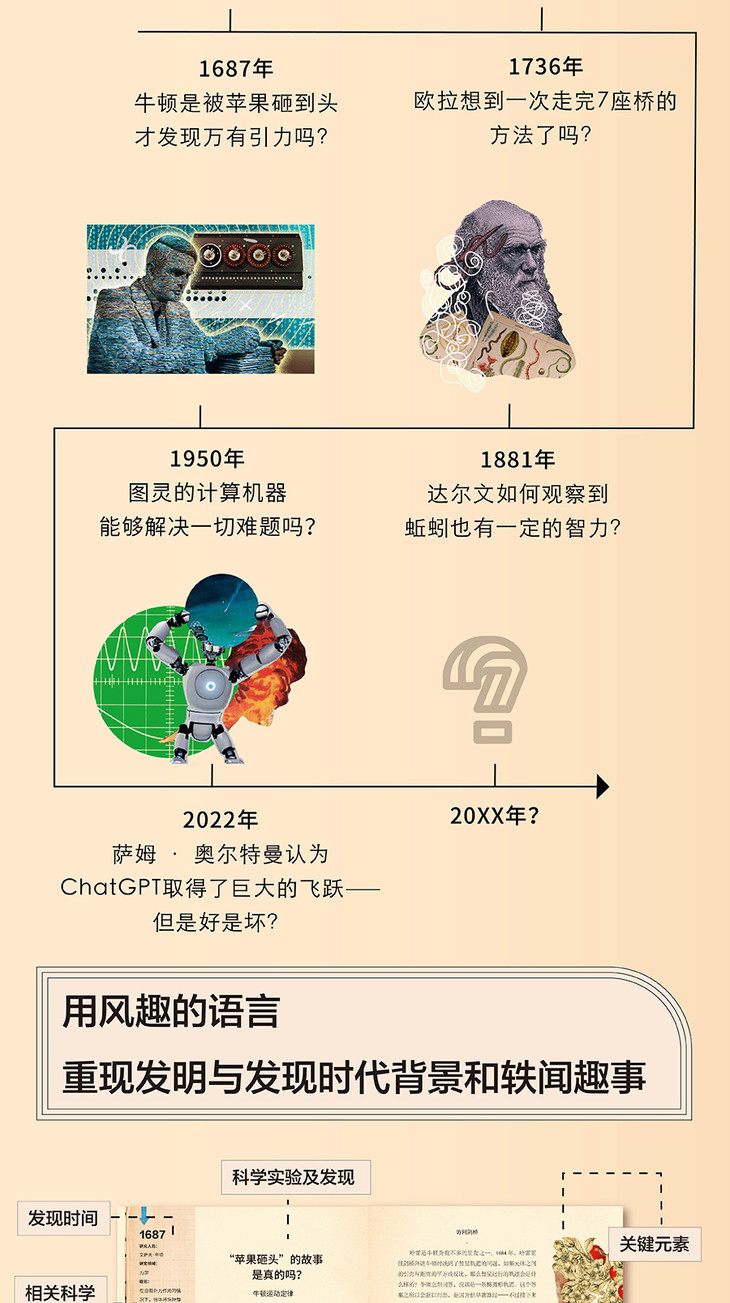 ★精选科学史上200个转折性发现与发明,快速了解它们的构想、摸索和实现过程,发现数学、心理学、物理学和人工智能与机器人学跟日常的紧密联系,原来人类社会是由这些科学技术支撑起来的:牛顿的苹果到底是不是真的故事?偏见是不是与生俱来的人性?天花板上的苍蝇启发了坐标系的诞生?ChatGPT能够掌控人类社会吗?