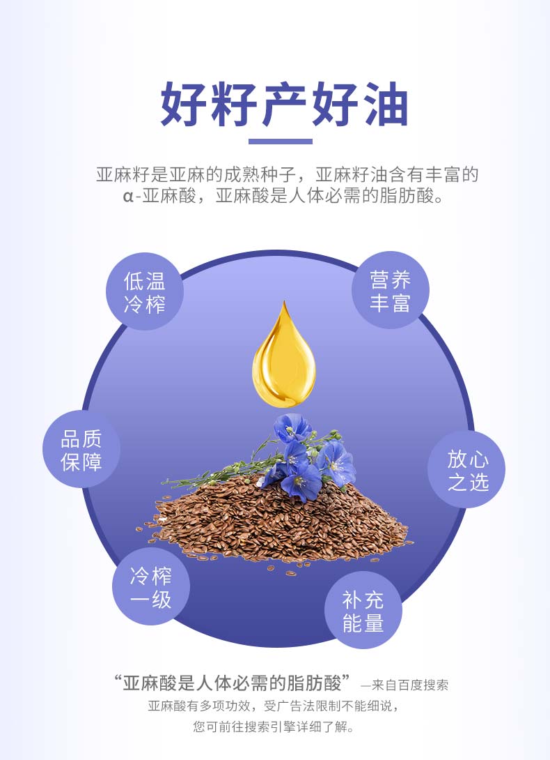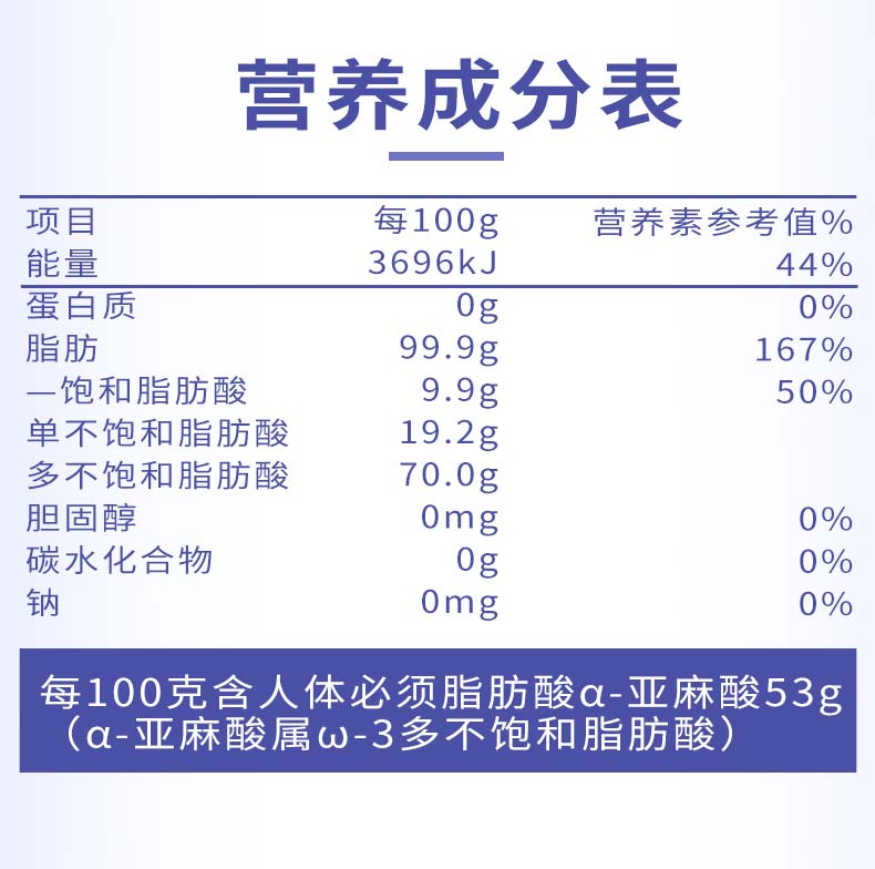 【温馨提示】食用方法:凉拌、煲汤、调味、烹饪;建议热锅凉油,减少亚麻酸挥发,不建议煎炸食用。可与酸奶1:10直接混合口服。