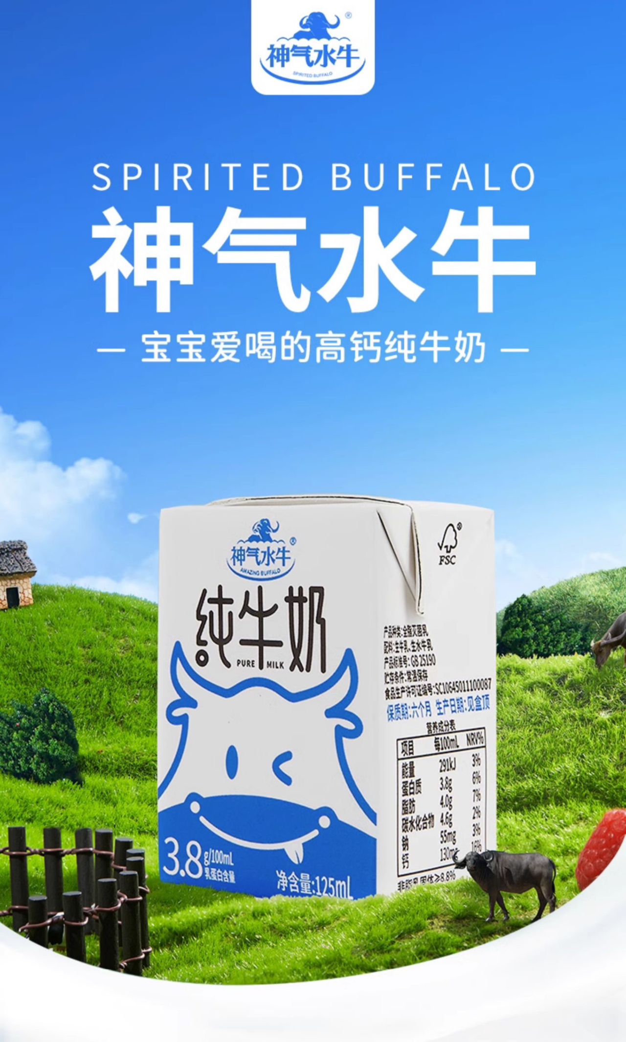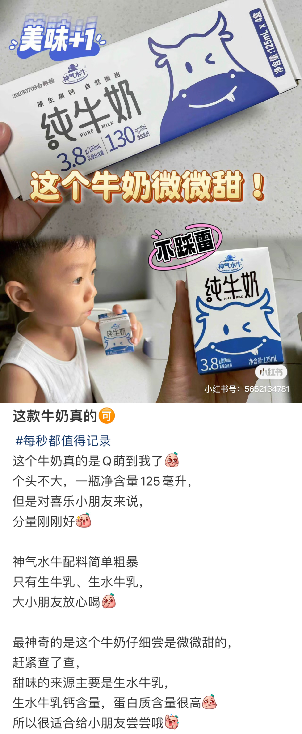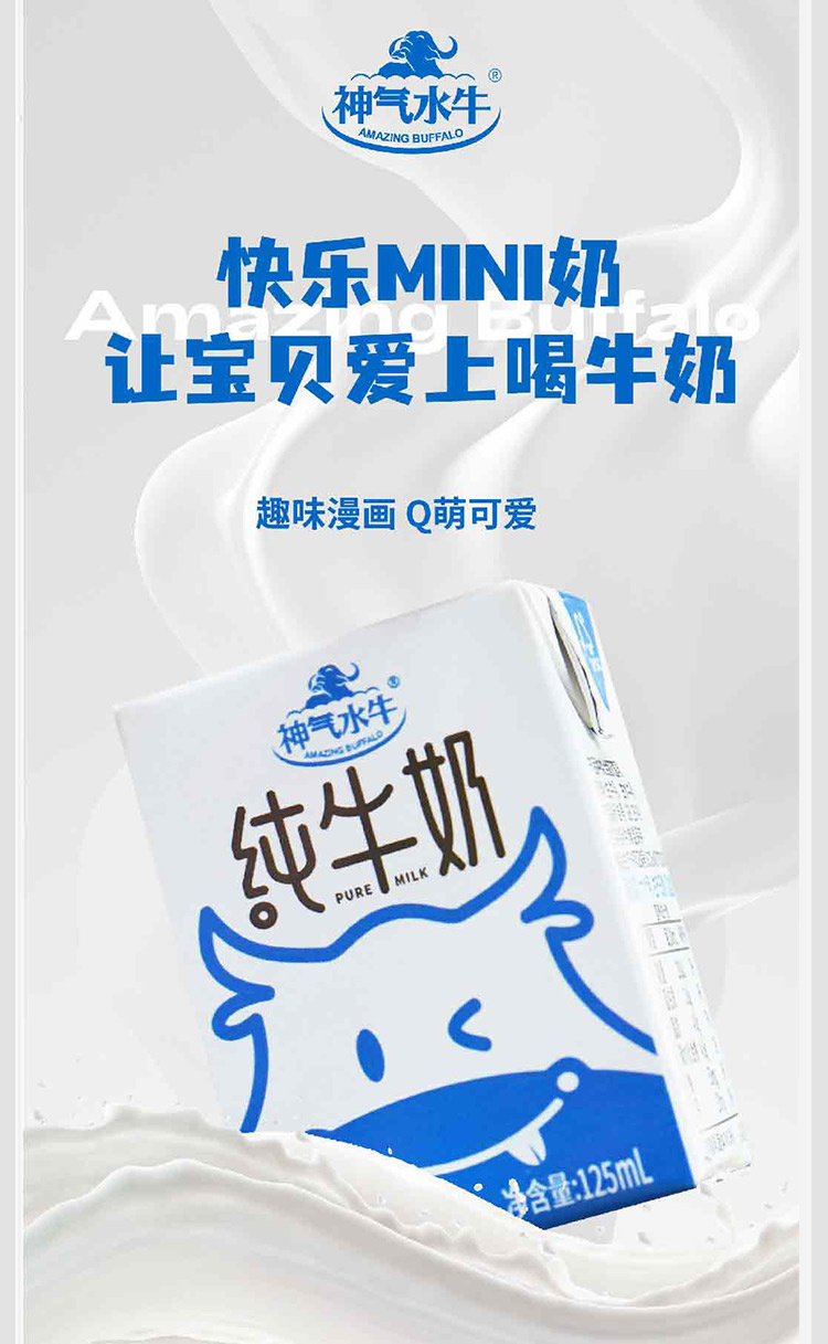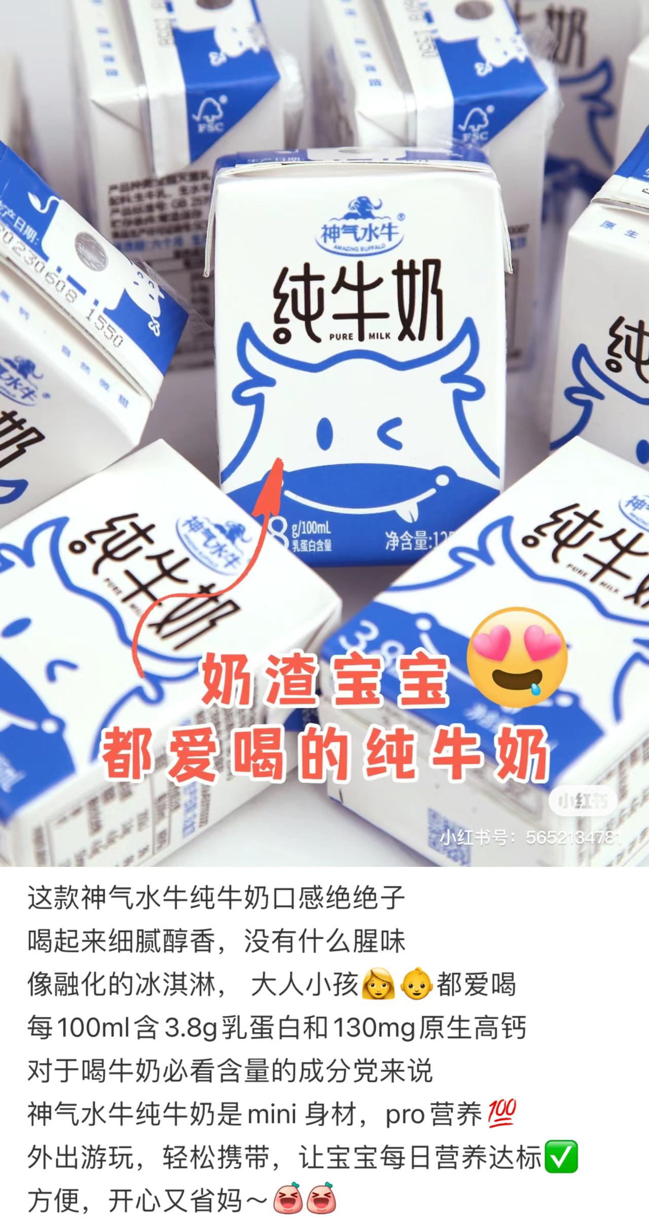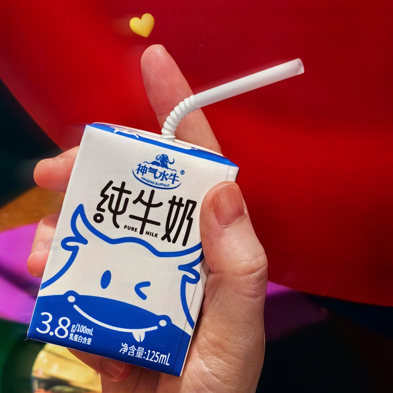 乳糖不耐的我,倒是上了不少牛奶了,主要是小时候没什么条件喝,一定要给现在的小朋友安排上!肉蛋奶,真长个!中国居民膳食指南建议,孩子 1 岁起,就可以尝试加入纯牛奶,并且可以根据孩子的接受情况逐渐替代母乳配方粉,成为钙和蛋白质的重要来源。但是给孩子喝的牛奶,一定要看清包装配料表,必须是生牛乳,不要选“乳饮料”或“蛋白饮料”之类,这点很重要!今天的神气水牛,味道和百菲酪很接近,但有很可爱的mini装,很适合小宝宝,不会浪费!