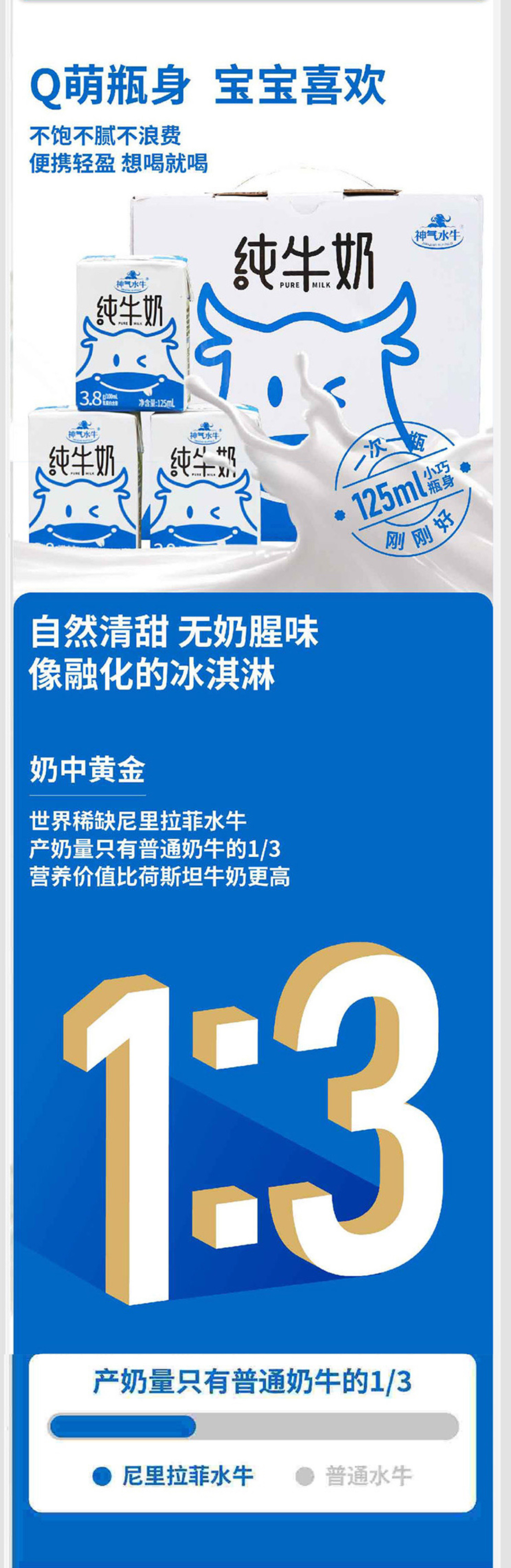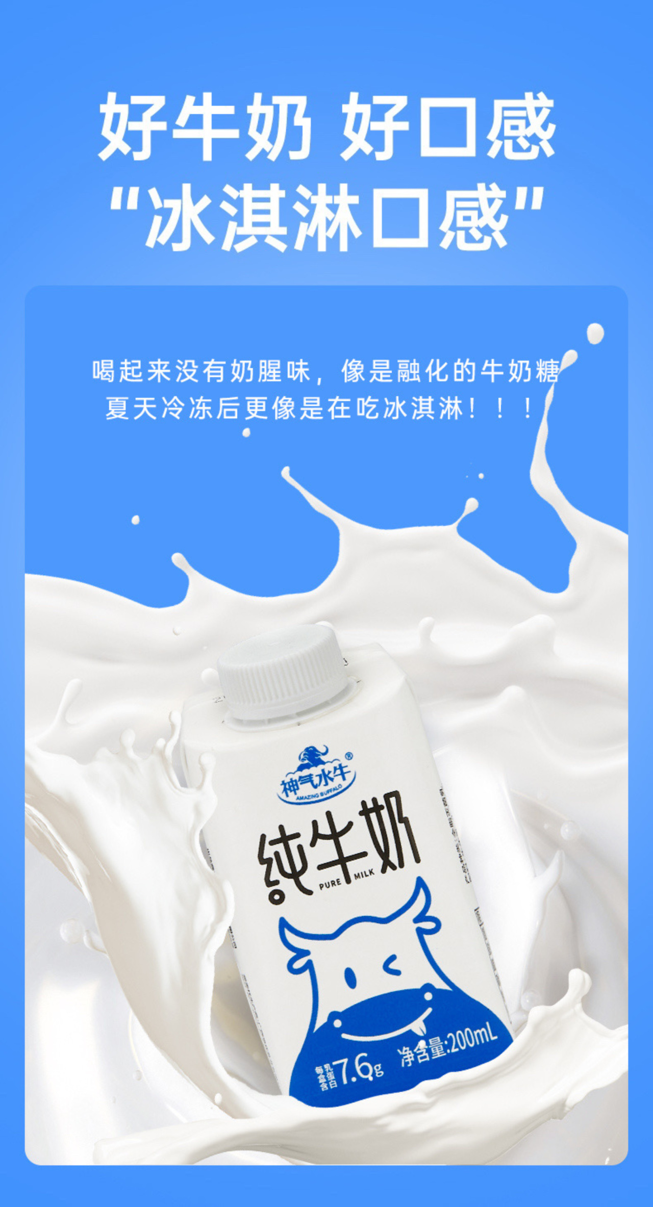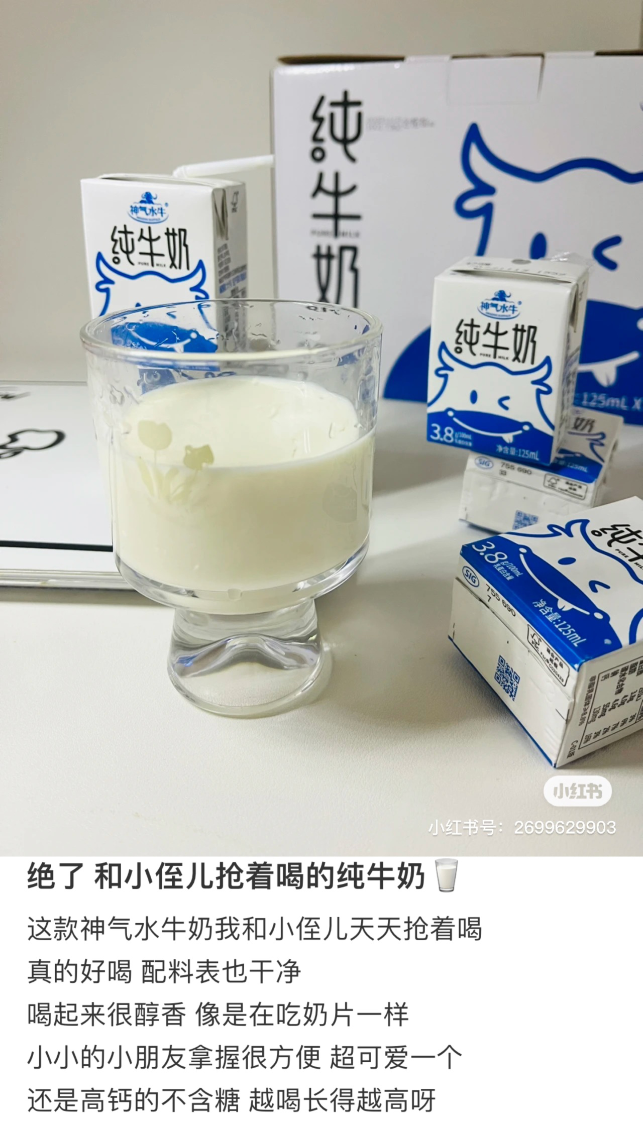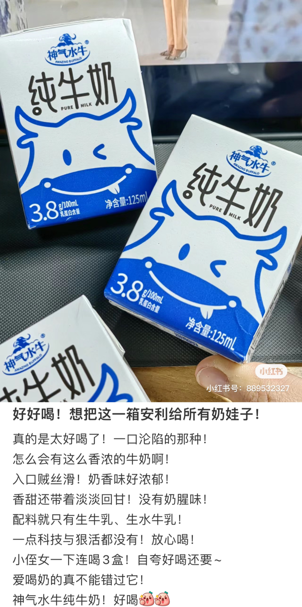 乳糖不耐的我,倒是上了不少牛奶了,主要是小时候没什么条件喝,一定要给现在的小朋友安排上!肉蛋奶,真长个!中国居民膳食指南建议,孩子 1 岁起,就可以尝试加入纯牛奶,并且可以根据孩子的接受情况逐渐替代母乳配方粉,成为钙和蛋白质的重要来源。但是给孩子喝的牛奶,一定要看清包装配料表,必须是生牛乳,不要选“乳饮料”或“蛋白饮料”之类,这点很重要!今天的神气水牛,味道和百菲酪很接近,但有很可爱的mini装,很适合小宝宝,不会浪费!
