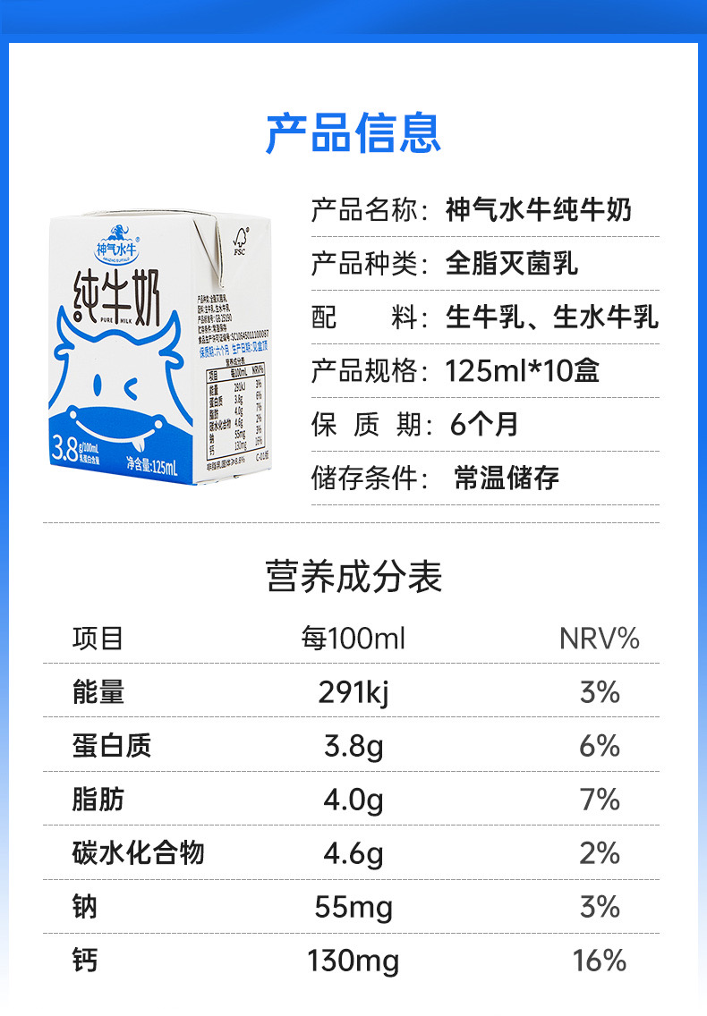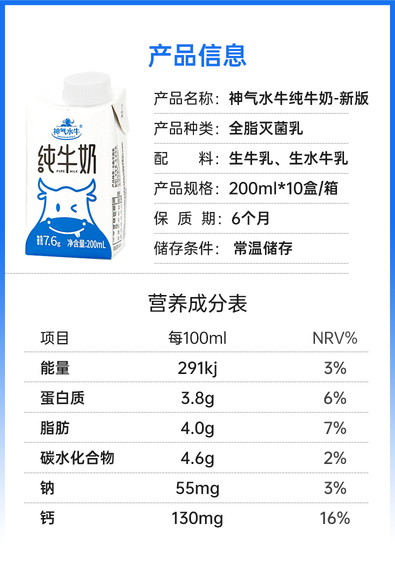 神气水牛有做2个规格。mini版的125ml,孩子一次喝完刚刚好,不浪费也不占肚子,营养密度还高;旋盖款的200ml,大宝宝和成人的容量,泡咖啡也刚好。配料表干干净净,就是生牛乳和生水牛乳,家中老小都可以放心大胆的喝!