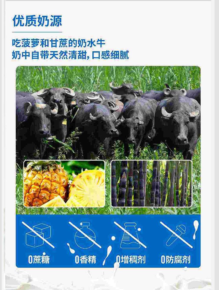 其实,牛奶和牛奶之间的味道,差别还蛮大的,我自己就很挑,孩子的味觉比成年人更加敏感,不爱喝奶,很可能是因为真的不好喝。神气水牛的水牛奶,选用的是尼里拉菲牛(尼里水牛),产奶量稀少,一天只有 10-20 斤,是普通黑白花奶牛的三分之一,属于珍稀奶源。而这种奶牛在出生时耳朵上就会被打上耳标,记录它的成长过程和产销履历 ,使得奶源安全“可追溯”。更特别的是,这里的水牛吃的是当地盛产的甘蔗、菠萝,因此产出的奶在没有添加任何糖和甜味剂的情况下自然甘甜!