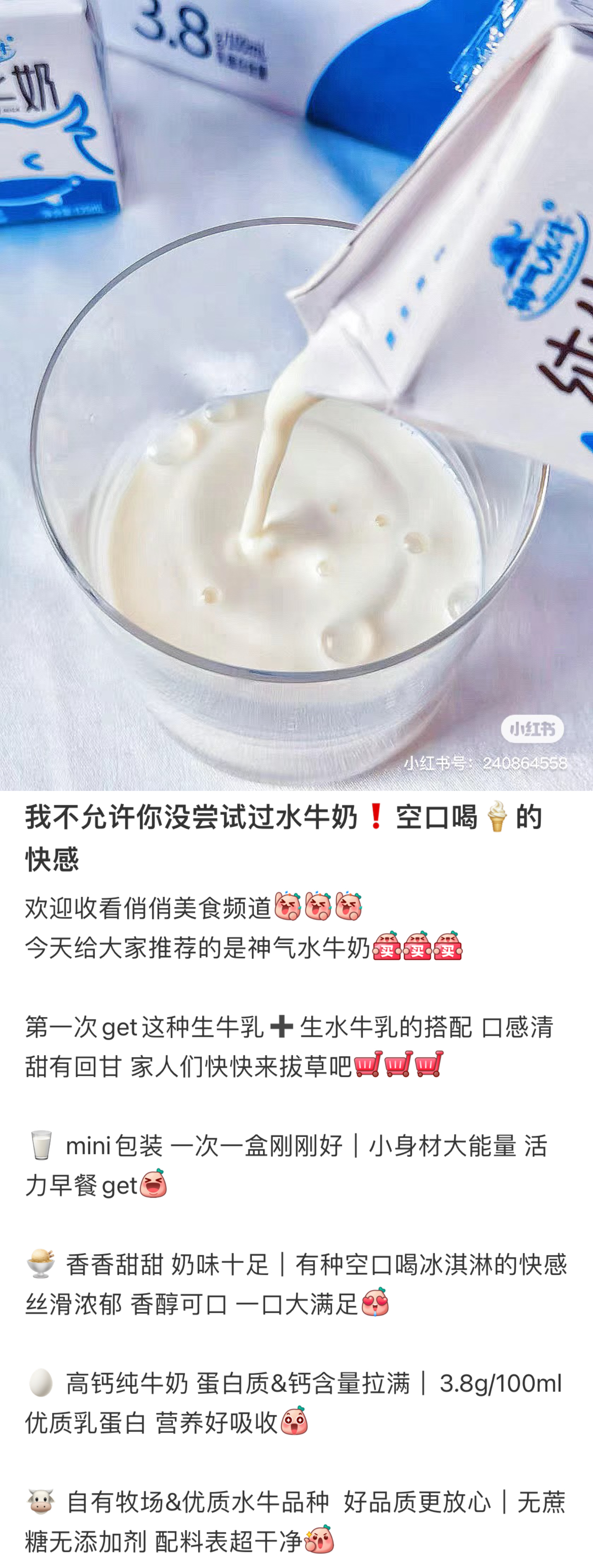 当然,好喝只是一方面,更推荐这款奶的原因是它的钙量及蛋白质等营养物质含量,比一般奶也更高,每 100g 含有 3.8g 蛋白质和 130mg 原生高钙,远高于普通的纯牛奶,小宝宝喝非常合适,对于老人的日常补钙也很友好,还有我们打工中年人,也可以用它来做续命咖啡,口感真的很很很好,因为乳脂含量较高,入口香浓丝滑,不用加糖就有着冰淇淋般的清甜!