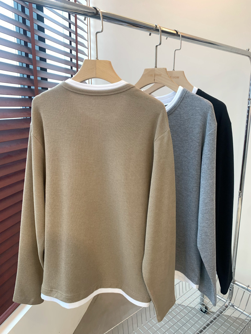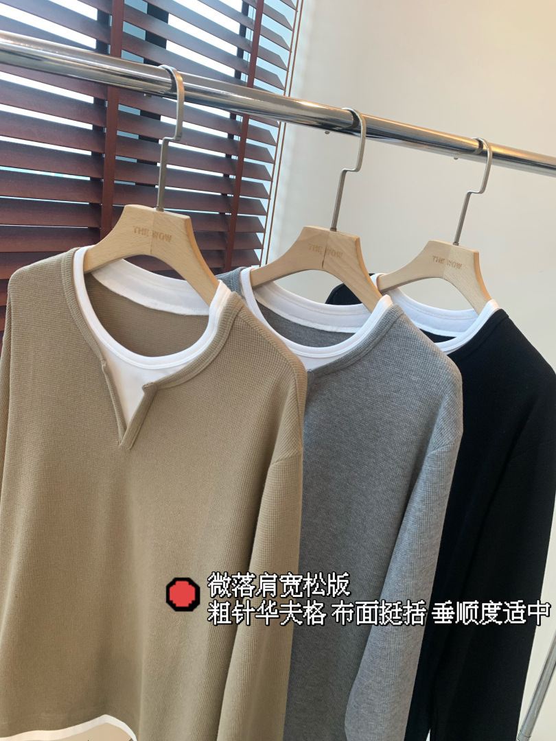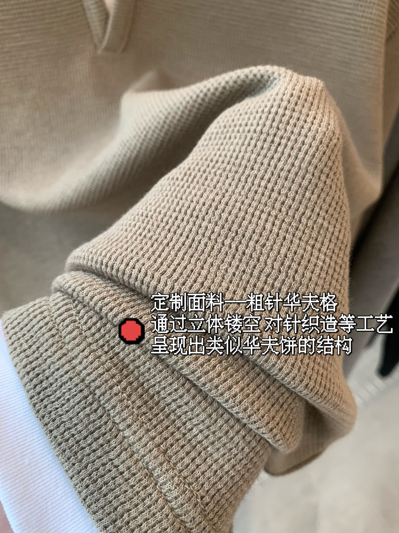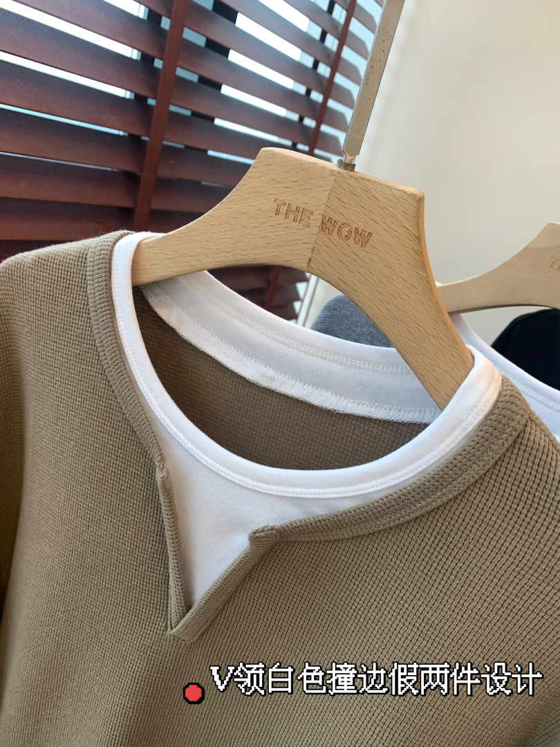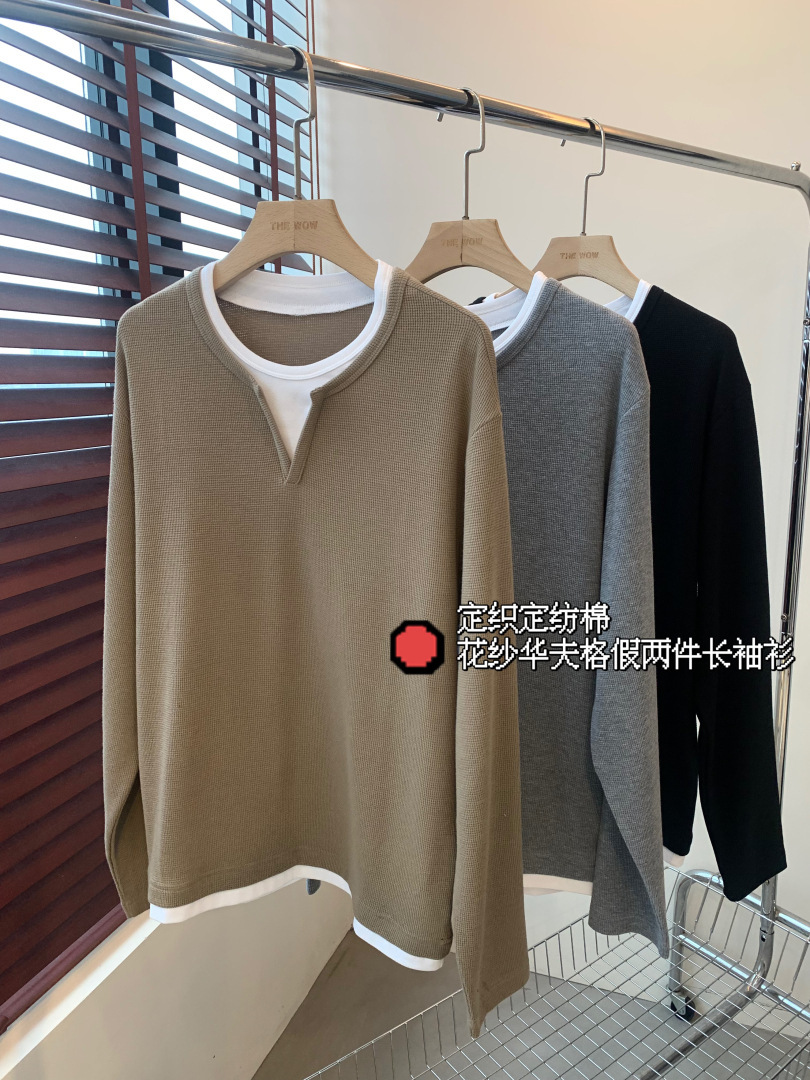 定织定纺棉,花纱华夫格假两件针织长袖衫