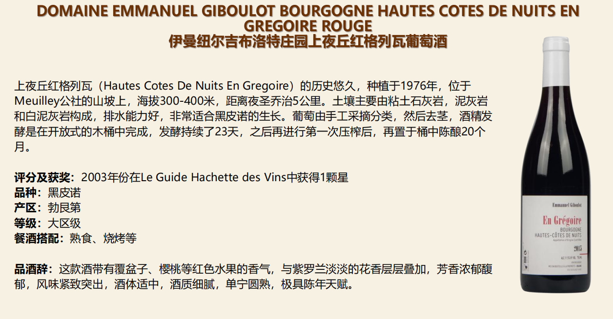 Domaine Emmanuel Hautes Cotes De Nuits En Gregoire Rouge 2019 750Ml 伊曼纽尔吉布洛特庄园上夜丘红格列瓦葡萄酒