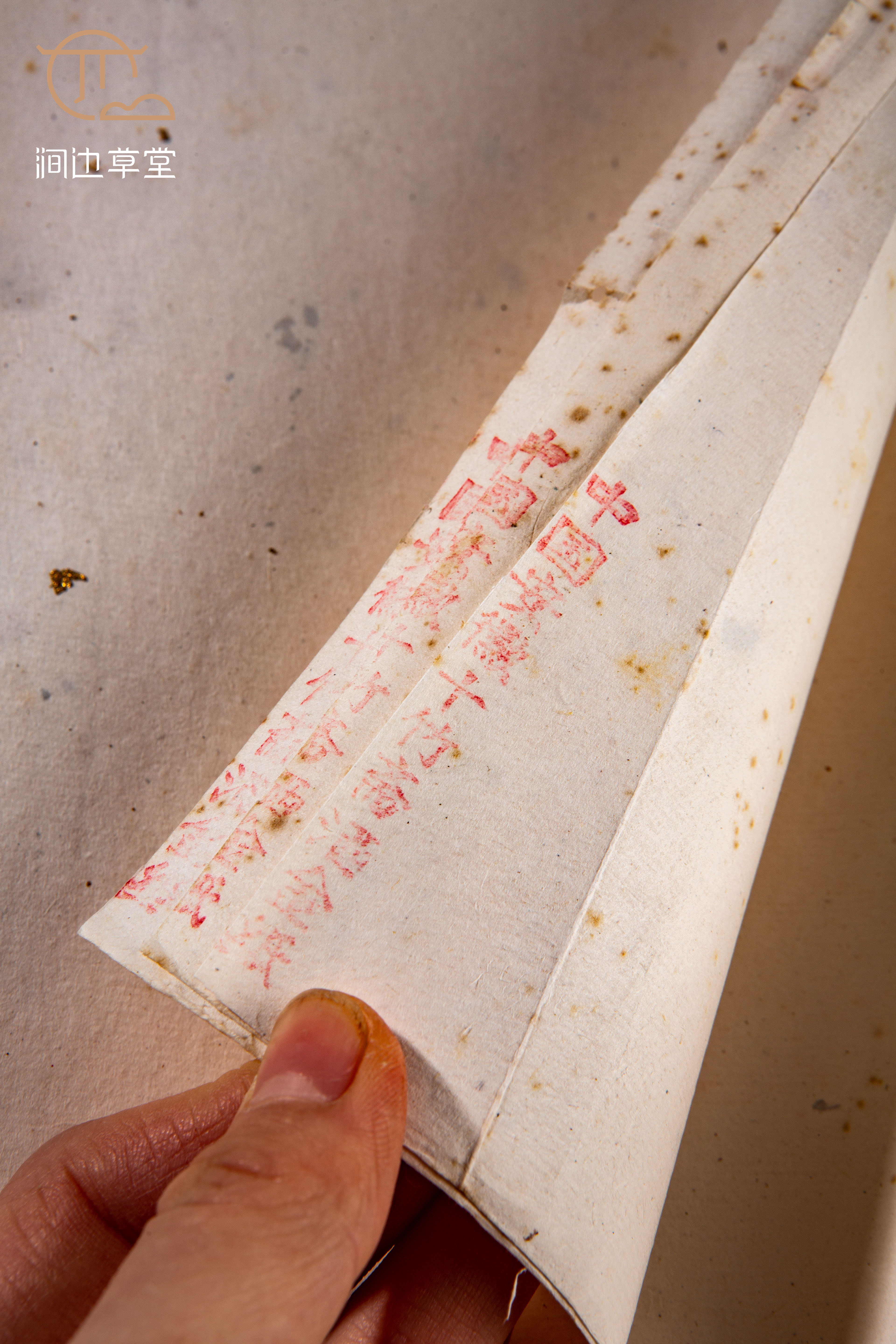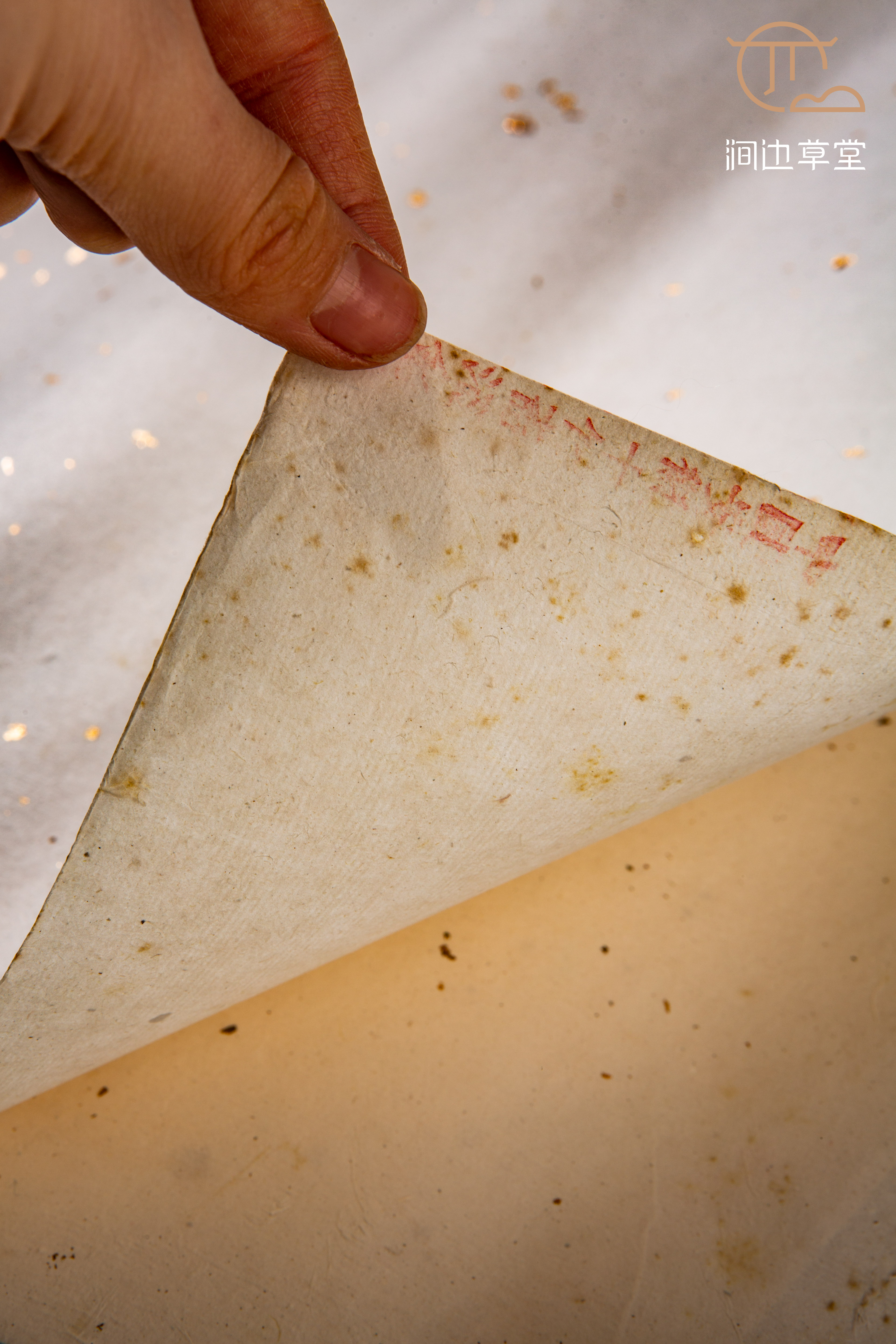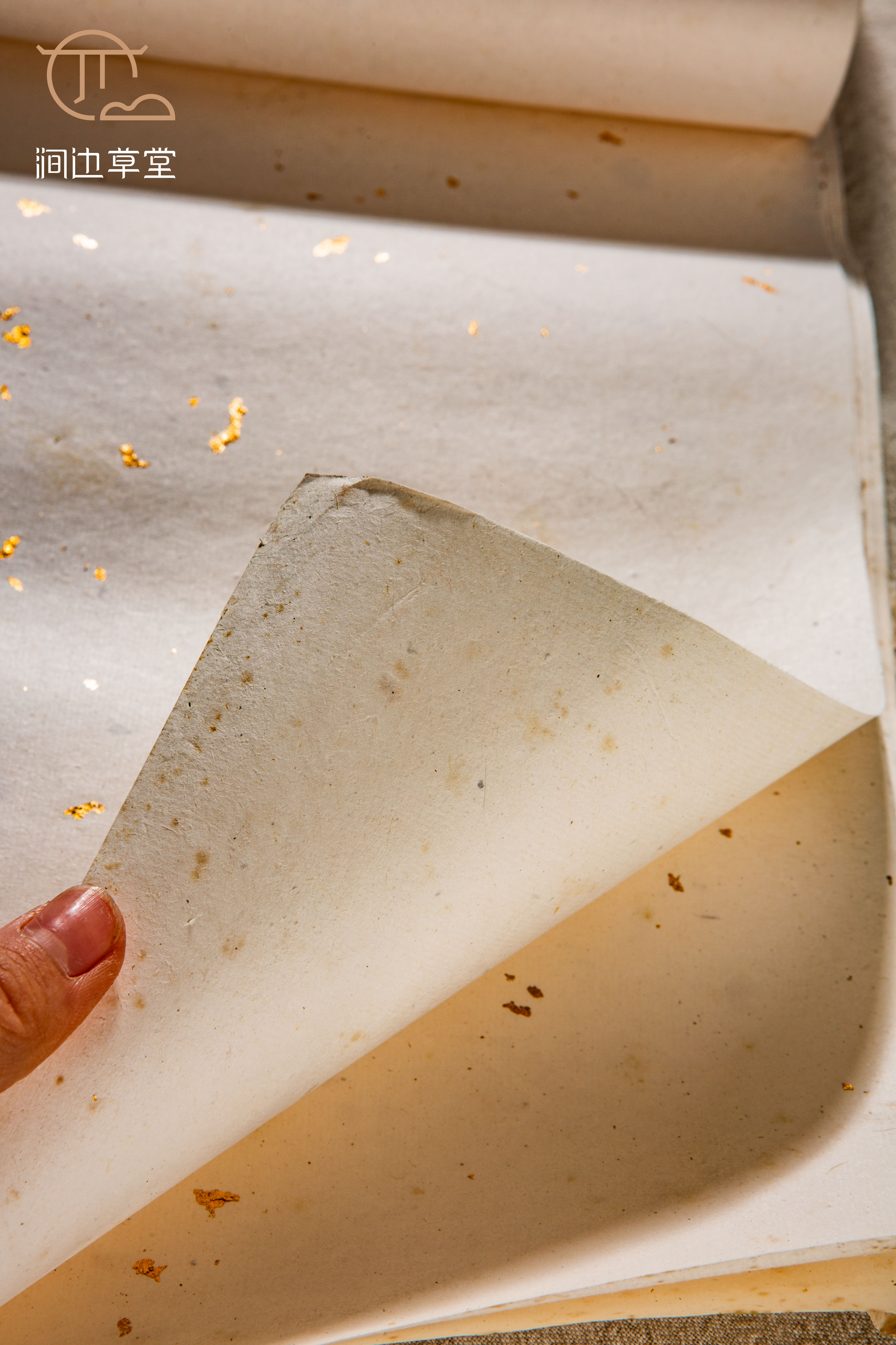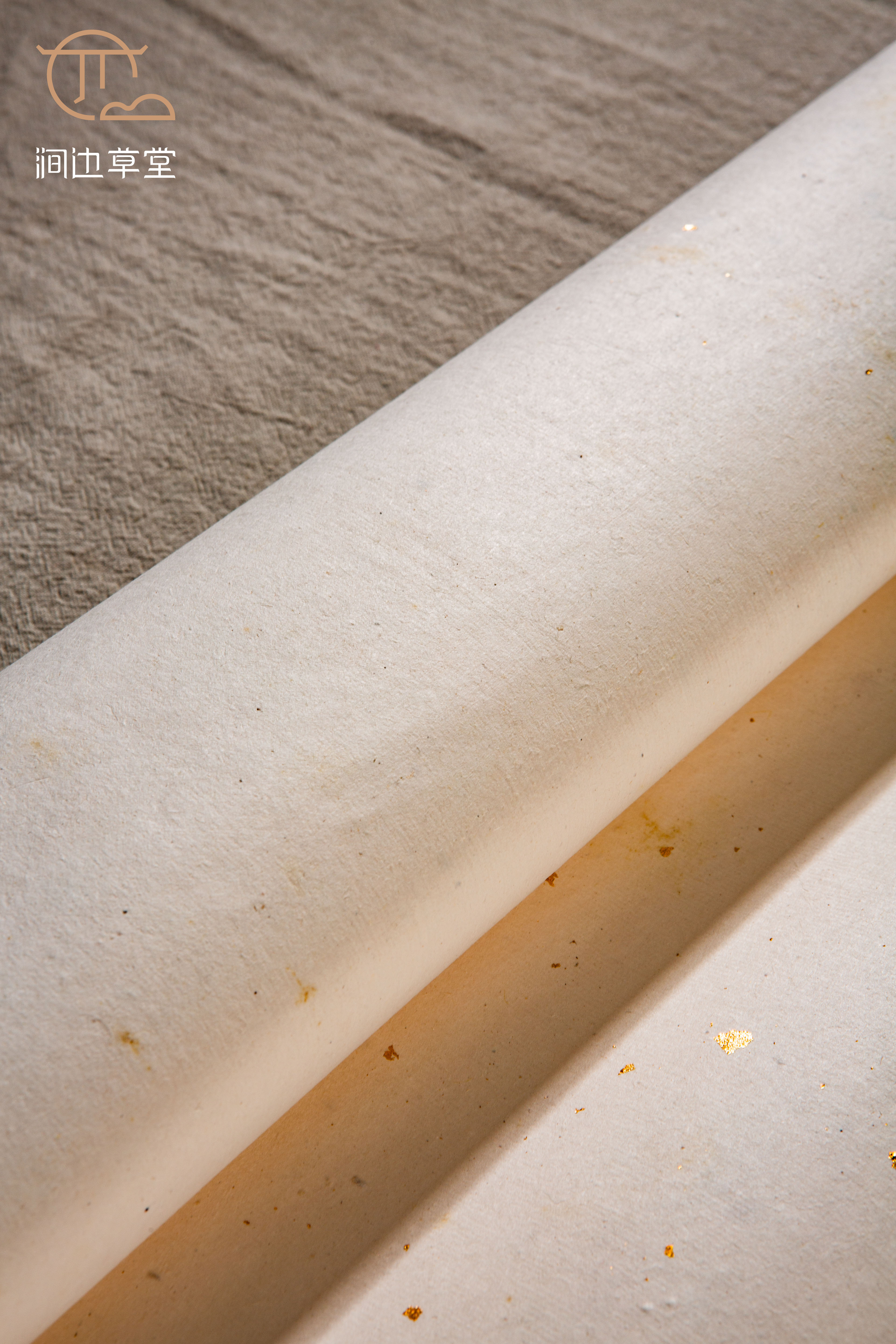 70-80年代安徽十竹斋精制洒金纸,纸张颜色纯正清雅,洒真金光彩夺目,纸质精良,工艺精细。十竹斋是始创于明代的老字号,其所造纸张自古皆为上品,十分难得。