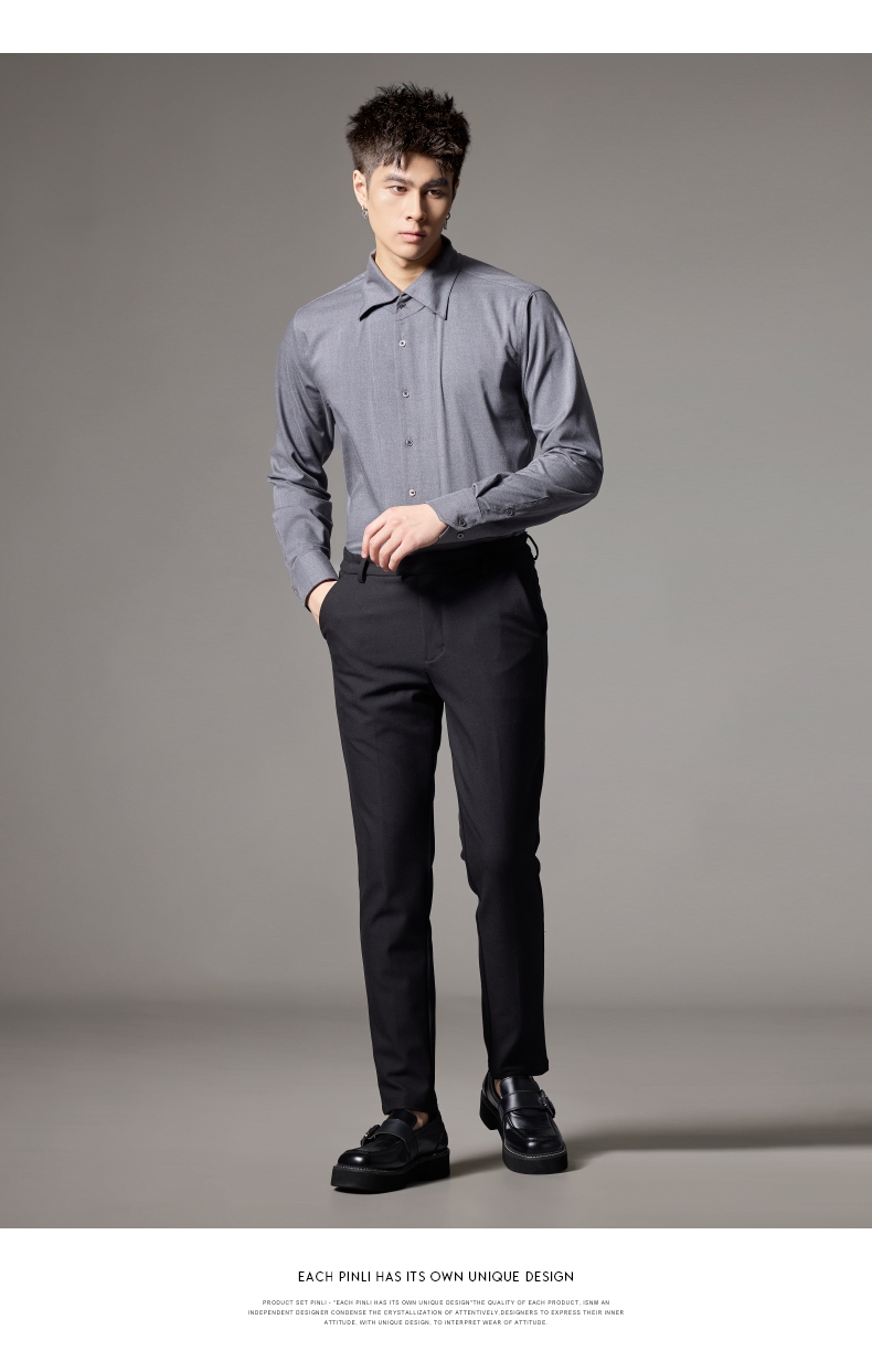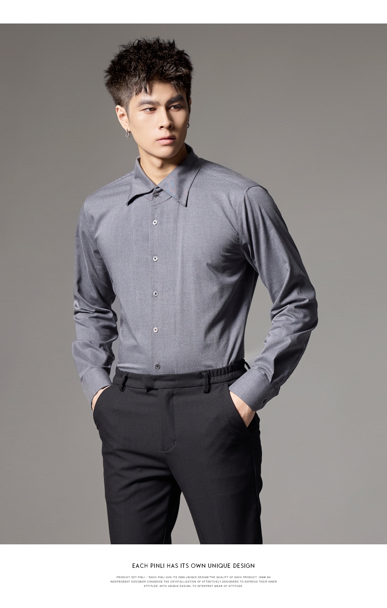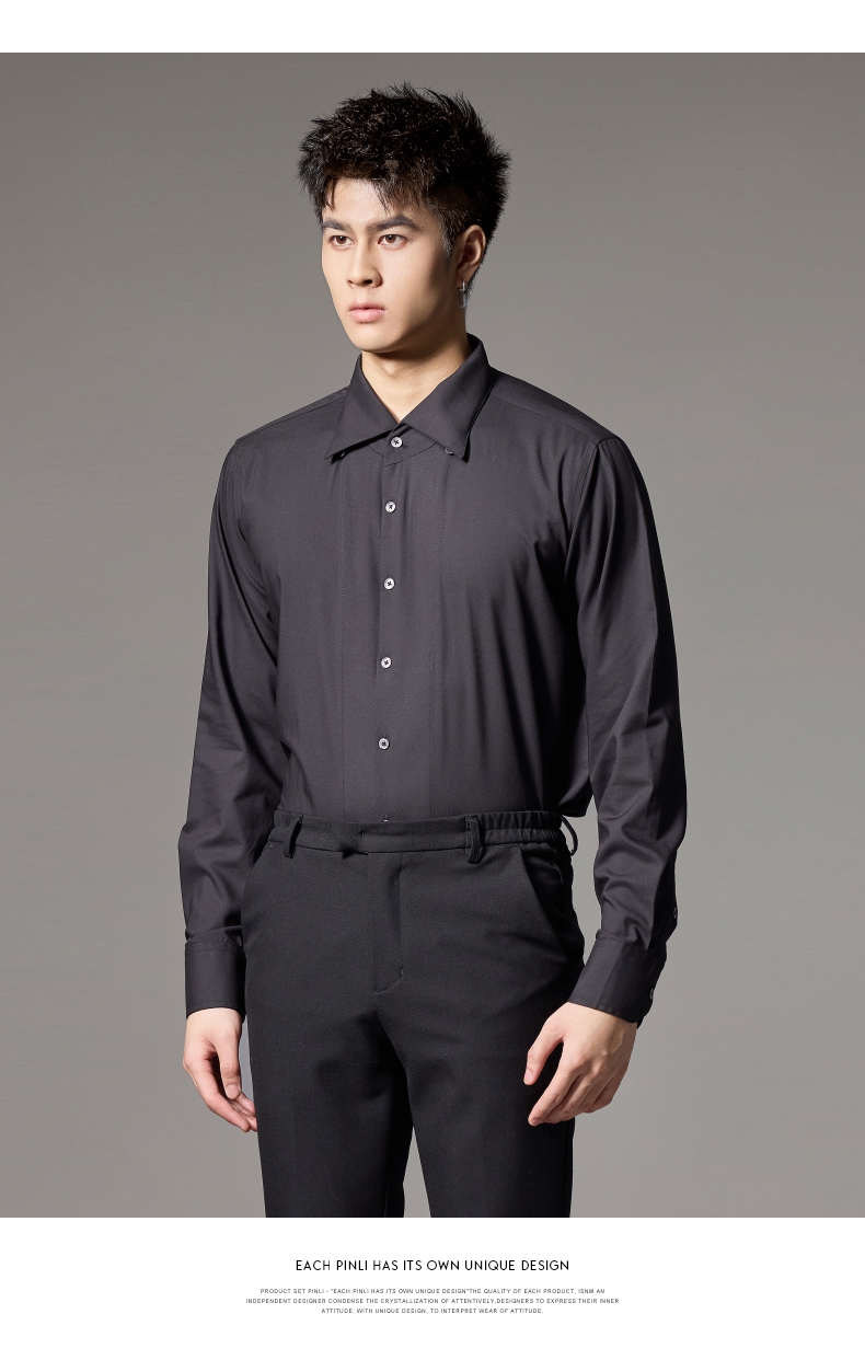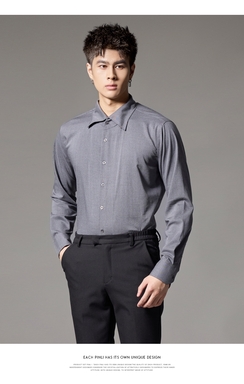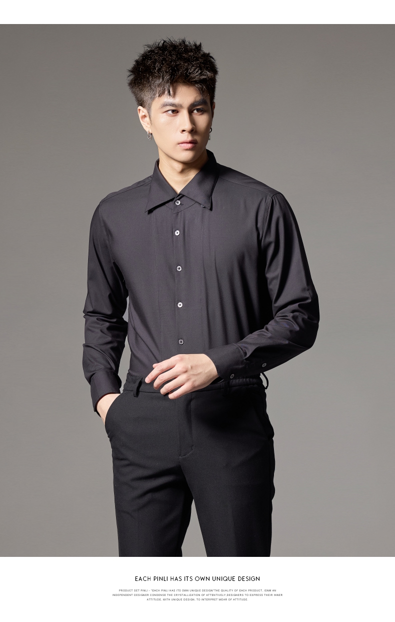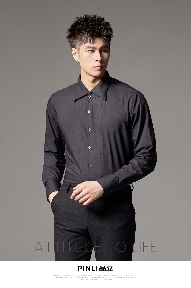 PINLI品立2024秋季新款男士修身尖领纯色打底长袖衬衫GD243213379