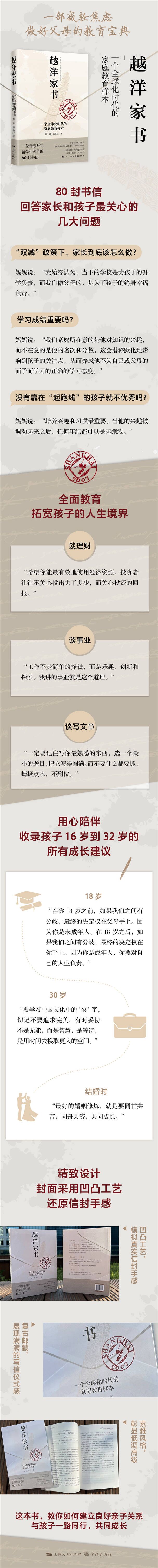 《越洋家书:一个全球化时代的家庭教育样本》选录了一位60后妈妈写给80后儿子在英国、美国读书期间的80封书信,时间跨度长达16年,反映了家长与孩子一起分享生活、探讨问题、共同成长的宝贵经历。在书中,我们能看到“学霸”的养成模式,了解“复旦妈妈”与“美国普林斯顿大学儿子”的学习交流与思维碰撞;也能看到亲子之间的真情流露,读到妈妈对孩子循循善诱的教导。谈文学,谈求职,谈理财,谈感恩,谈人生哲理……他们是母子,是朋友,更是知己。这些教育方法不仅能够为留学生及其父母给出有针对性的参考,更是能够为所有家庭提供一个很好的借鉴。
