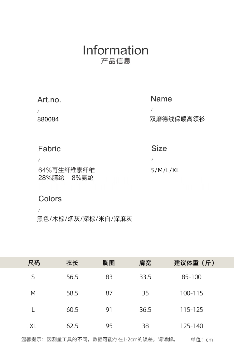 weyo秋冬新款女软糯德绒保暖修身舒适高领衫保暖打底T恤880084、880085
