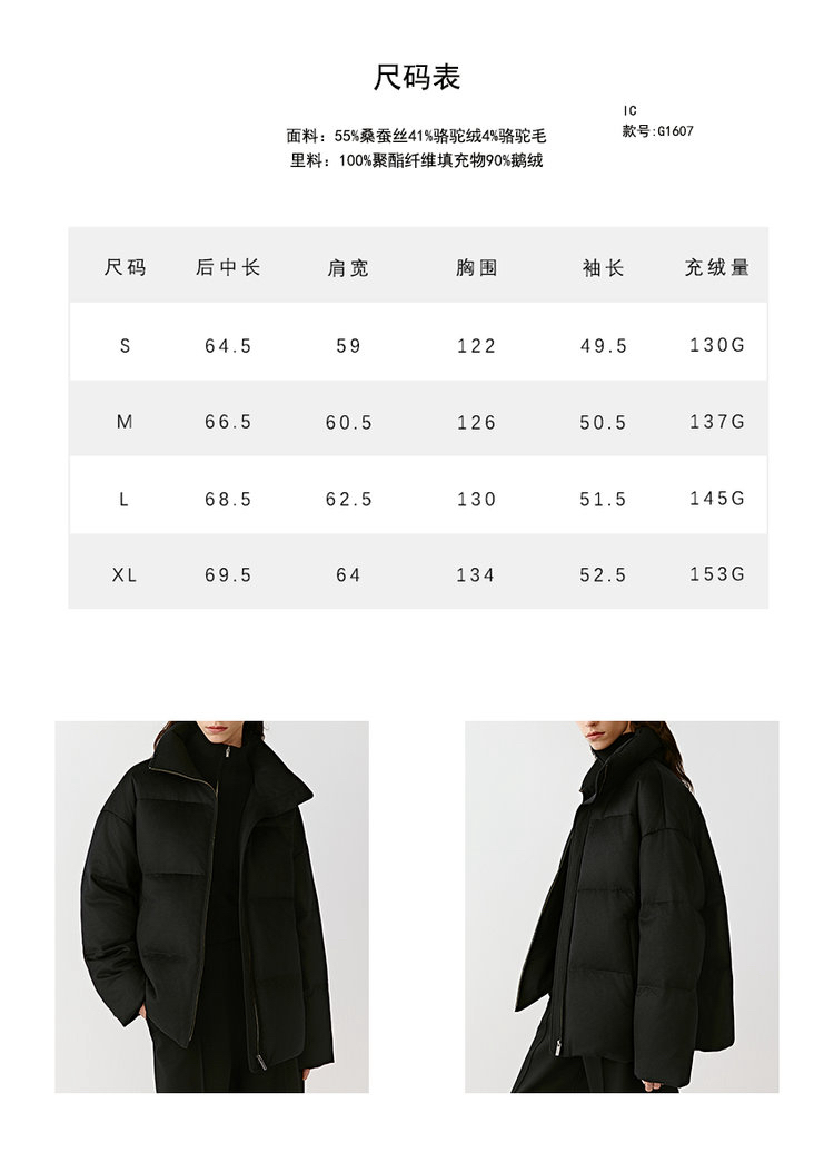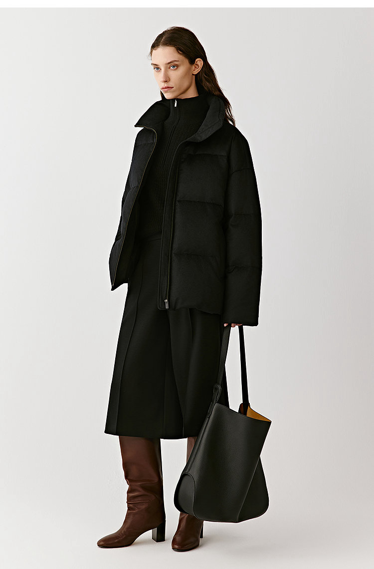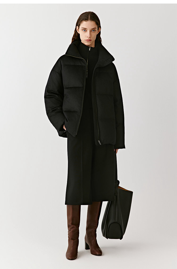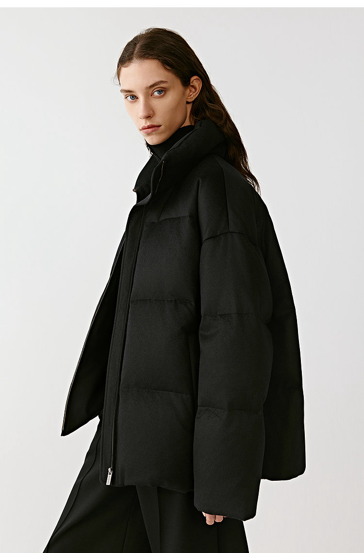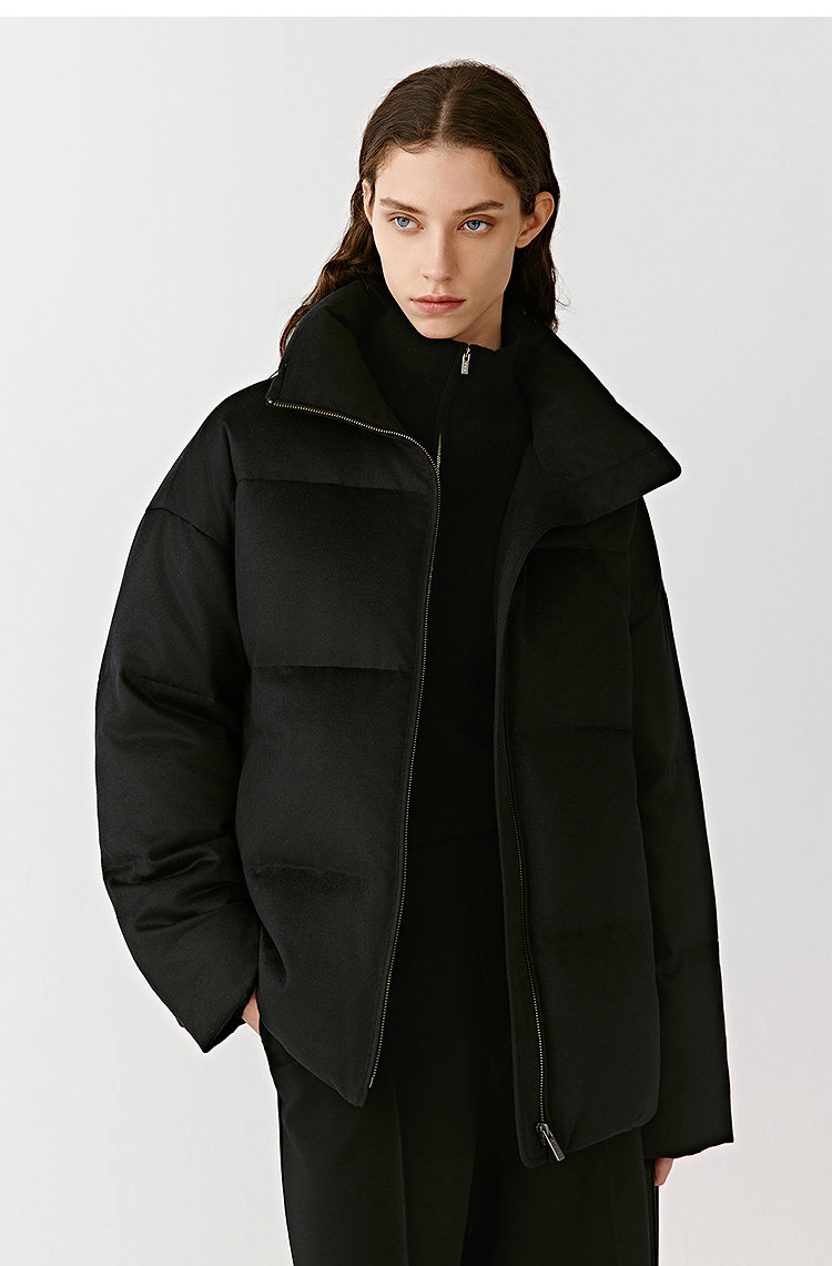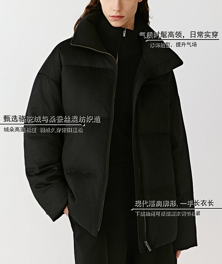 简约立领设计短版鹅绒服 丝驼绒羽绒服 充绒饱满 骆驼绒与桑蚕丝混纺织造面料 90鹅绒填充 落肩廓形 下摆可调节抽绳