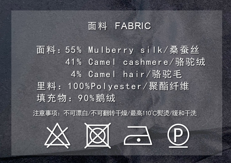 甄选骆驼绒与桑蚕丝混纺织造,真丝赋予衣物云朵般的轻盈与细腻光泽,而骆驼绒锁住温度同时保持挺括形态,两者结合,造就既柔软又富有立体感的独特触感。