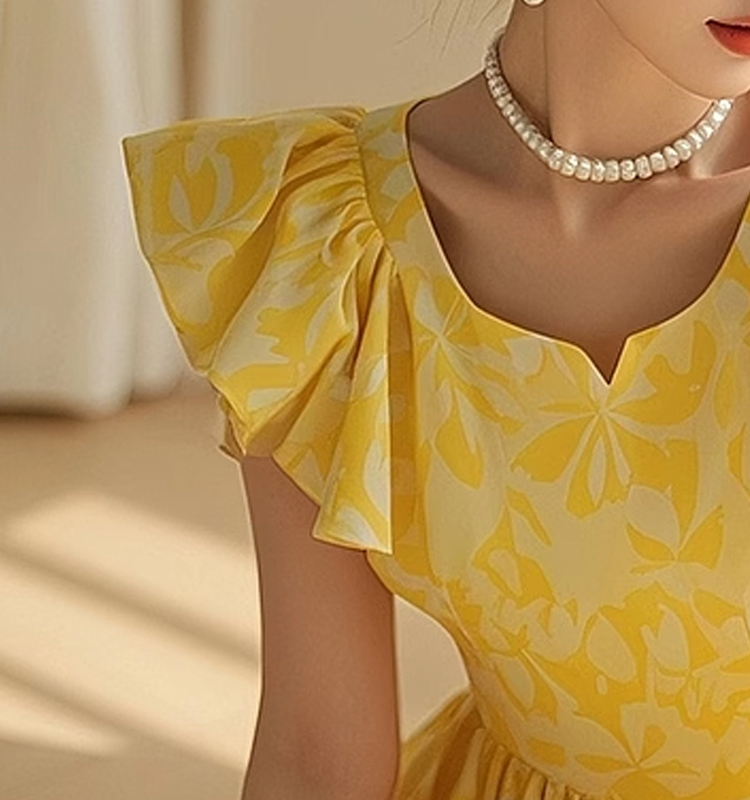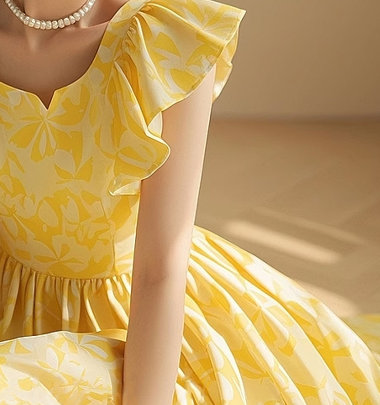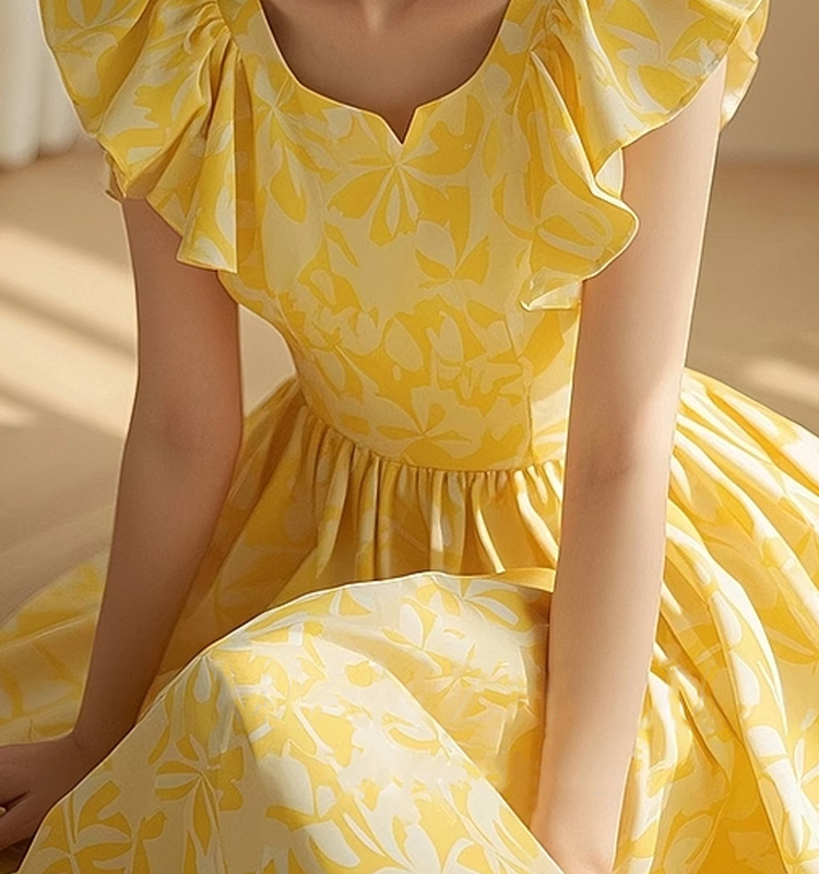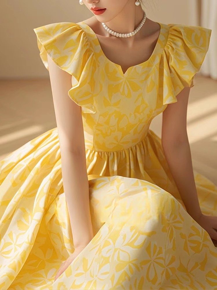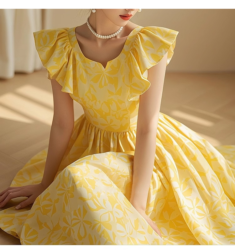 裁缝学苑AS434气质高级感小众设计茶歇法式绝美黄色印花小飞袖连衣裙女