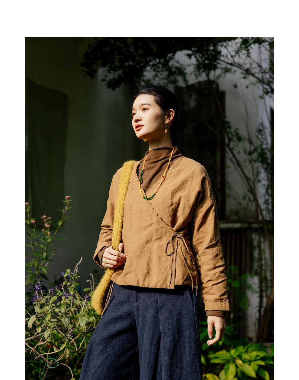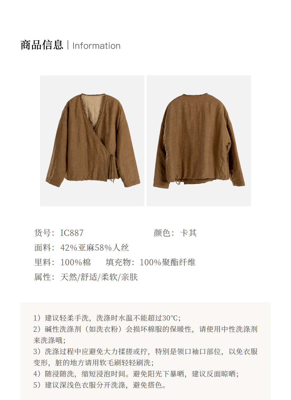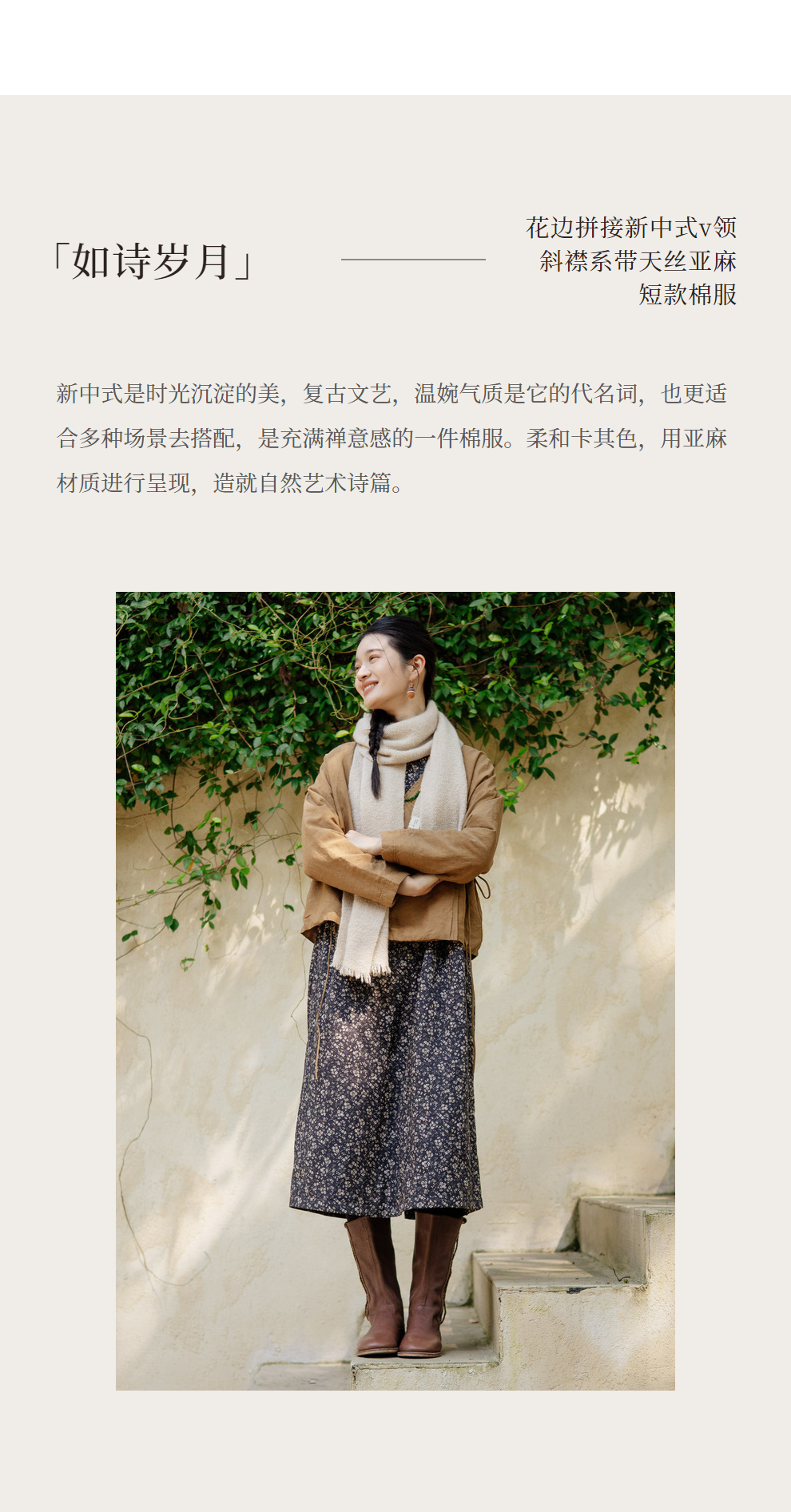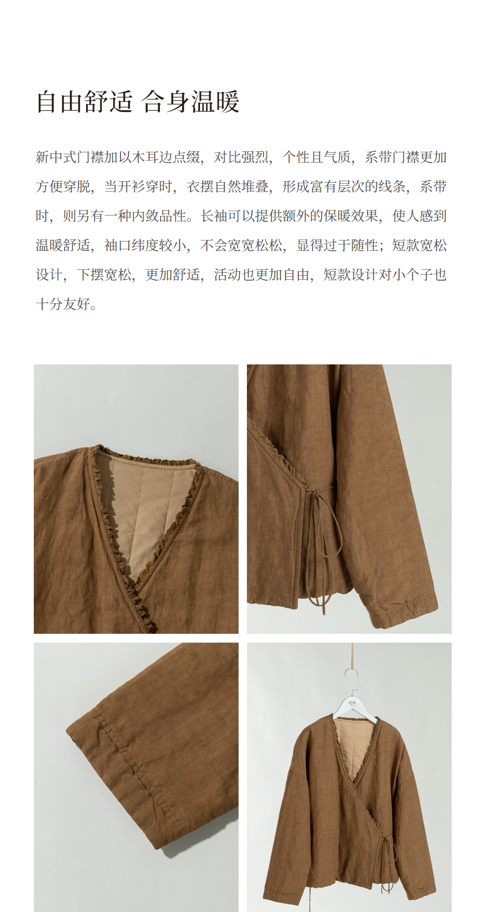 绽放旅行女装887朵/花边拼接新中式v领斜襟系带天丝亚麻短款棉服