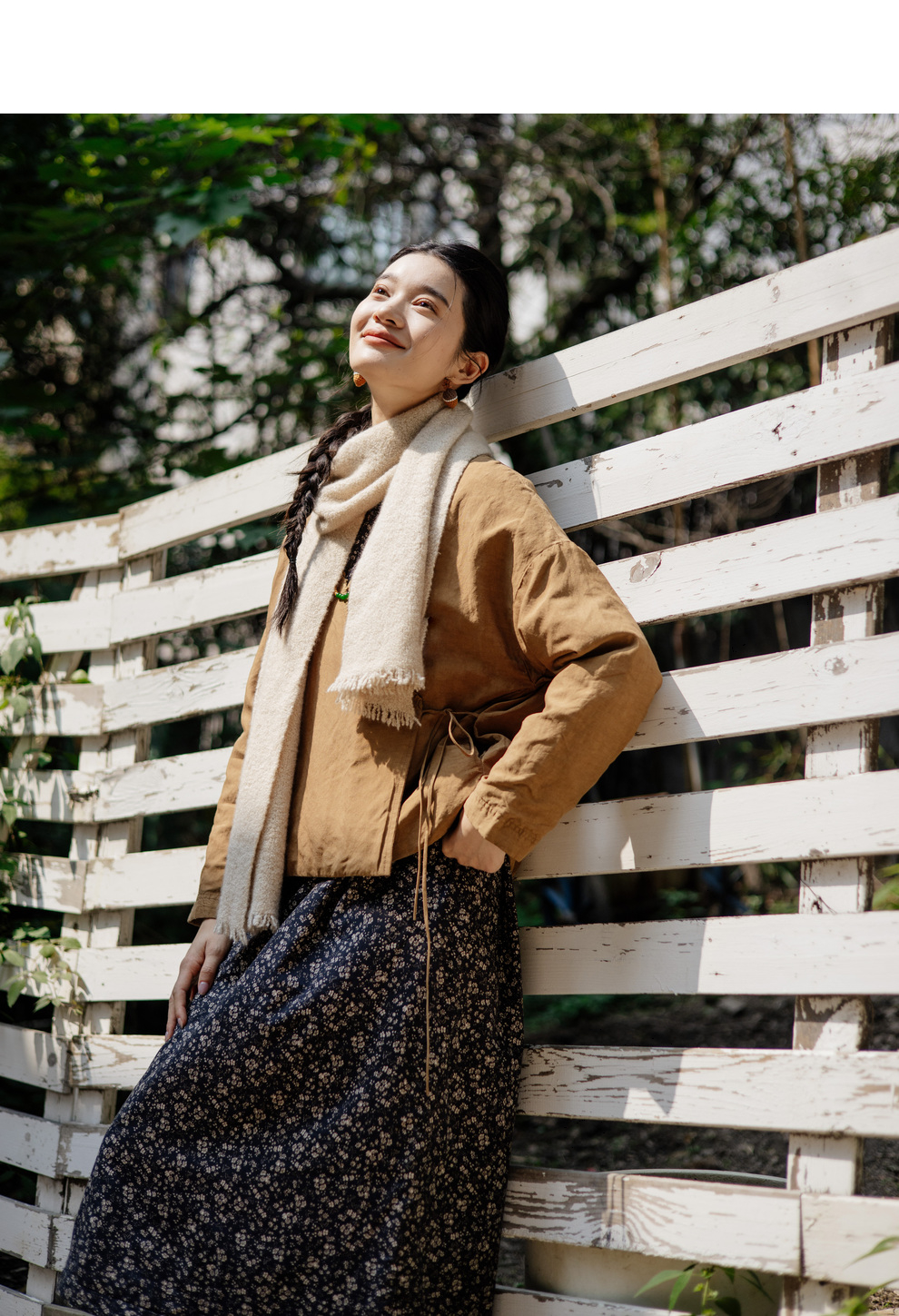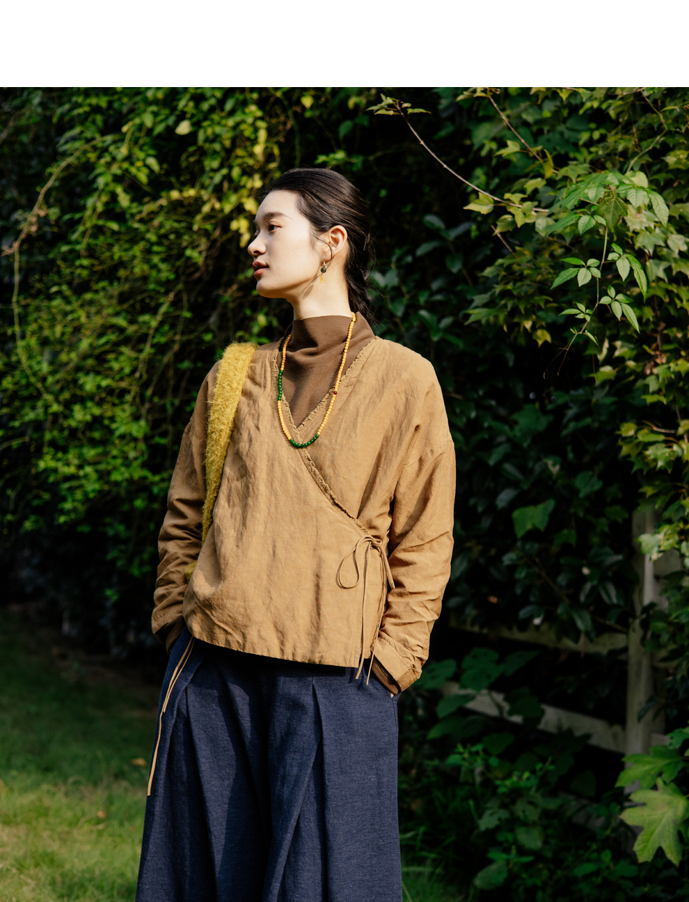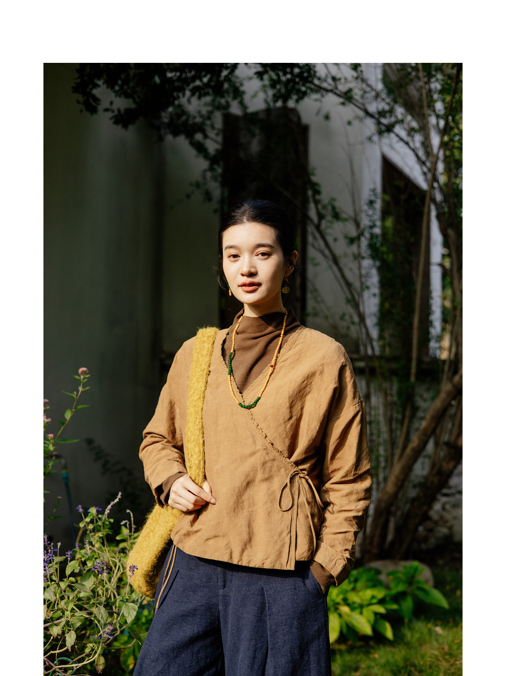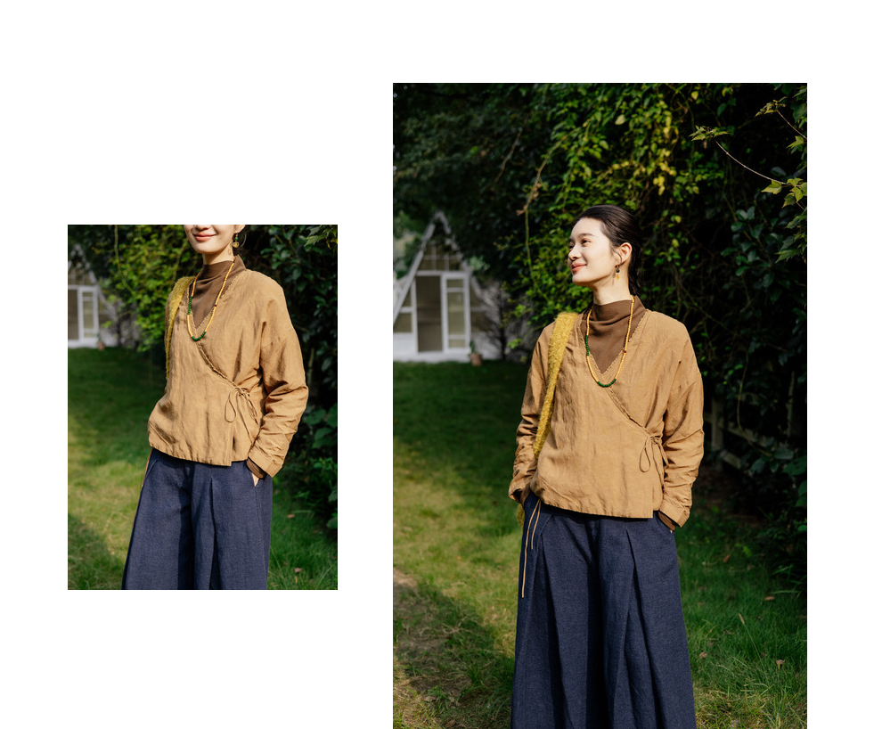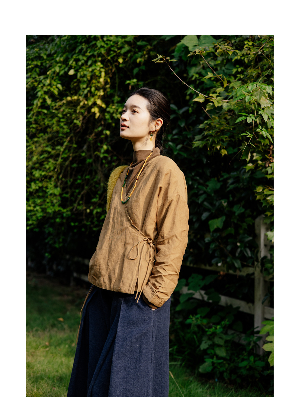 绽放旅行女装887朵/花边拼接新中式v领斜襟系带天丝亚麻短款棉服