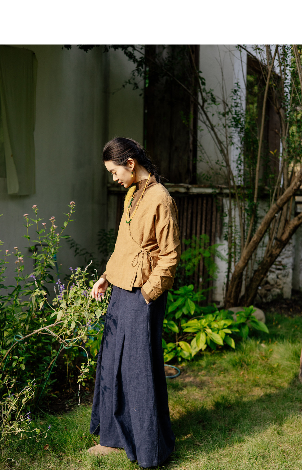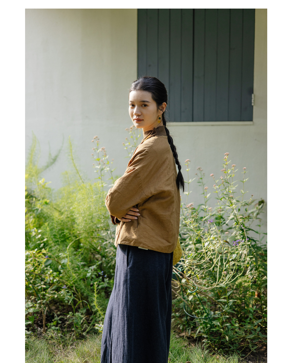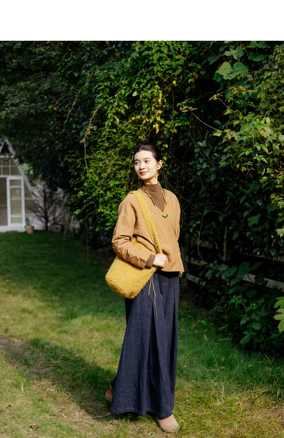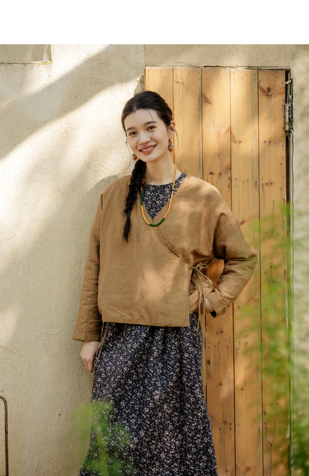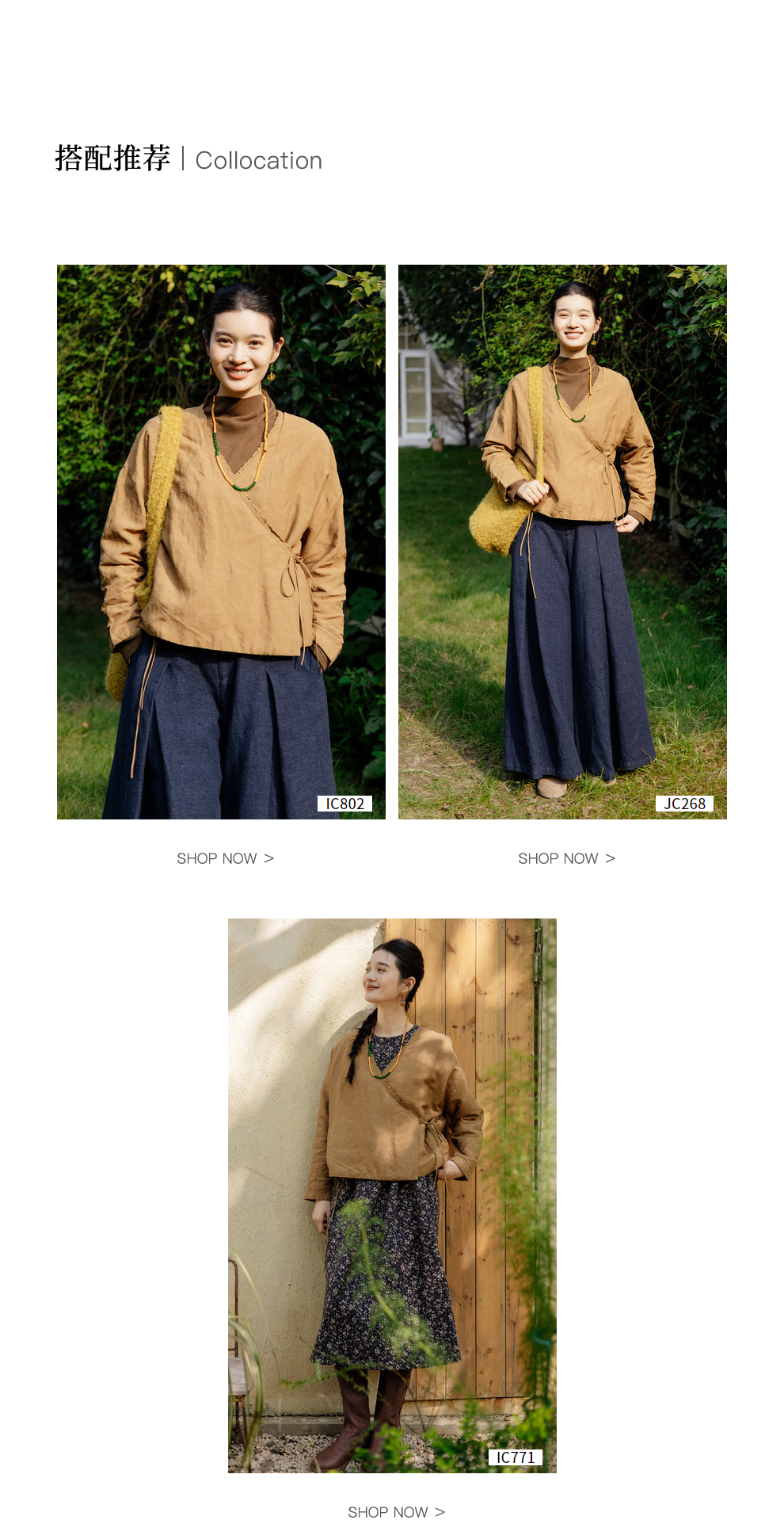 绽放旅行女装887朵/花边拼接新中式v领斜襟系带天丝亚麻短款棉服