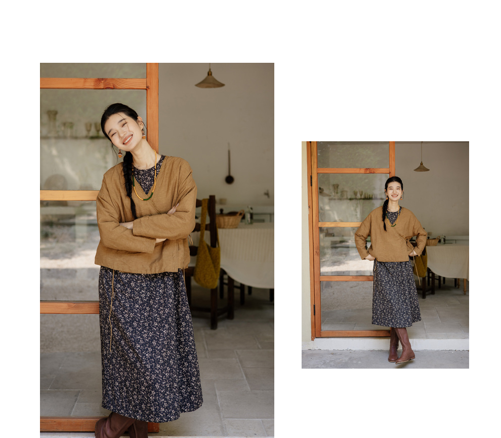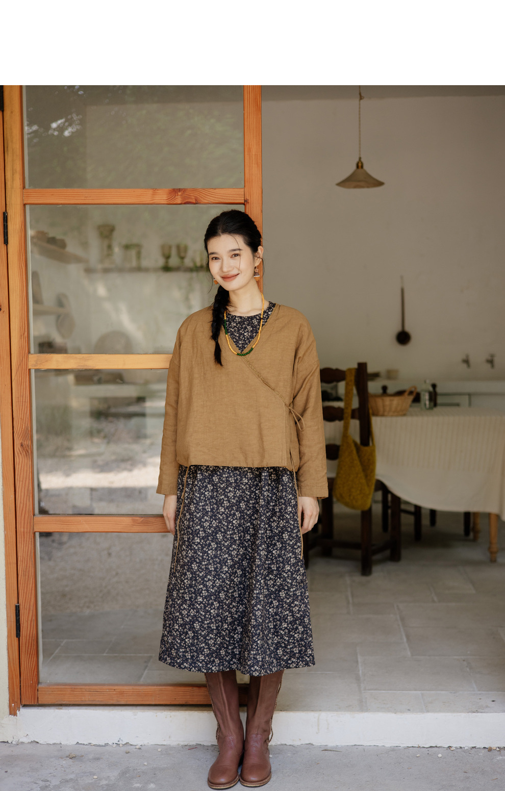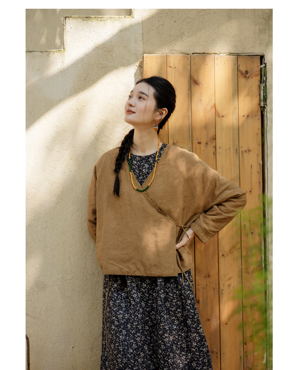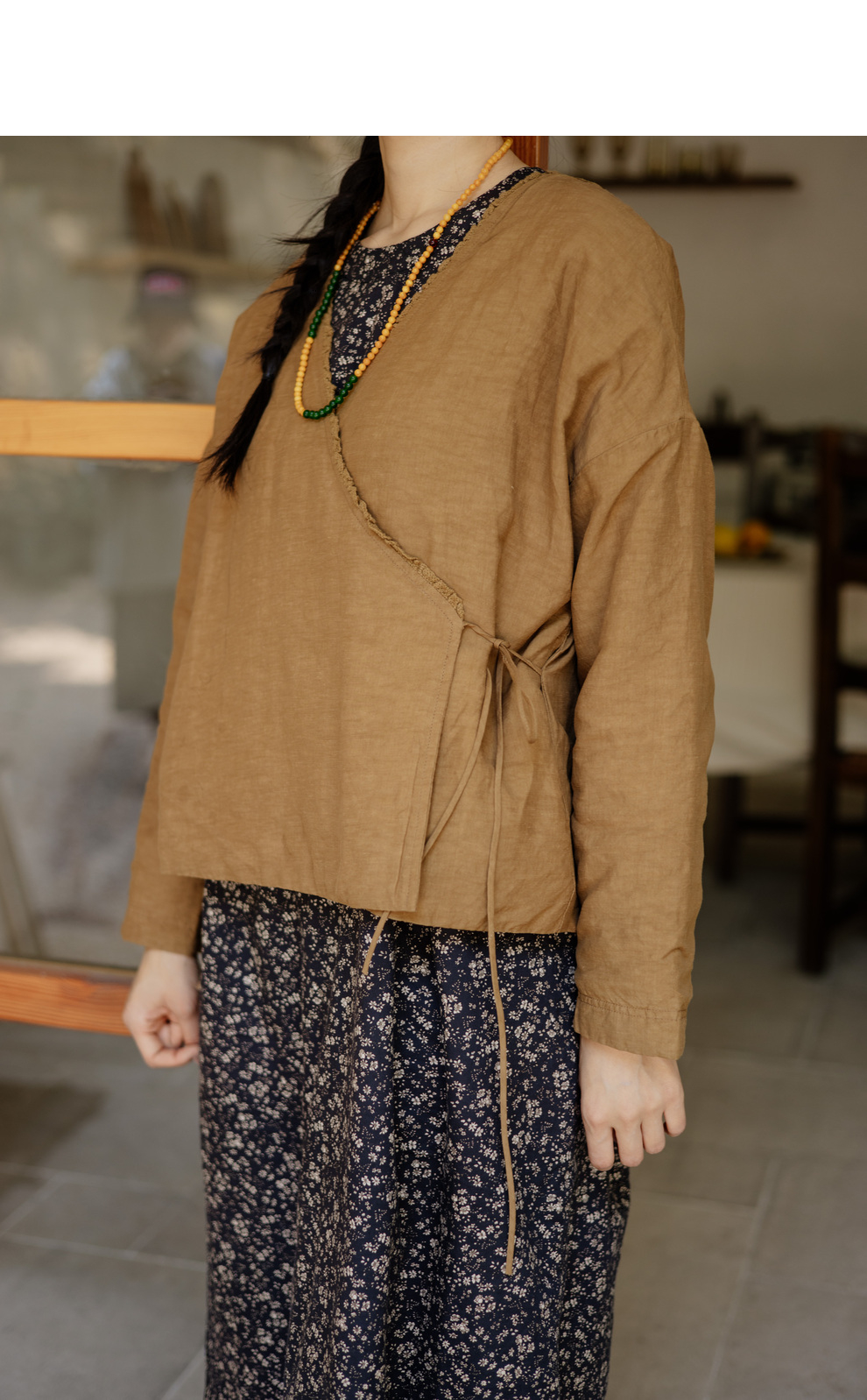 绽放旅行女装887朵/花边拼接新中式v领斜襟系带天丝亚麻短款棉服