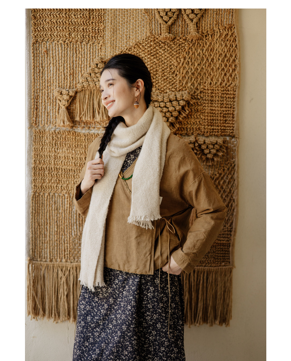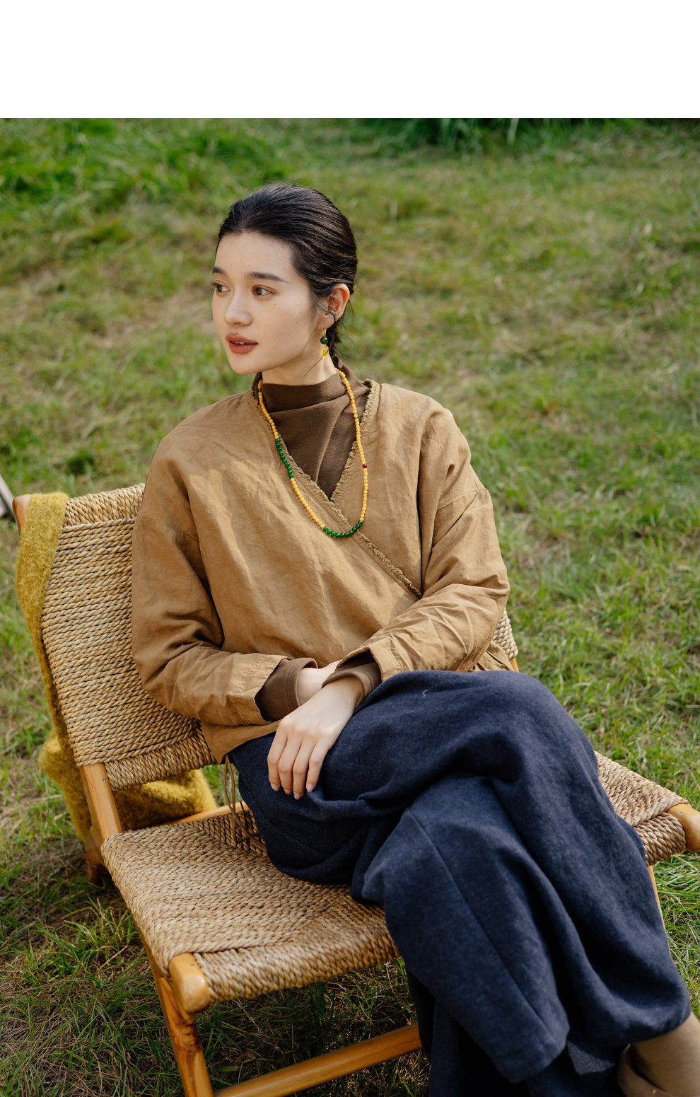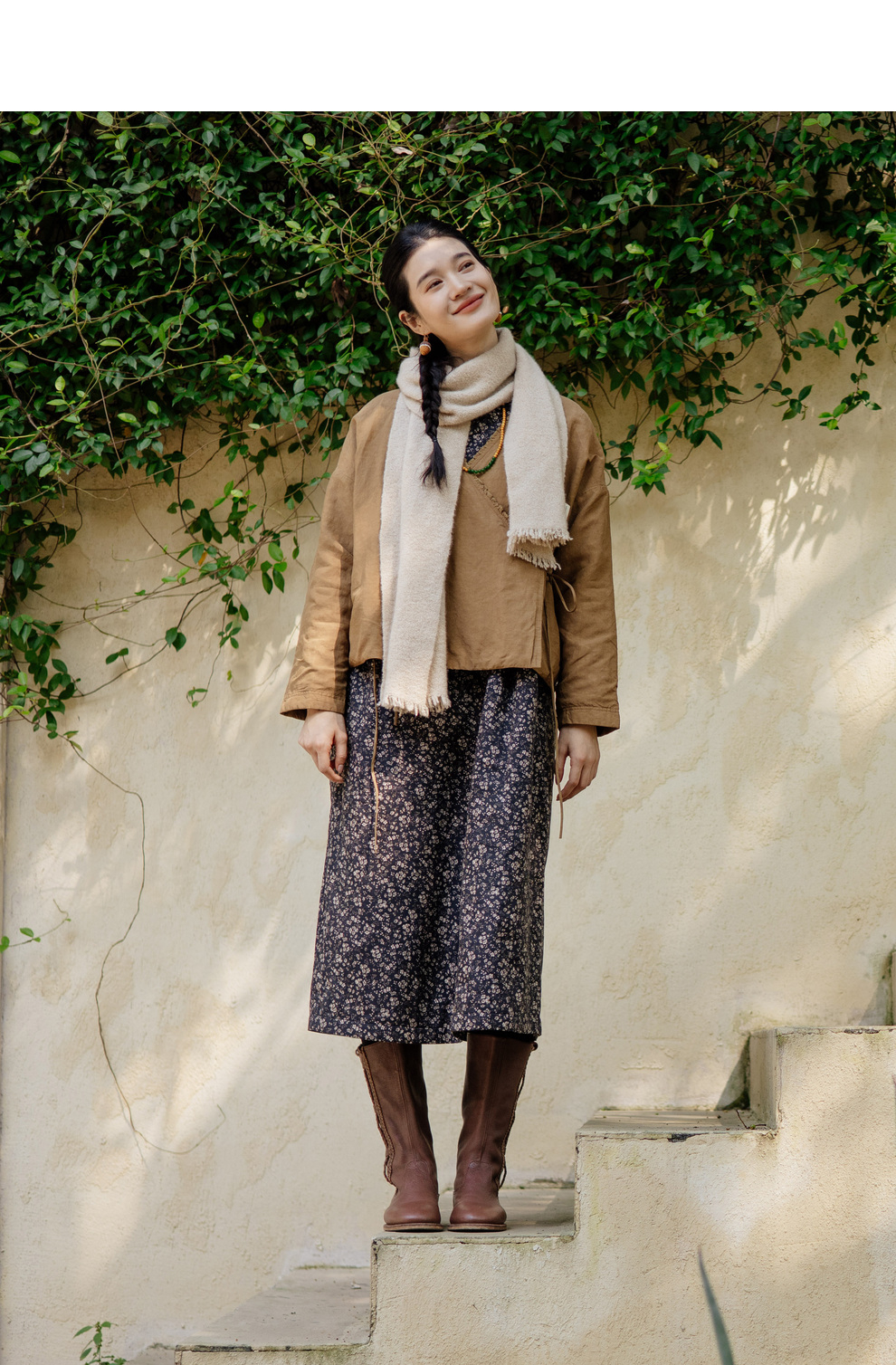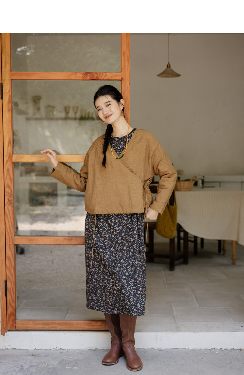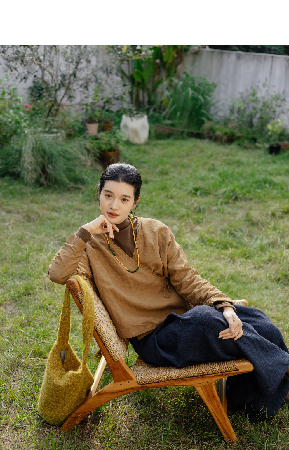 绽放旅行女装887朵/花边拼接新中式v领斜襟系带天丝亚麻短款棉服