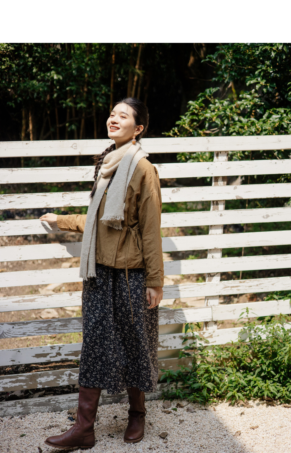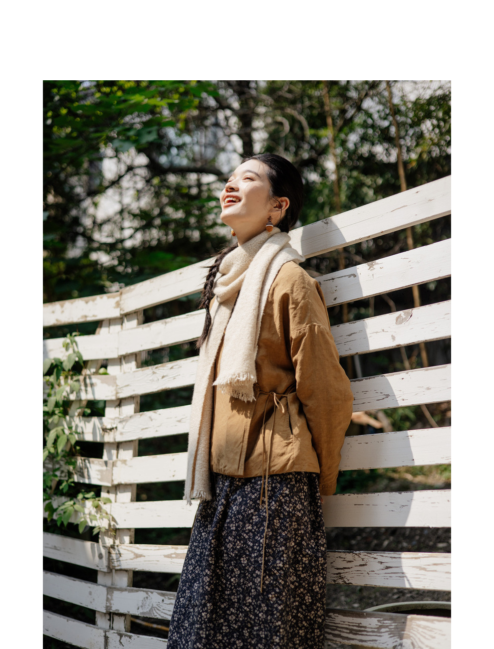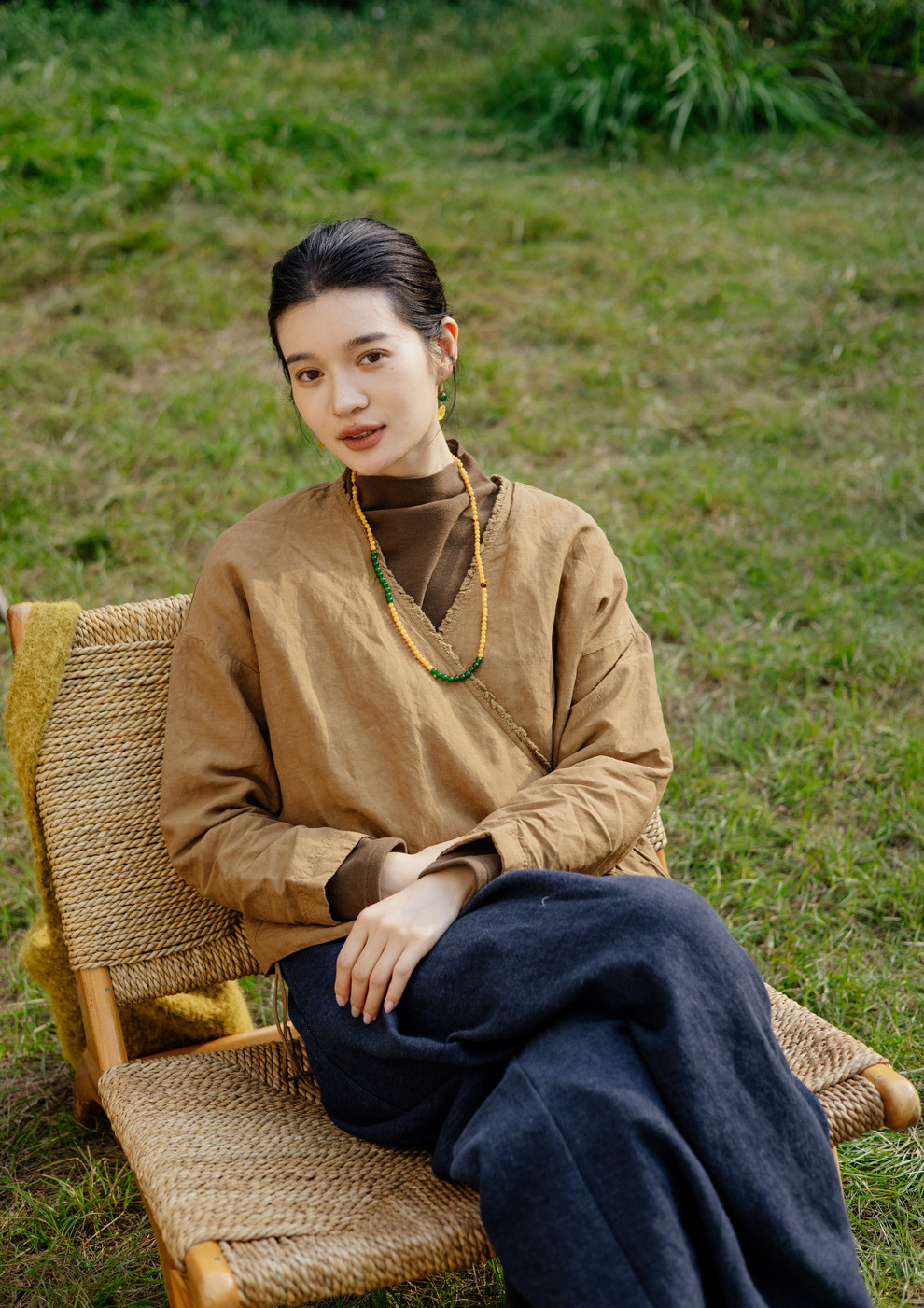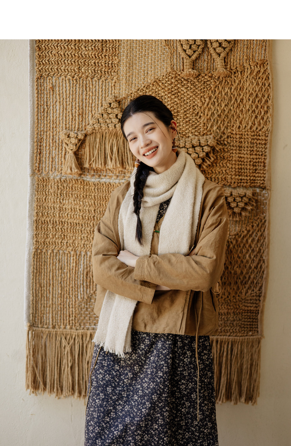 绽放旅行女装887朵/花边拼接新中式v领斜襟系带天丝亚麻短款棉服