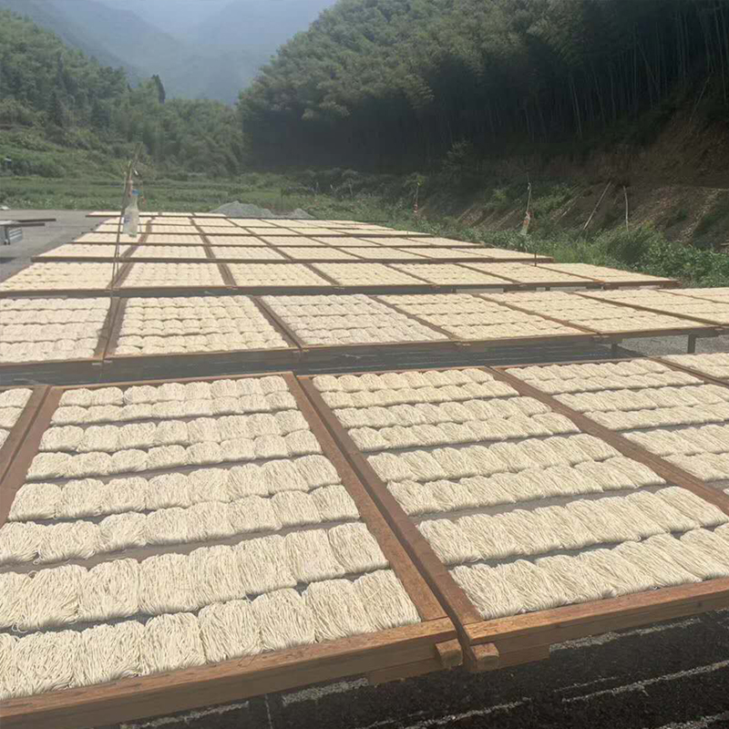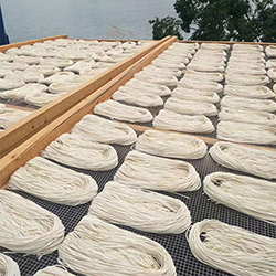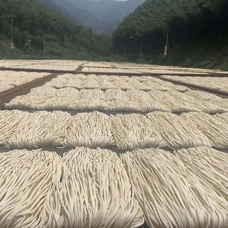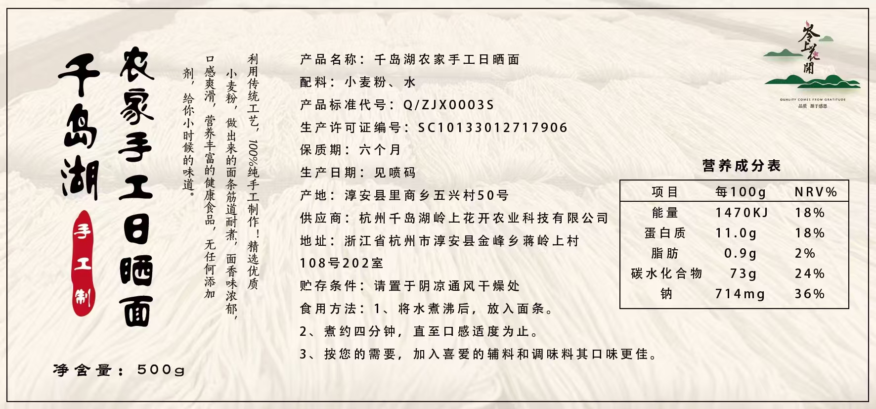 选取千岛湖源头水进行和面,淡淡的,甜甜的。采用10比1的面水配比,保证了面的柔软度,既不会太软易断,也不会太硬。日晒面口感好坏,最关键的一步就在于晒面。正常来说,选取天气好的一天,让这些面享受1-2天的阳光浴。吹着千岛湖微风,沐浴着千岛湖阳光,满满的都是大自然的味道。日晒面经过水煮后,根根分明,不容易断,不容易糊,可根据个人喜好,选择水煮时间,调整面条的软硬度。面条嚼劲十足,满满的千岛湖味儿。回锅再煮也不会坨,适合做汤面、拌面、凉面等。无添加剂,口感清爽。