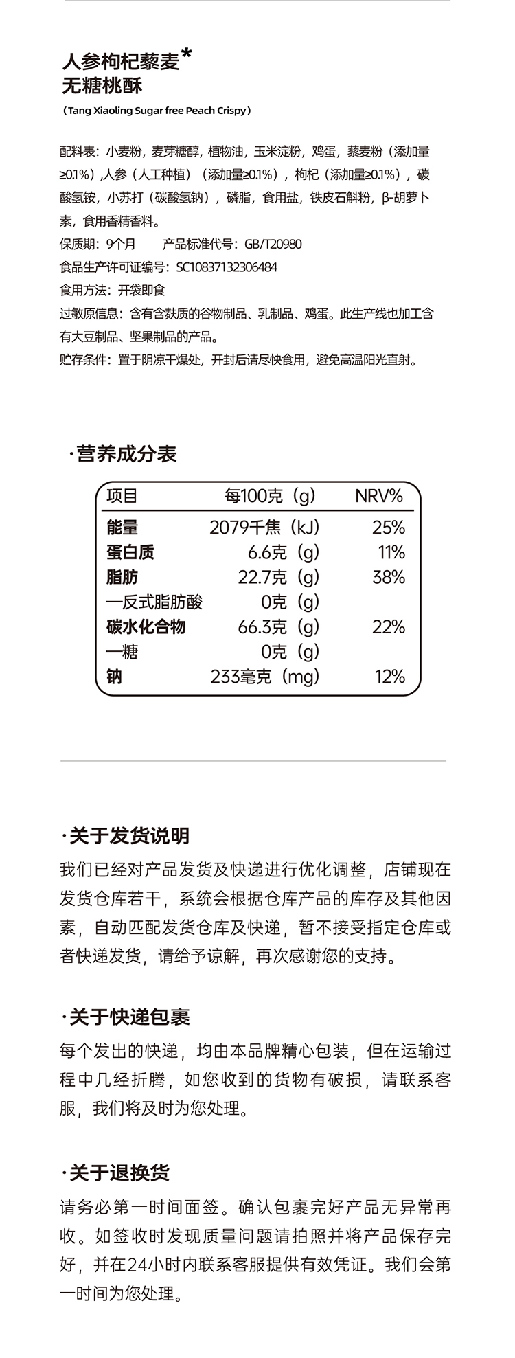 【品名】唐小零 五红谷物无糖饼干/无糖膳食营养低GI饼干/人参枸杞藜麦无糖桃酥/五黑谷物无糖饼干 【规格】 【产地】国内 【保质期】 五红谷物无糖饼干/五黑谷物无糖饼干/无糖低GI饼干:10个月 人参枸杞藜麦无糖桃酥:9个月 【发货包装】独立包装 【发货地】临沂 【发货快递】中通、圆通、申通、韵达随机发 【不发货区域】新疆、西藏、港澳台 【补邮费地区】内蒙古、宁夏、甘肃、青海+10元 海南+15元 上海+2元 【发货时效】48-72小时,周末节假日顺延 |