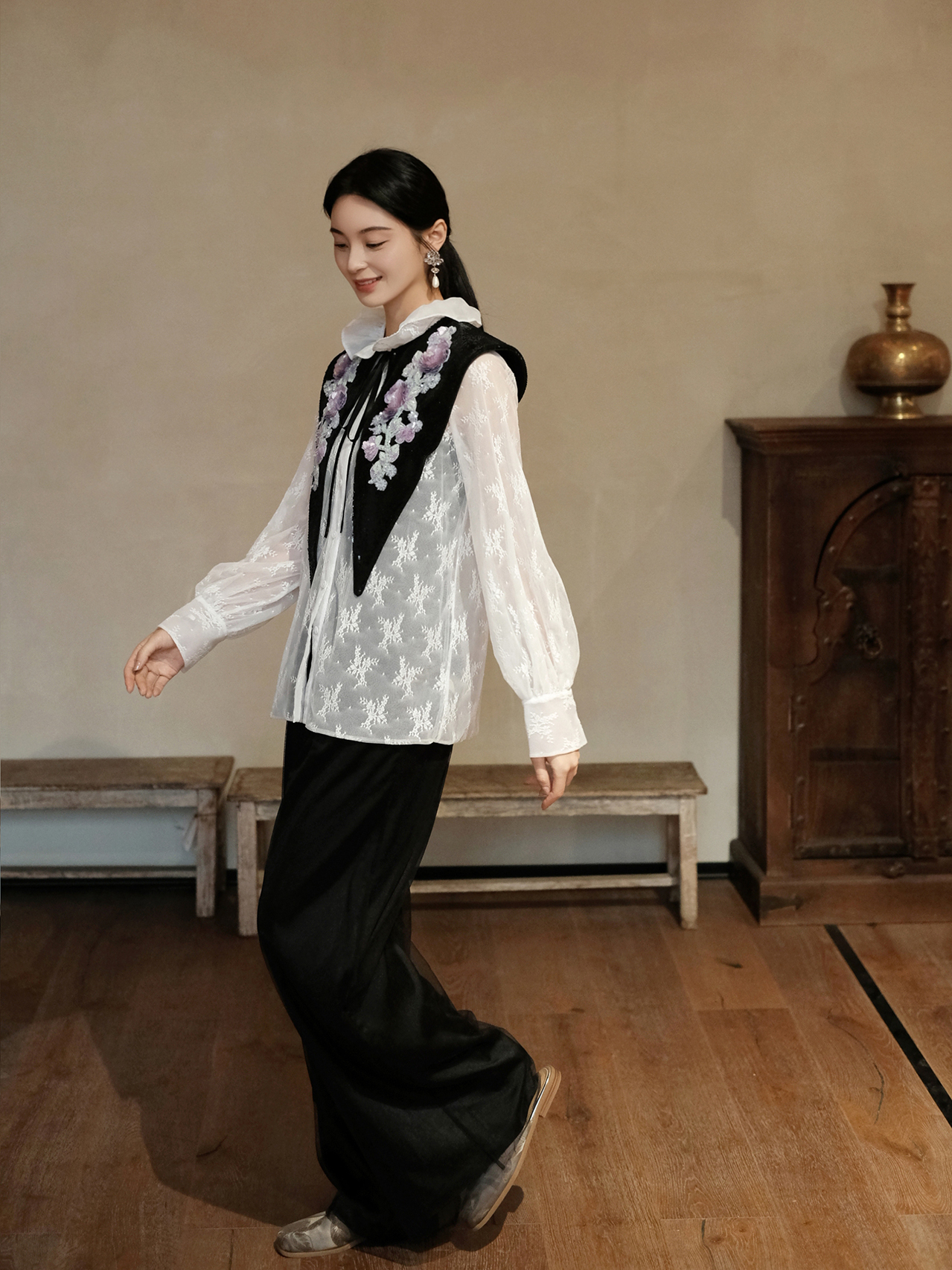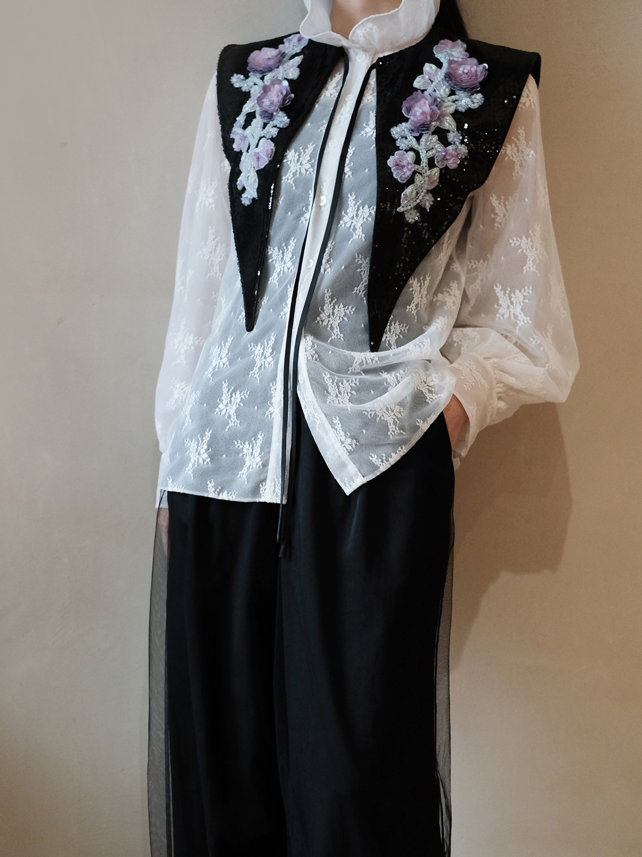 廷前观棠 | 风袂墨黑薄纱长裤