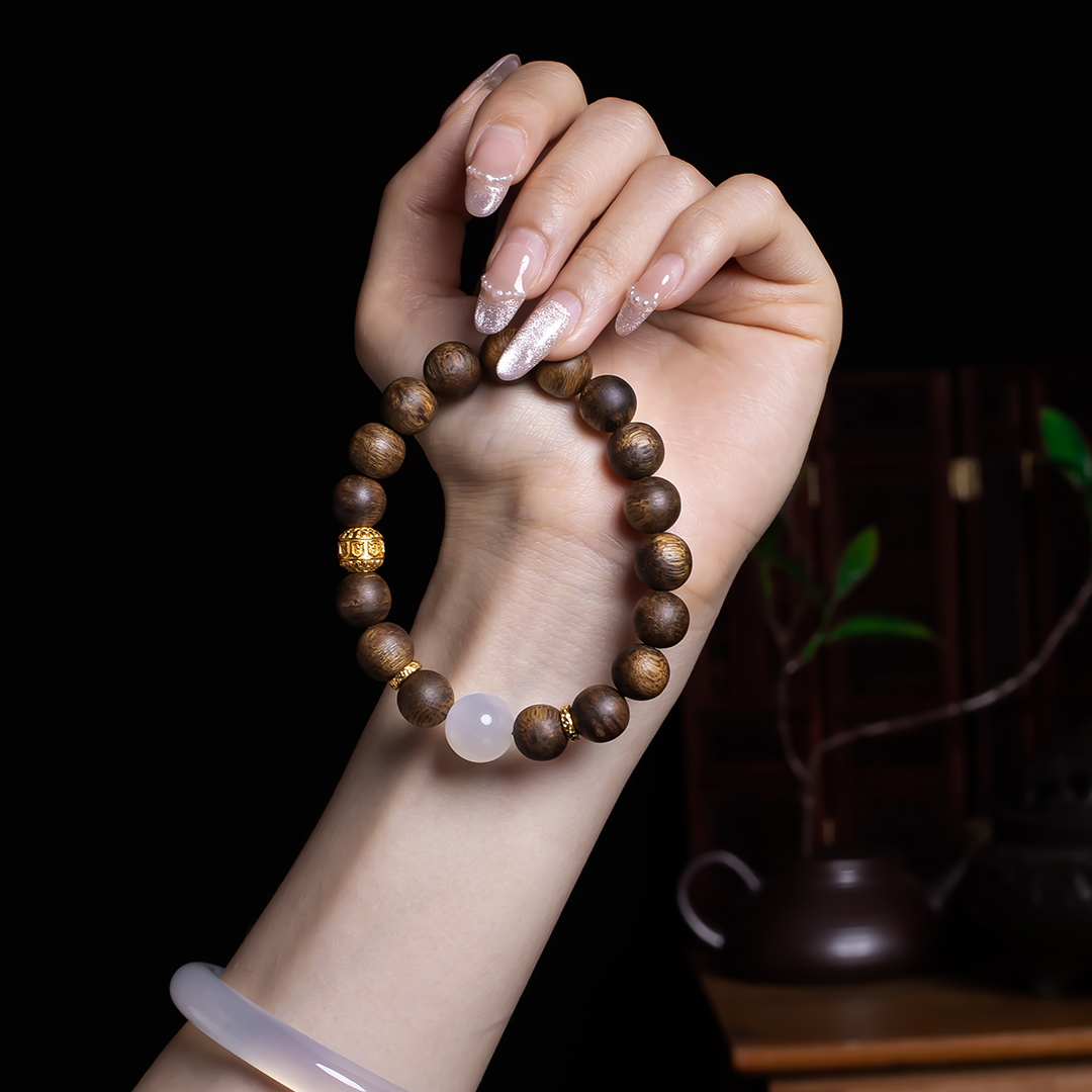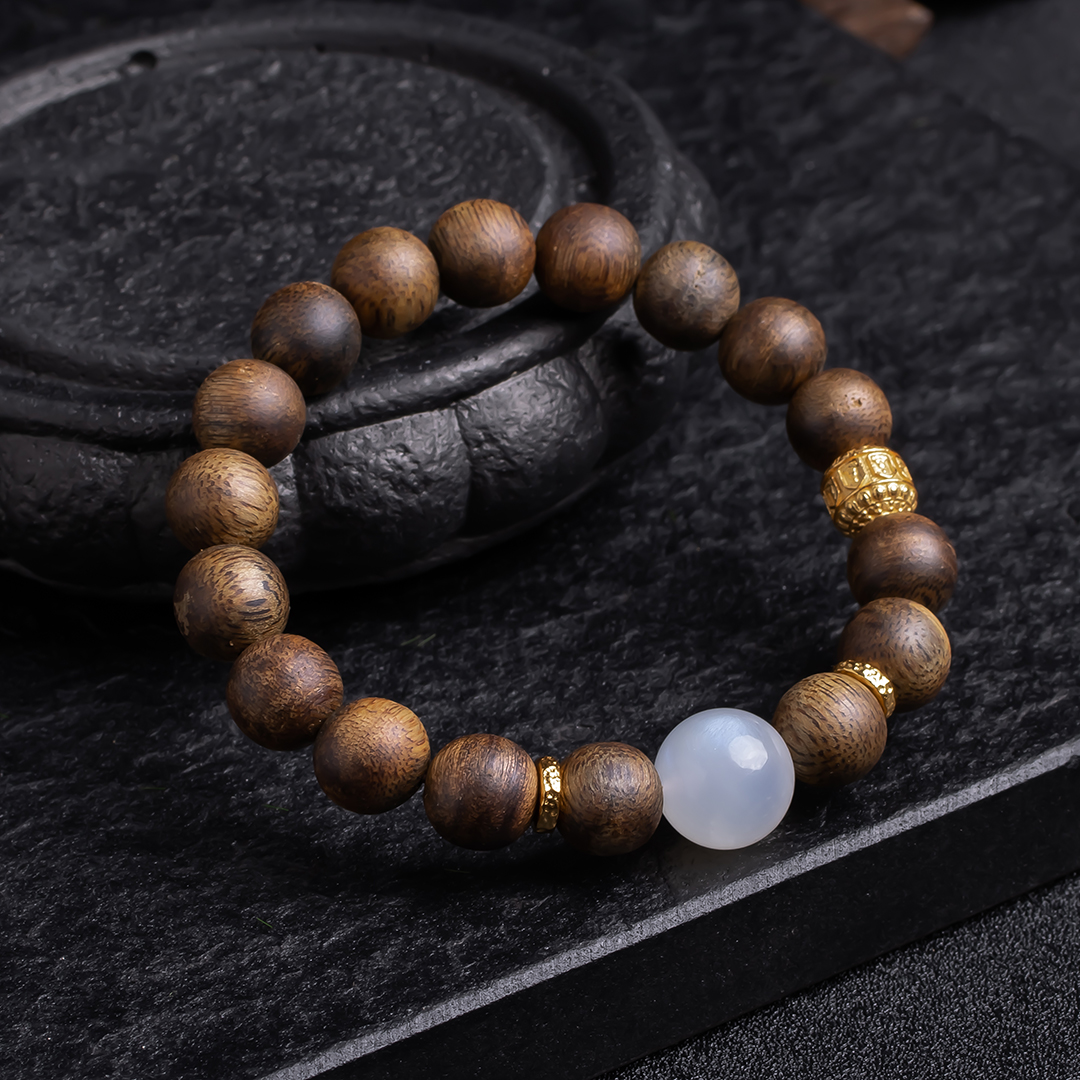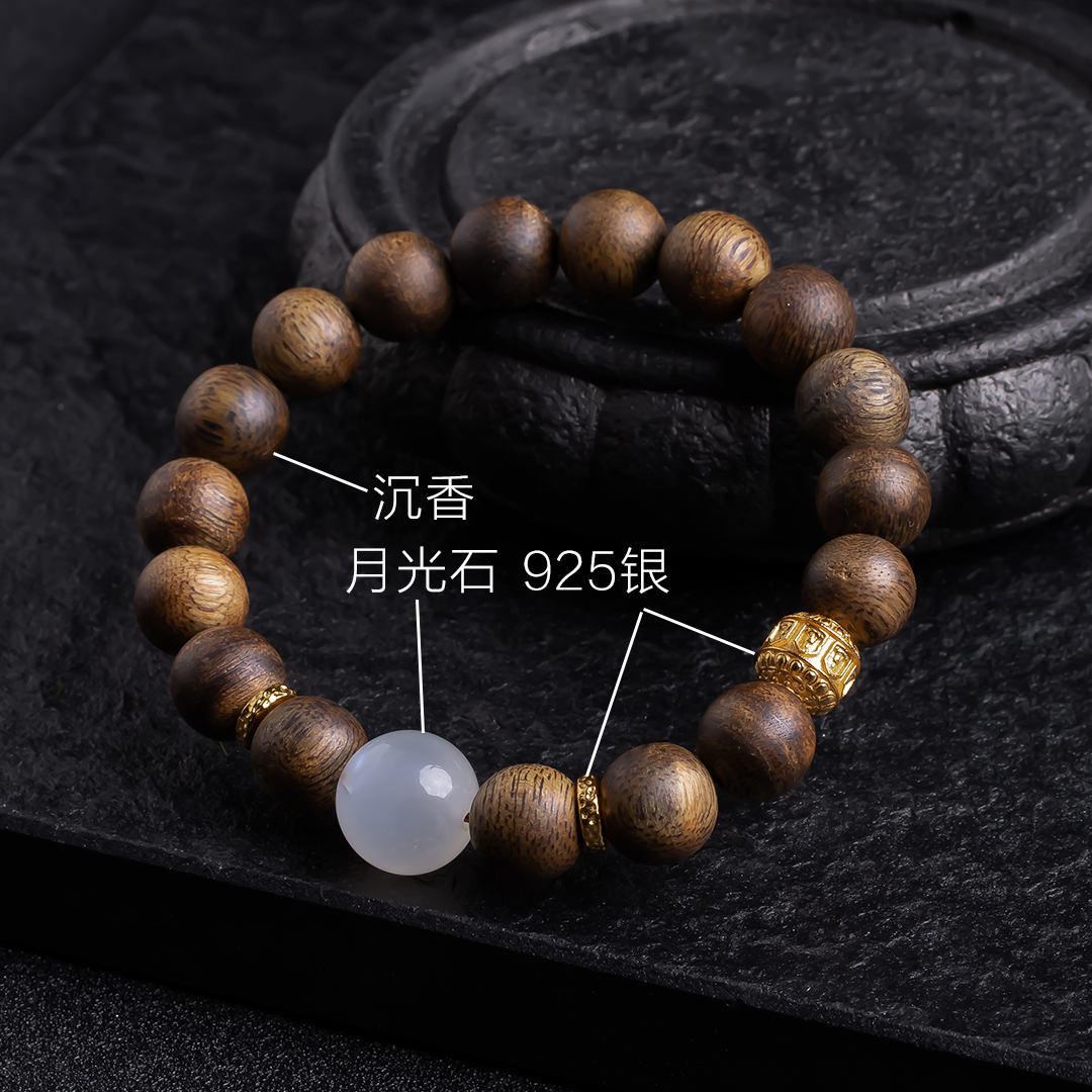 XY0380沉香+月光石素雅手串,天然沉香约10.3mm,原色原味,香味自然清甜,一枚月光石照亮整个手腕,银隔珠搭配,简约素雅,每一次举手,都仿佛带动着一片月光相随于腕间,让人心静神怡,沉香的清甜香气,更让人舒适、减压,养神静气。