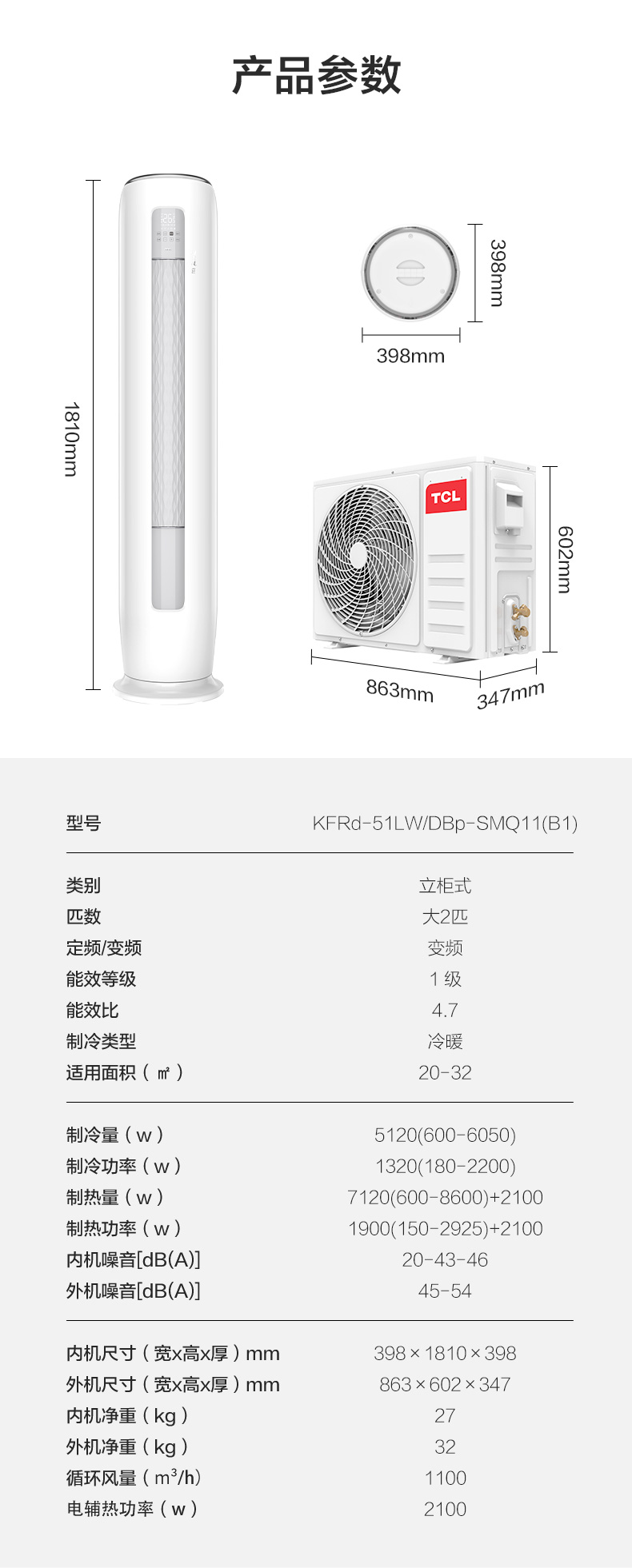 【TCL空调】TCLKFRd-51LW/DBp-SMQ11(B1)大2匹新一级能效柔风变频冷暖空调立式净柔风立柜式空调柜机