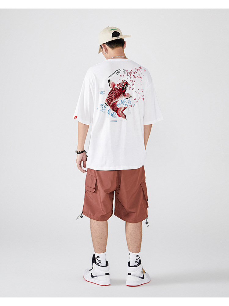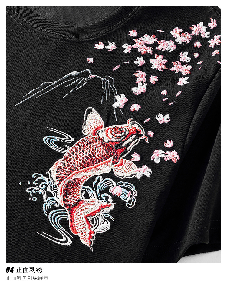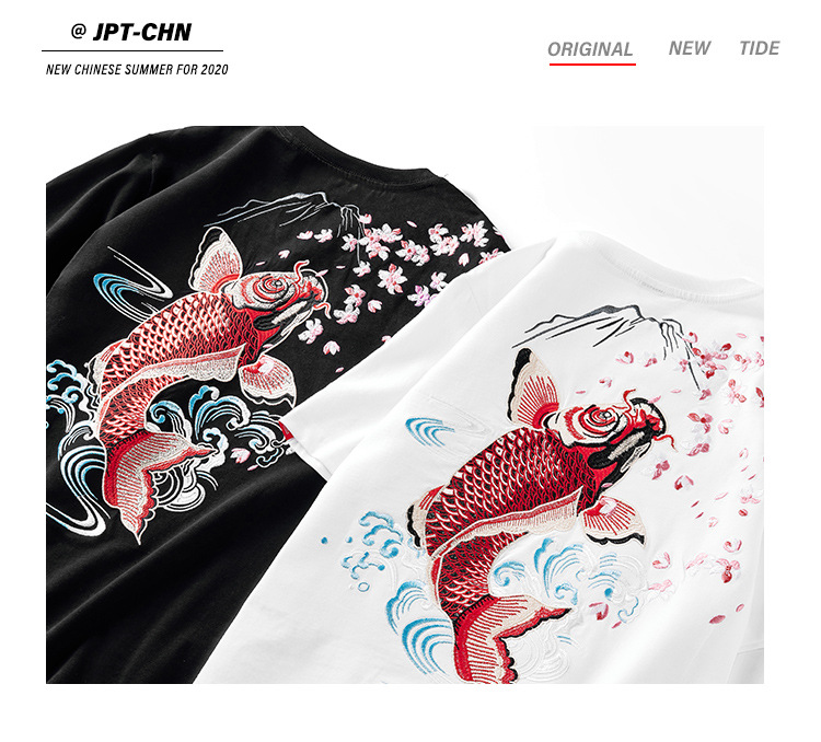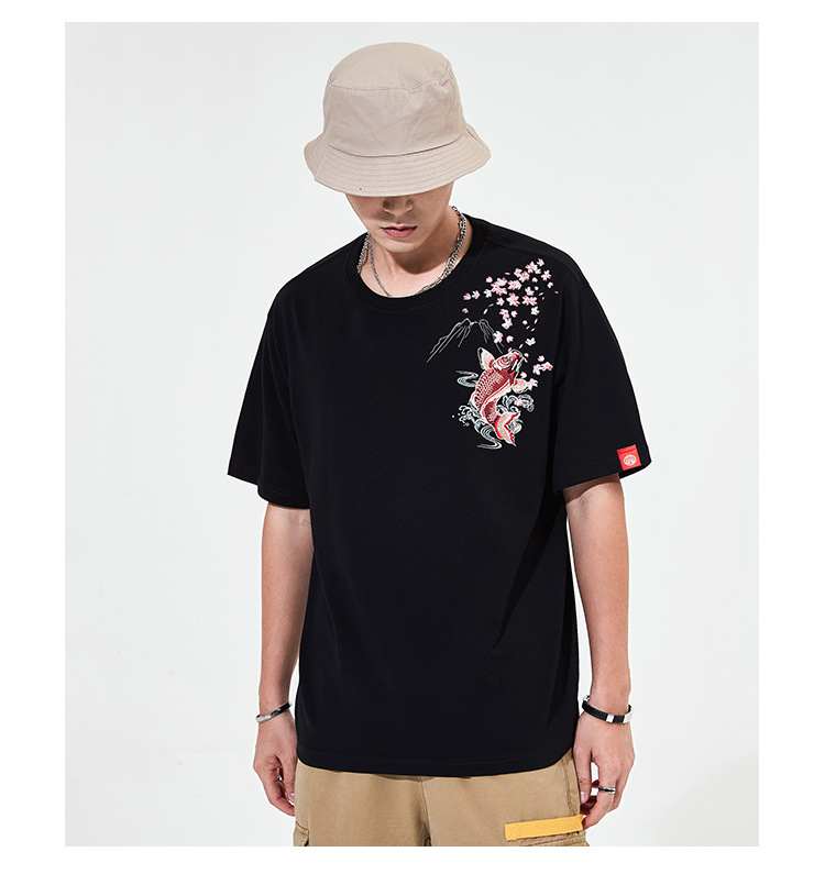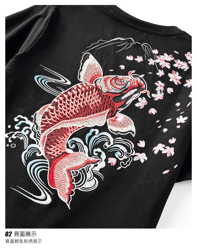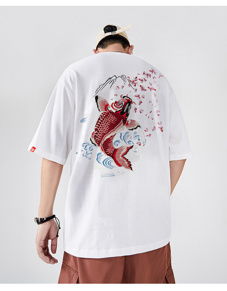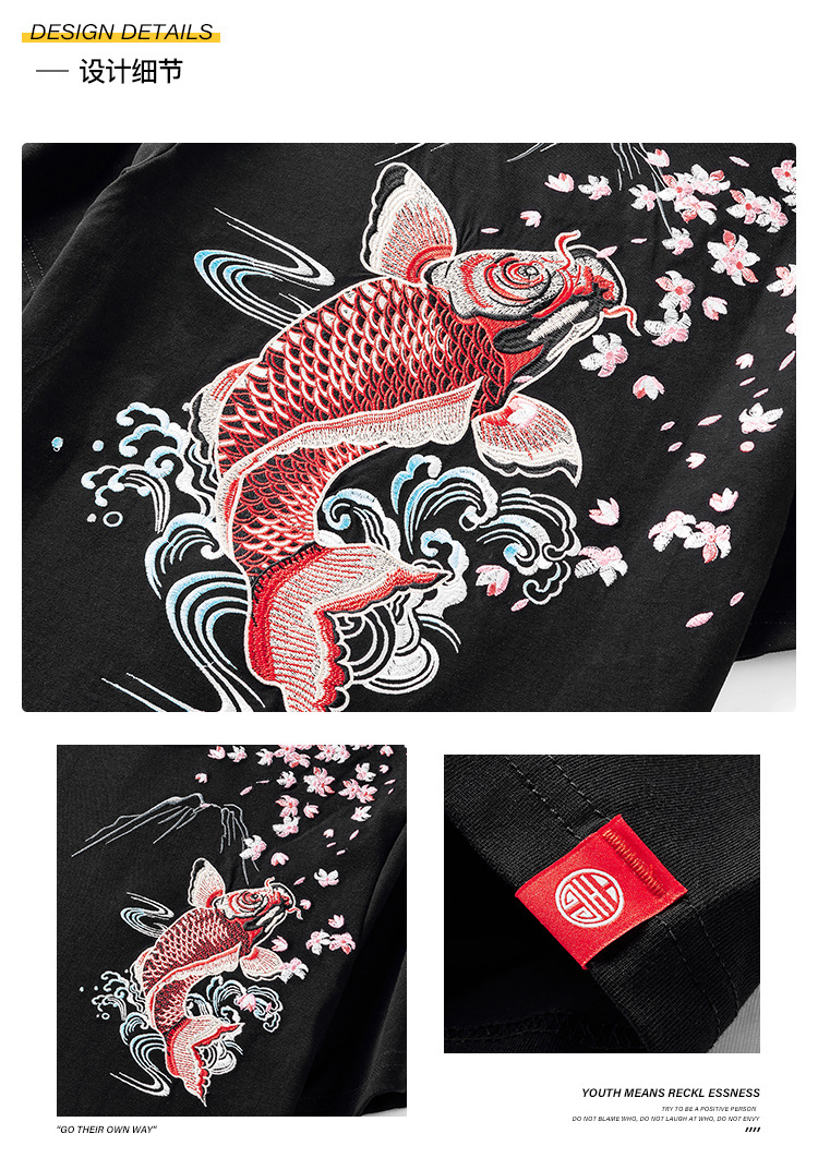 夏季日系潮牌中国风鲤鱼民族风刺绣个性宽松大码短袖t恤衫男纯棉
