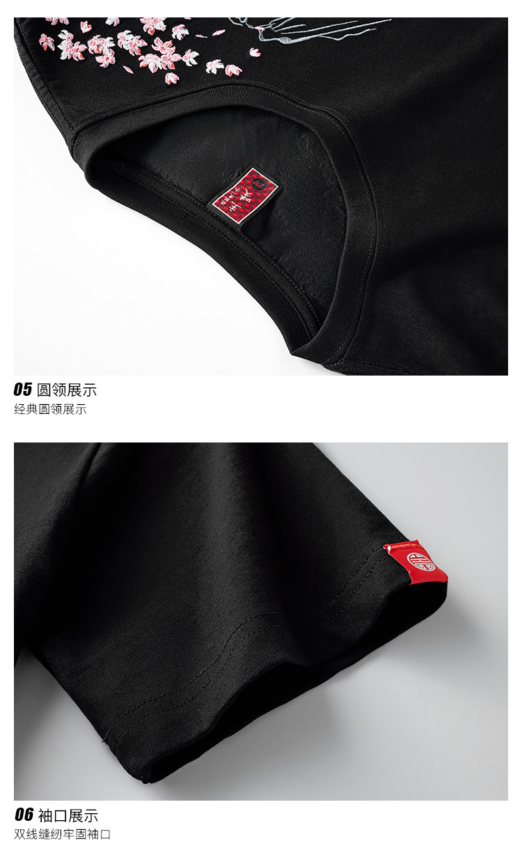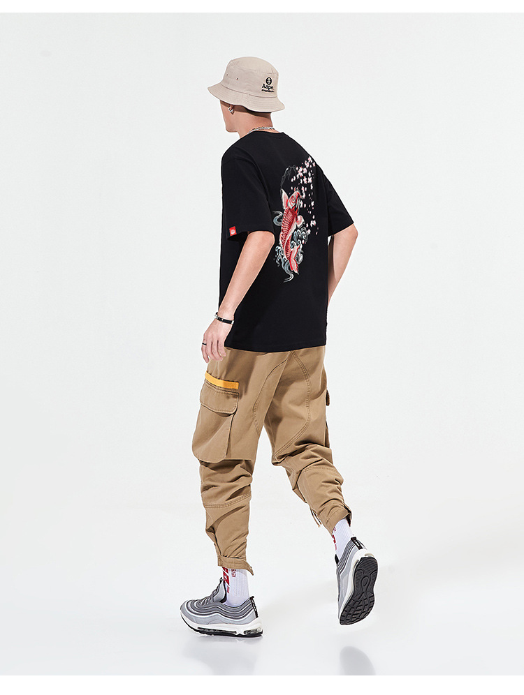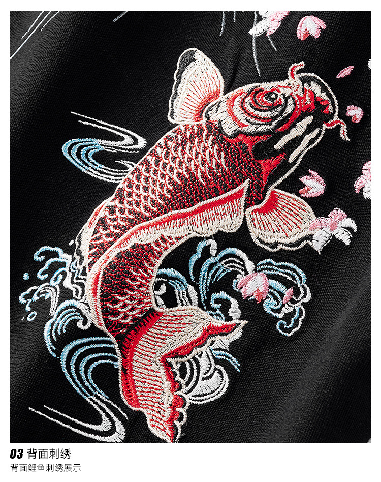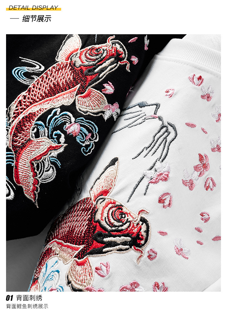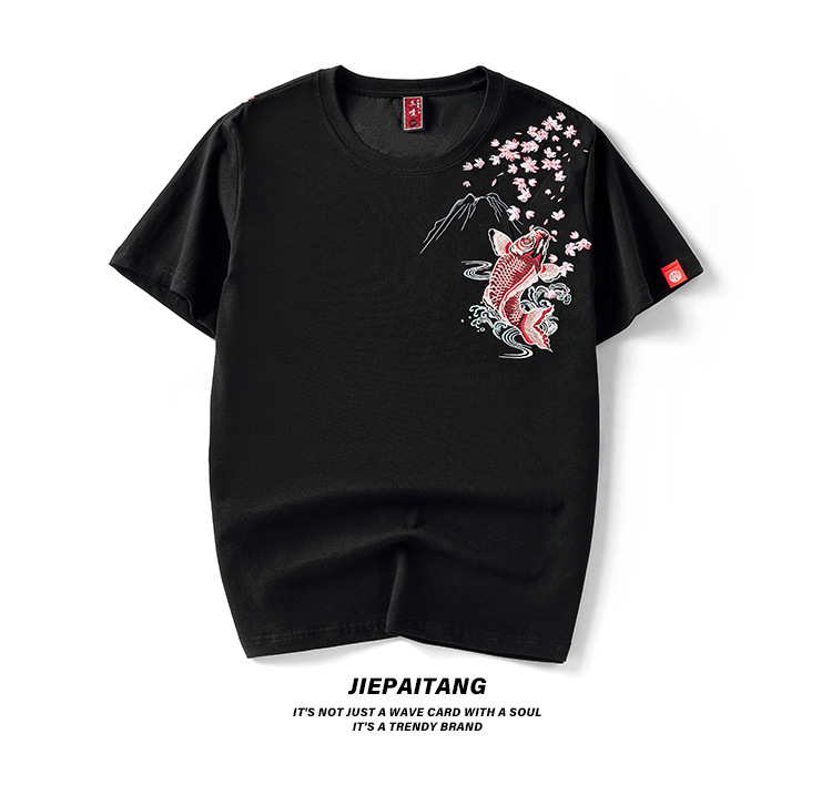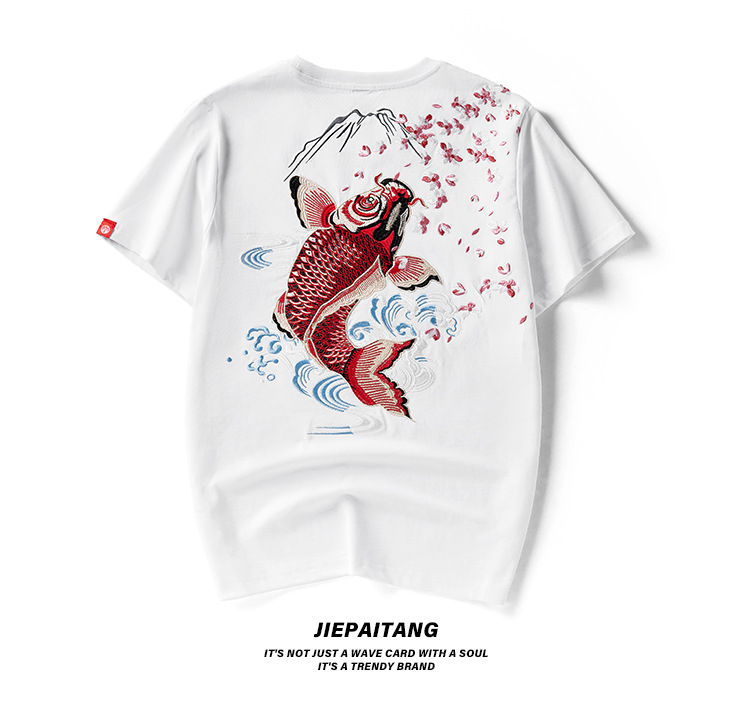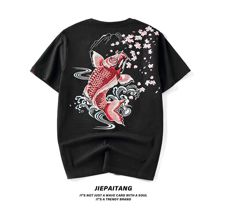 夏季日系潮牌中国风鲤鱼民族风刺绣个性宽松大码短袖t恤衫男纯棉