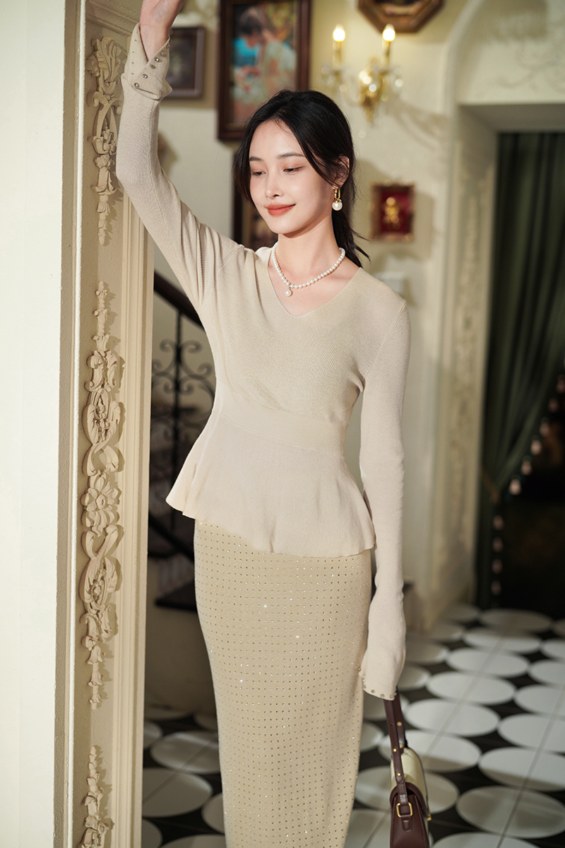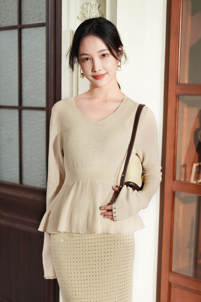 官搭是给大家搭配了一件V领水钻针织衫【温如玉】,同款丝羊绒面料,袖口点缀钉珠水钻,搭配起来整个人低调又华丽~