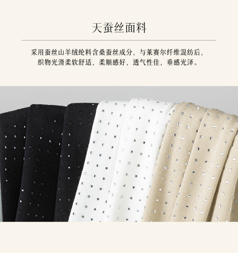 羊绒材质具有良好的保暖性、吸湿性、透气性,与桑蚕丝混纺后更加柔软舒适不扎身