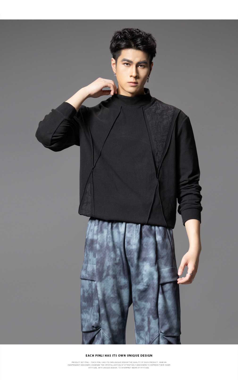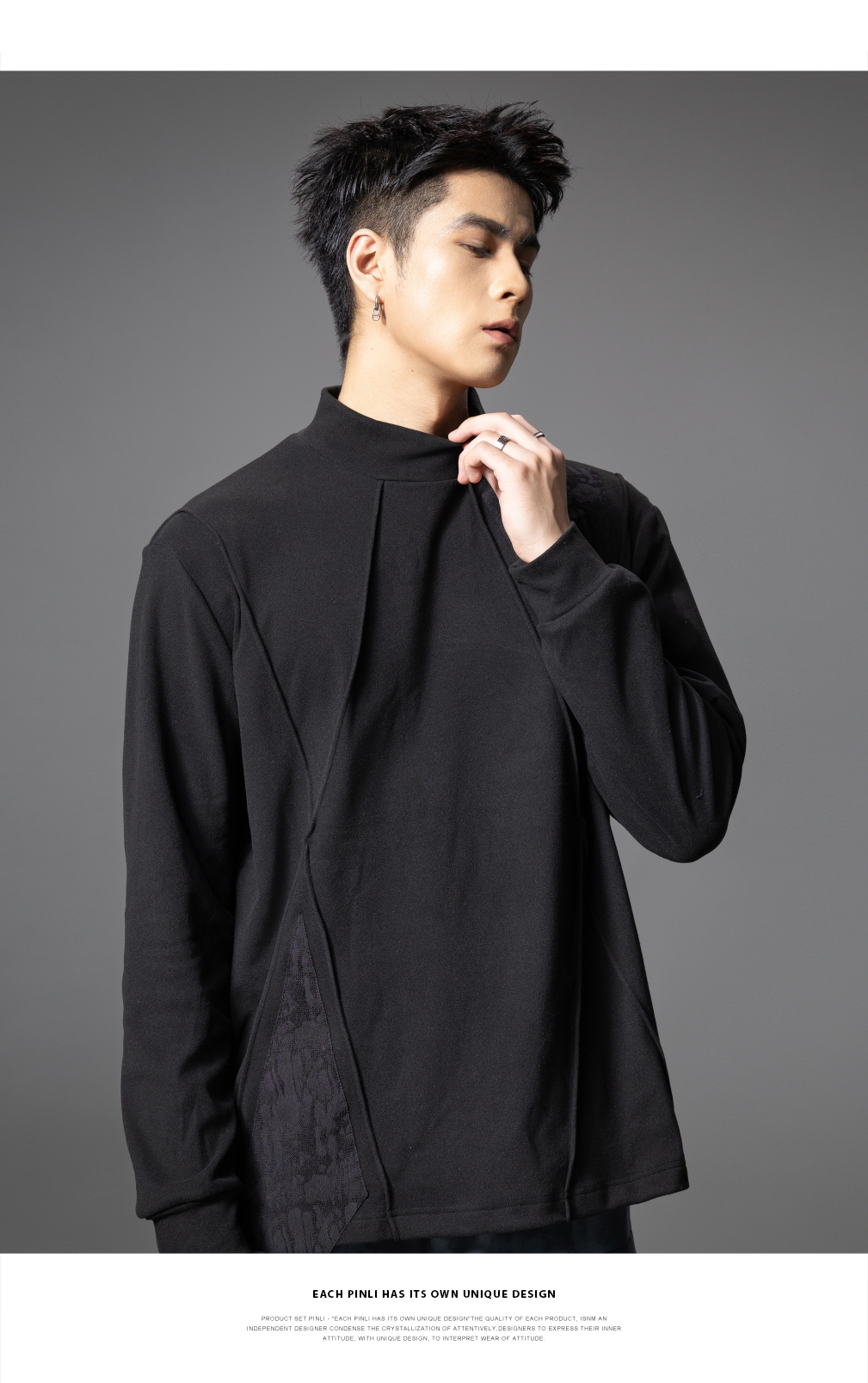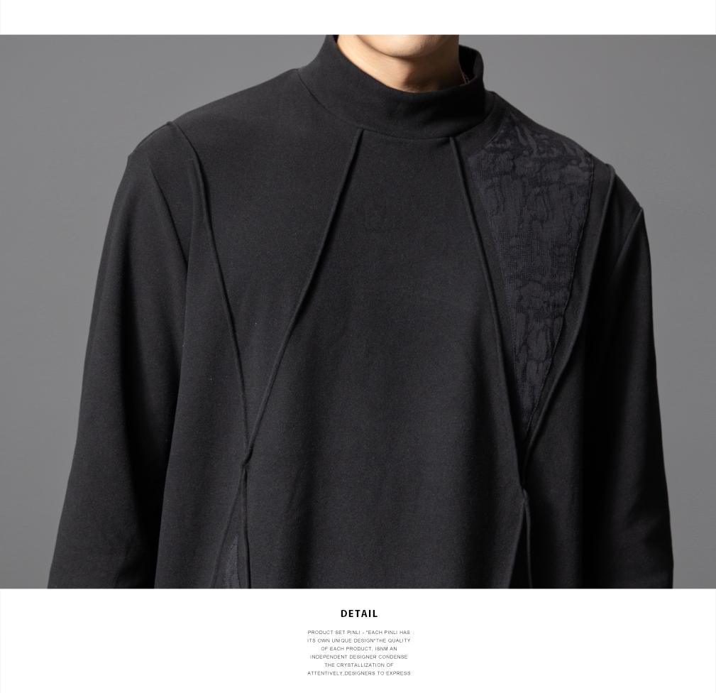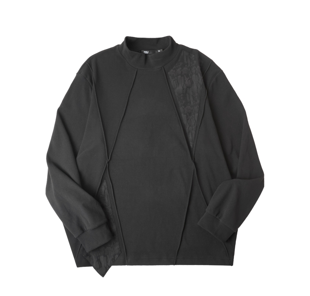 PINLI品立春季新款半高领宽松长袖T恤男潮牌分割设计休闲上衣B253111022