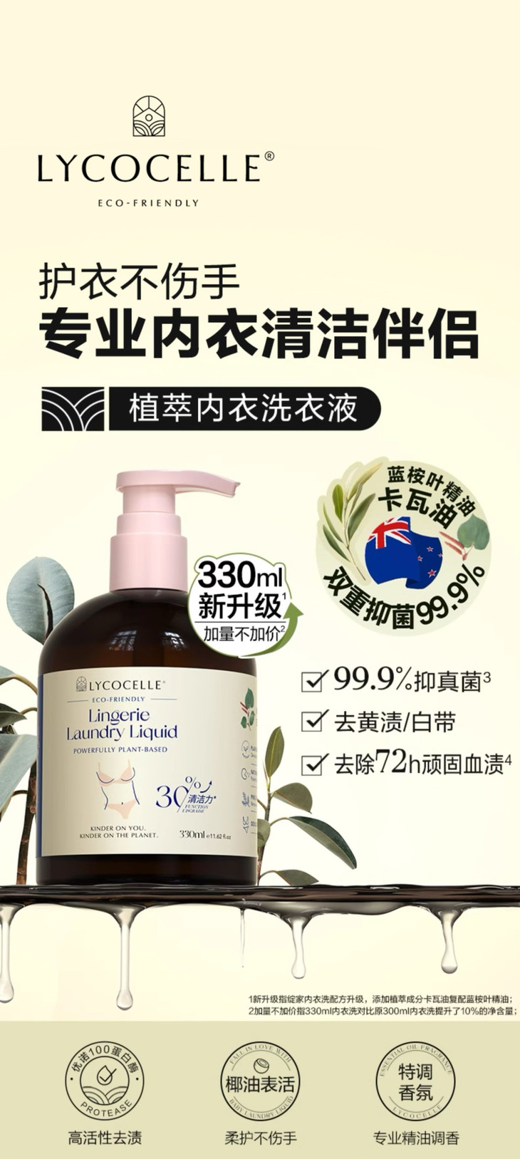 而且内衣洗液是8大无添加:无磷、无氯、无三氯生、无漂白剂、无色素、无荧光剂、无尼泊尔金脂类防腐剂、无矿物油,真的很安全!洗衣液更是得到了新西兰政府银蕨标志的加持,是对其高品质与可靠性的官方认证。此外,湿疹协会的推荐,更是对其温和配方、低刺激性的高度认可,让敏感肌肤也能安心使用!