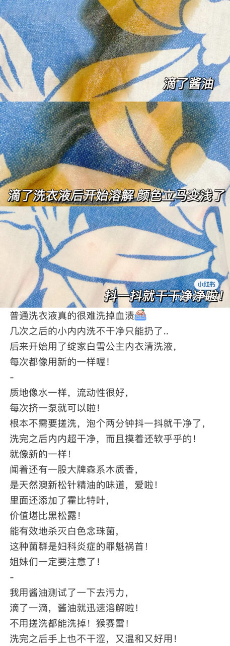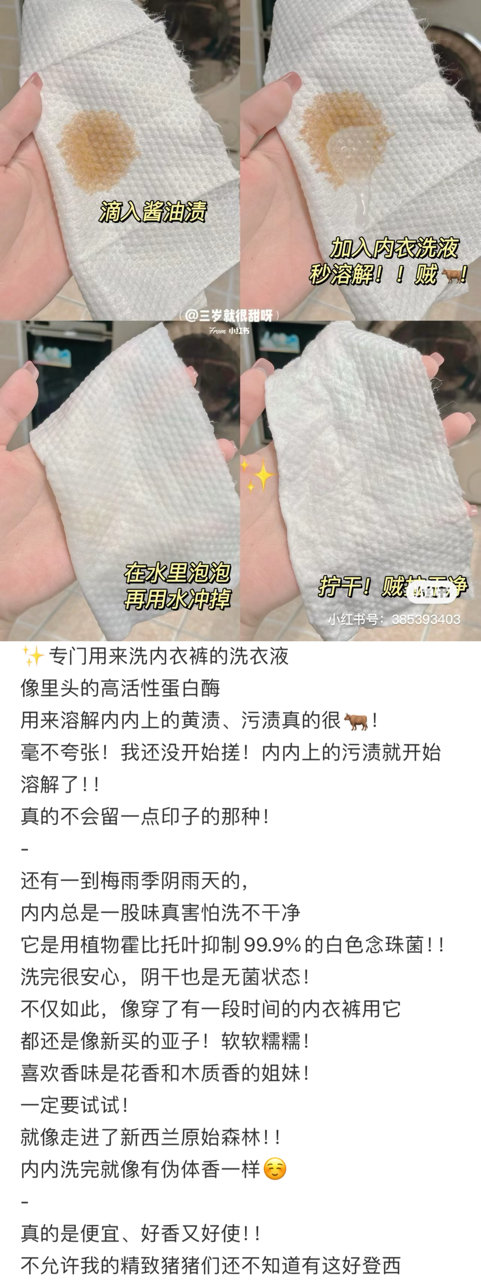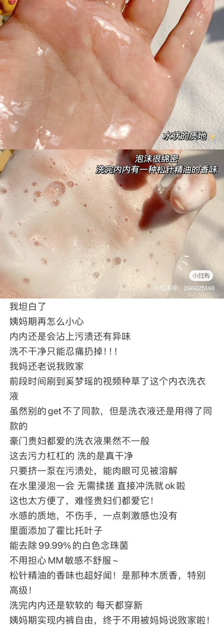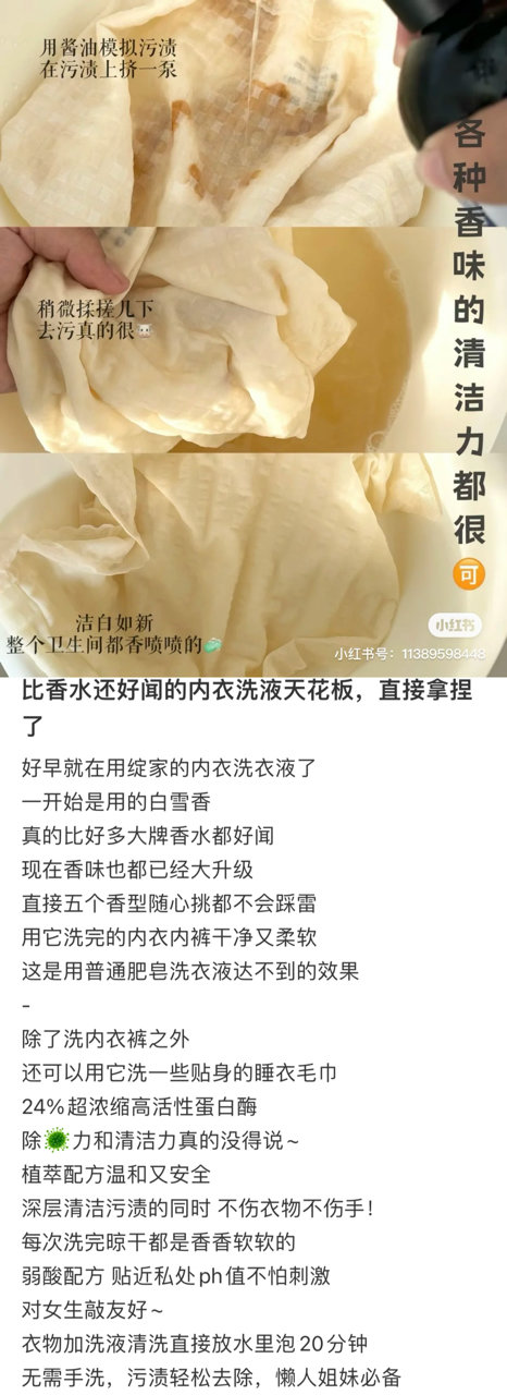 我是真的很推荐,瓶子美美,香味更是从清新自然的山茶黑骑士,到温暖沉醉的檀香雪松七月炉火,再到甜蜜果香的粉红葡萄柚,还有玫瑰、橙花味的爱丽丝和雪松木广藿香,香氛不仅品质上乘,更经过严格的皮肤刺激试验,确保安全无刺激!清洁力也很可,能轻松溶解蛋白类的污渍,姨妈血、黏糊糊的分泌物,轻轻一搓就消失啦,晒干后就能收获一条又香又软的小内内!