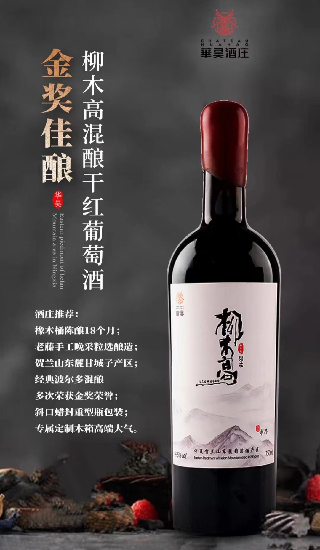 美酒特点:1.橡木桶陈酿18个月、2.老藤手工晚采粒选酿造、3.精品产区:贺兰山东麓甘城子产区、5.经典波尔多混酿,酒精度14.5%vol、6.多次荣获金奖荣誉、7.酒标中国风,山水画为主、8.斜口蜡封重型瓶包装、8.专属定制木箱高端大气。