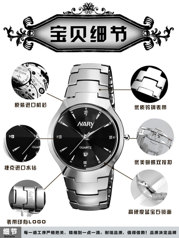 NARY/耐瑞 全自动石英非机械手表 男女镶钻钨钢带情侣表