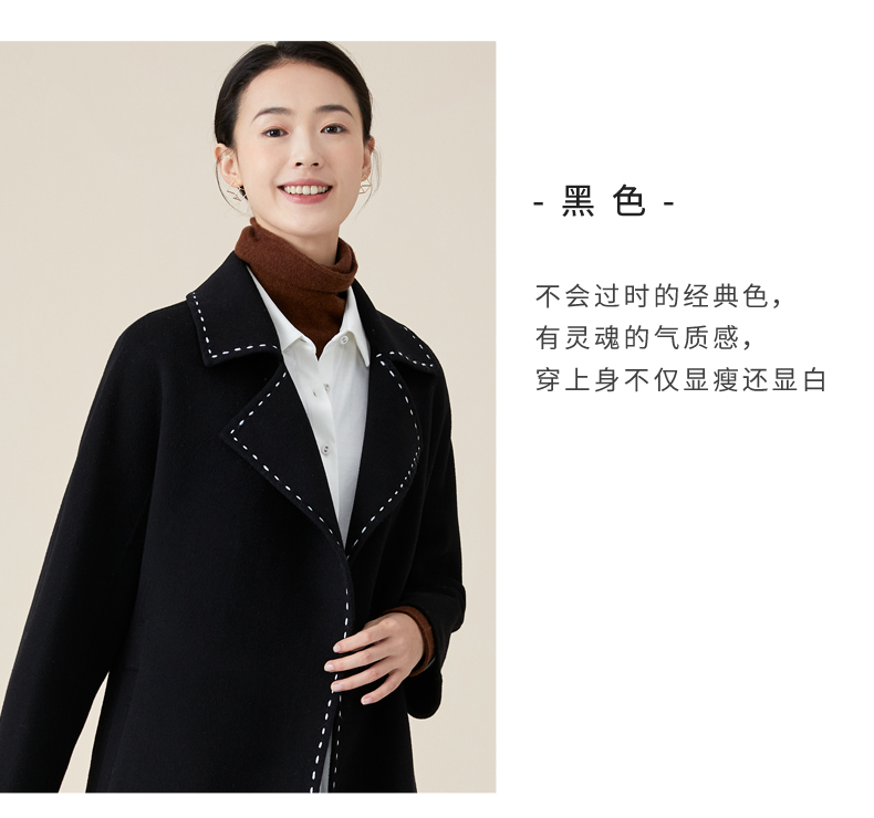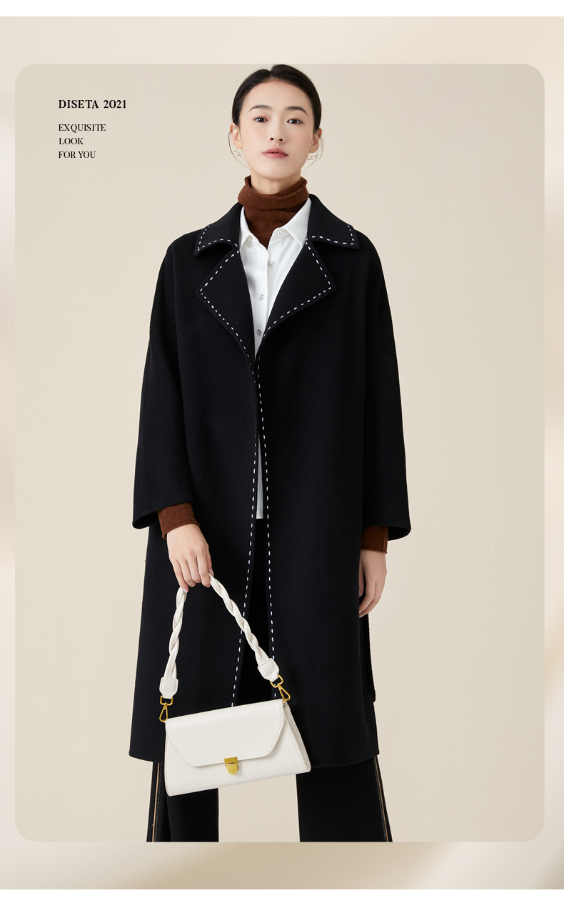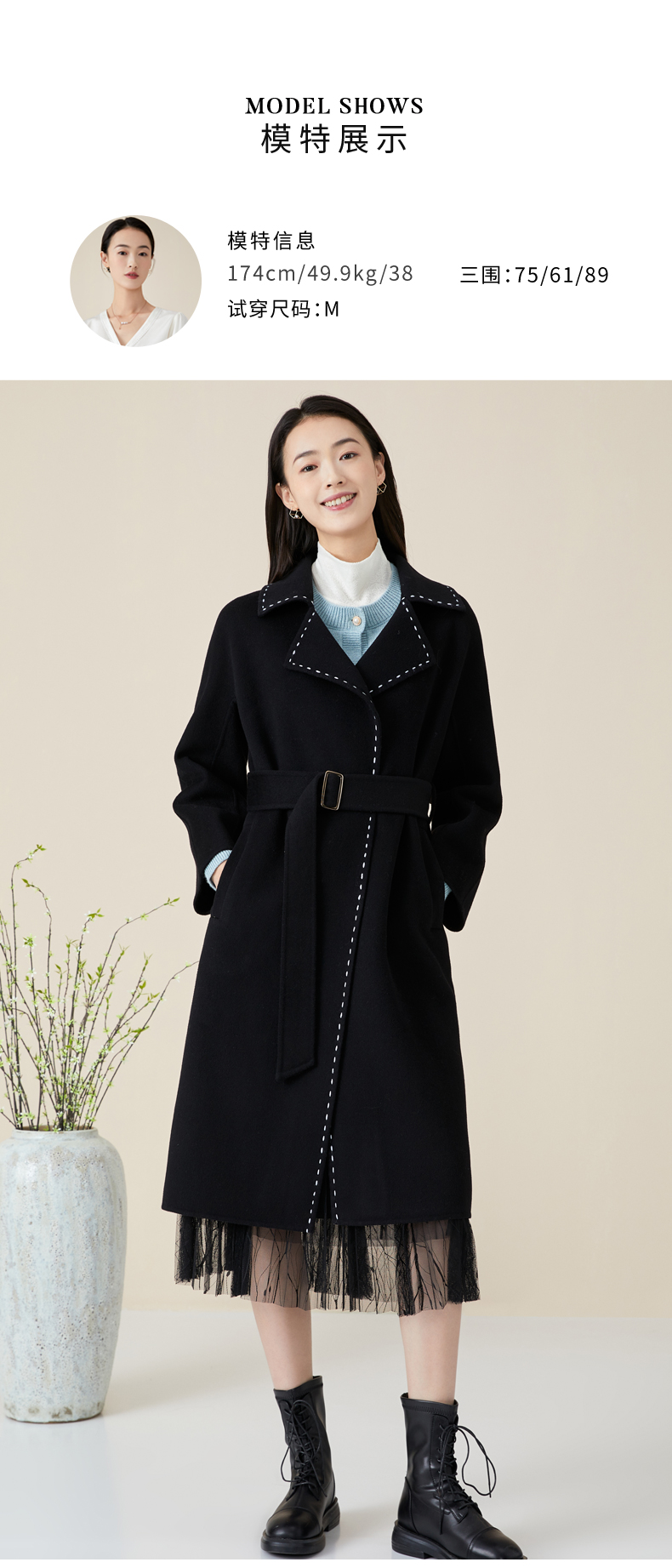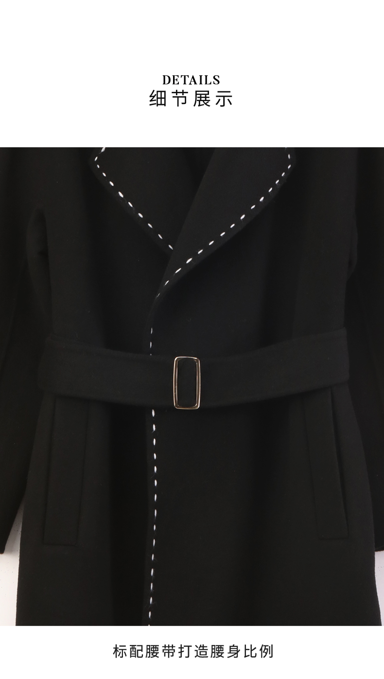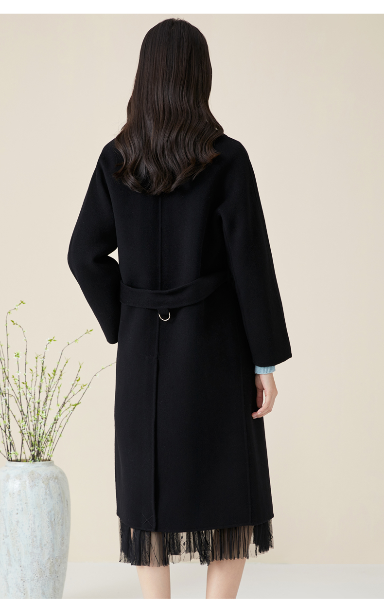 玳莎翻领双面呢大衣女新款冬季黑色收腰宽松中长款毛呢外套 BD39301