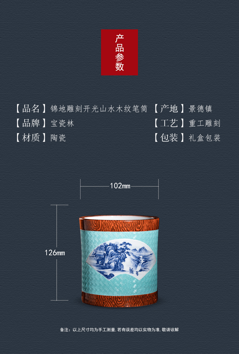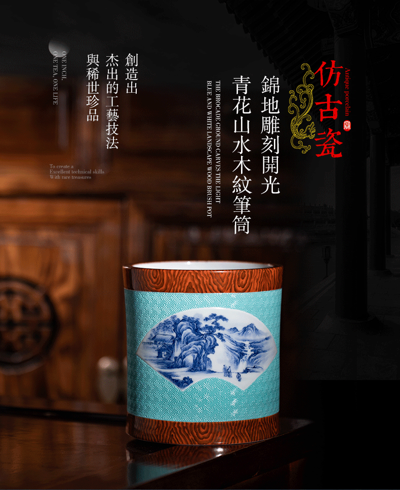 锦地雕刻开光青花山水木纹笔筒