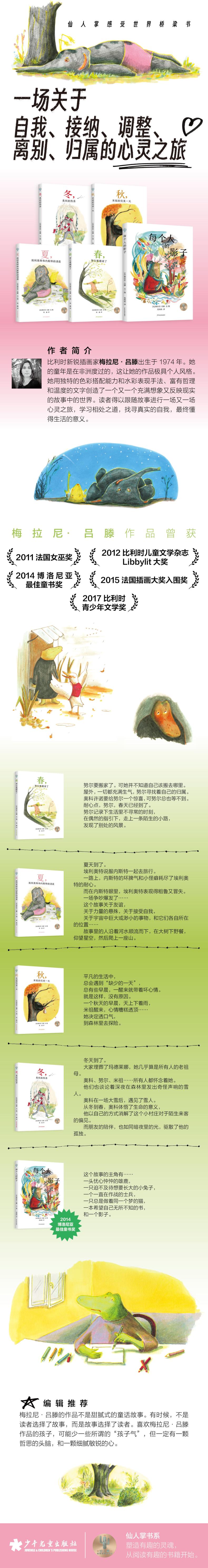 《每个人的影子》曾获得2014年博洛尼亚很好童书奖,它如梦似幻的水彩画风得到了评委们一致的青睐。这是一个充满隐喻的故事。忧心忡忡的雄鹿代表家长。渴望长大的小兔子代表孩子。作战的士兵,代表离异家庭的孩子,内心充满创伤,用愤怒和敌意包裹自己。总是做同一个梦的猫,代表一个逐梦的人。希望自己无所不知的书,代表一个有求知欲的人。而影子,则代表守护者。这个守护者可以指某个个体,也可以指整个社会里善意的群体。他们在故事中相遇,也在故事中成长、改变、释怀,梦到梦的结局,解开系上的结。
