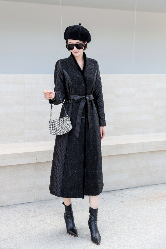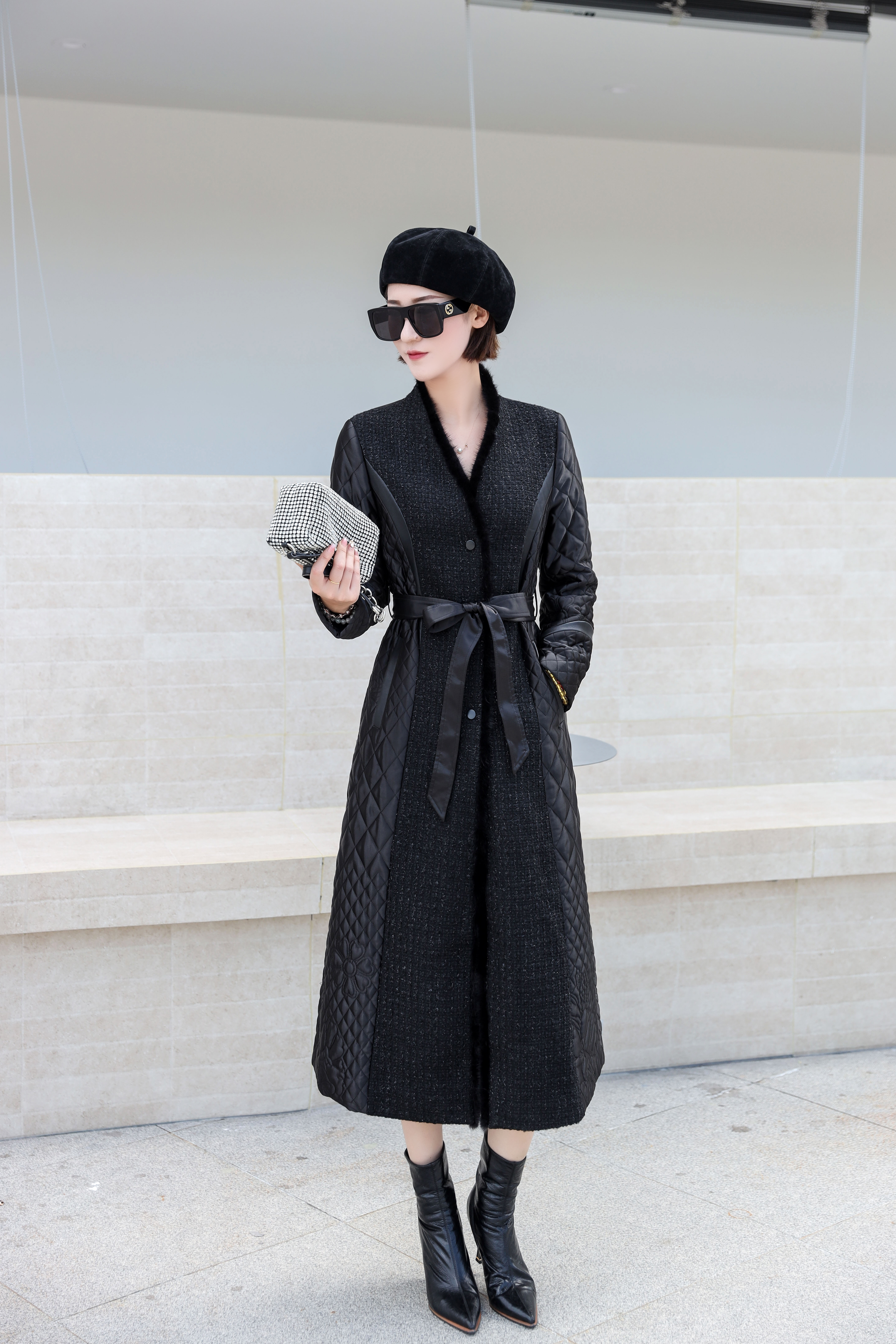 SZ6C17_漆黑色_大衣_冬季_V领毛绒滚边粗花呢菱格绗缝拼接收腰长款_高级女装_BERNIEELEN 伯妮斯茵