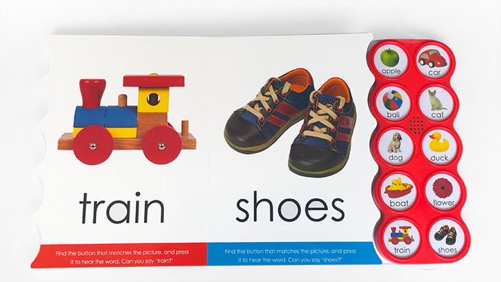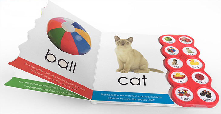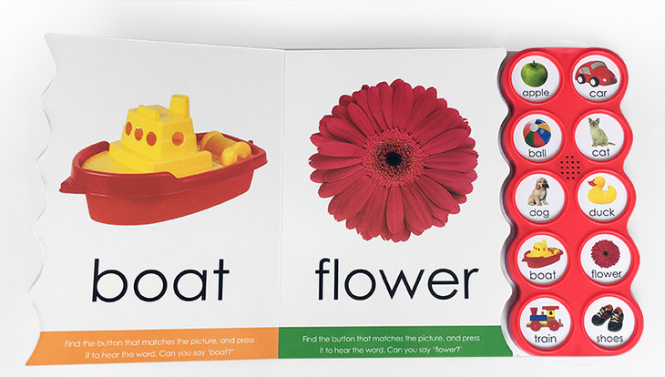 在这本书中,孩子们可以透过互动式触压按钮学习,每个按钮上都有一张可爱的图片,只要按下去,书体就会发出清晰声音,念出图片上的物品名称,帮助孩子自然学习玩具、动物、数字或是生活中其他常见物品的名称,扩充基本语汇量与数数字的能力,充分满足他们探索世界的欲望;