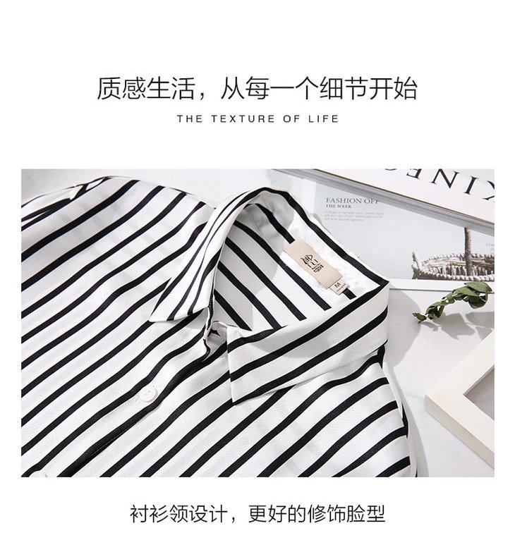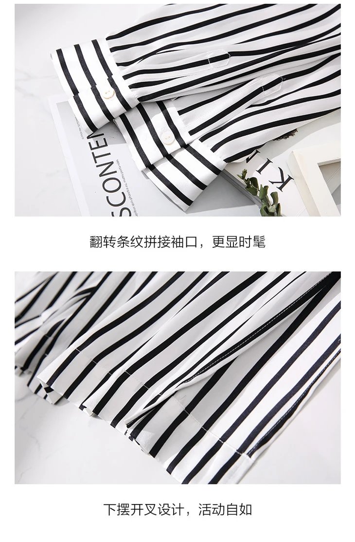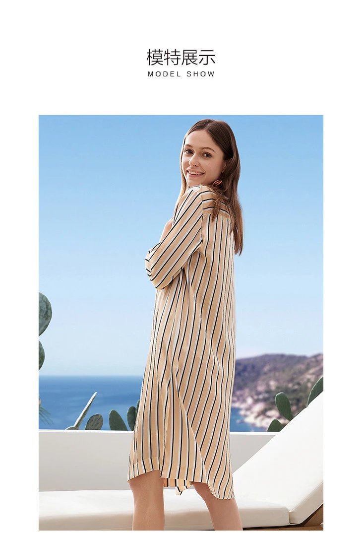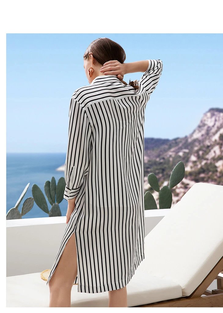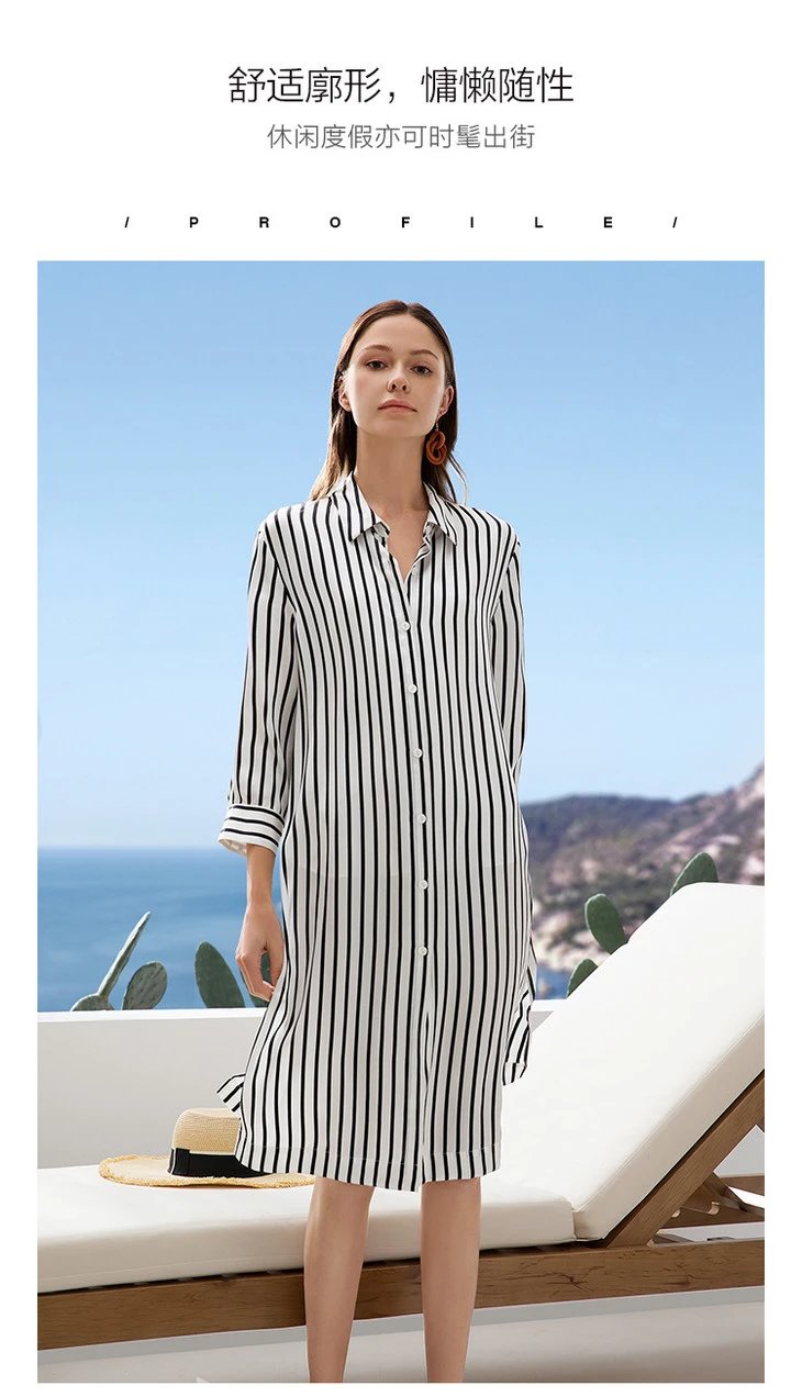 金三塔条纹真丝衬衫式睡衣女长款100%桑蚕丝性感可外穿家居服睡裙 YSF9B303