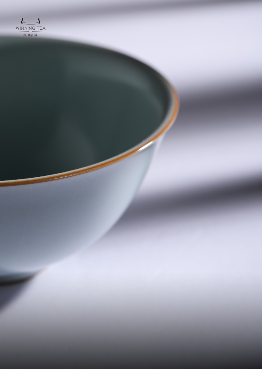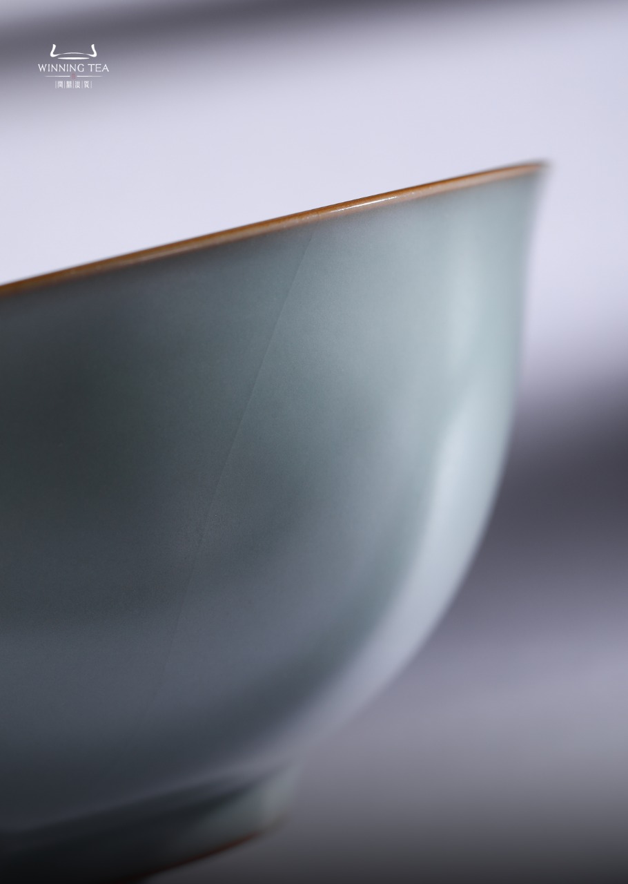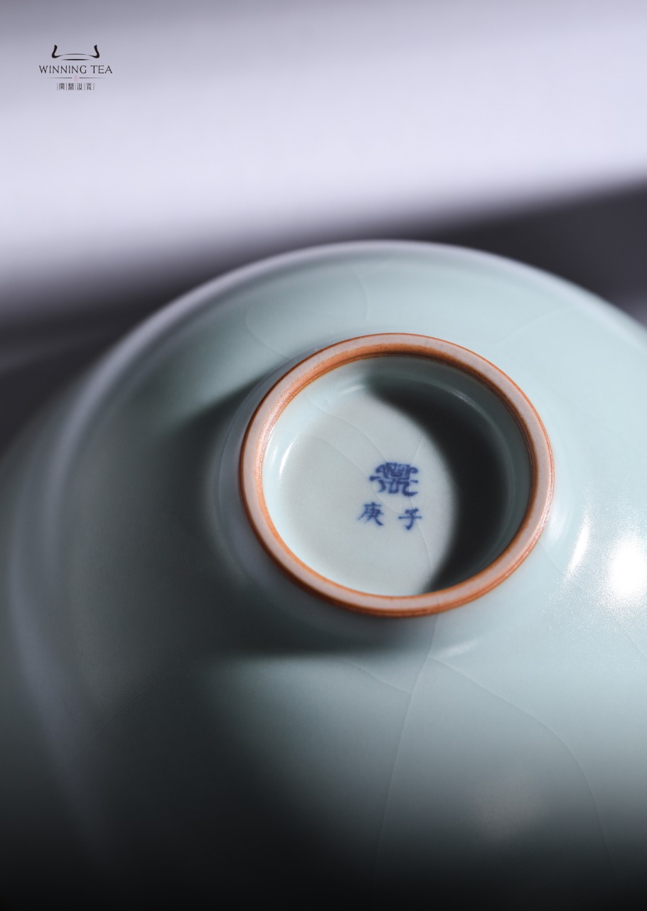 问鼎汝瓷鼎峰柴窑月白观月杯(梵红描金狮子绣球)
